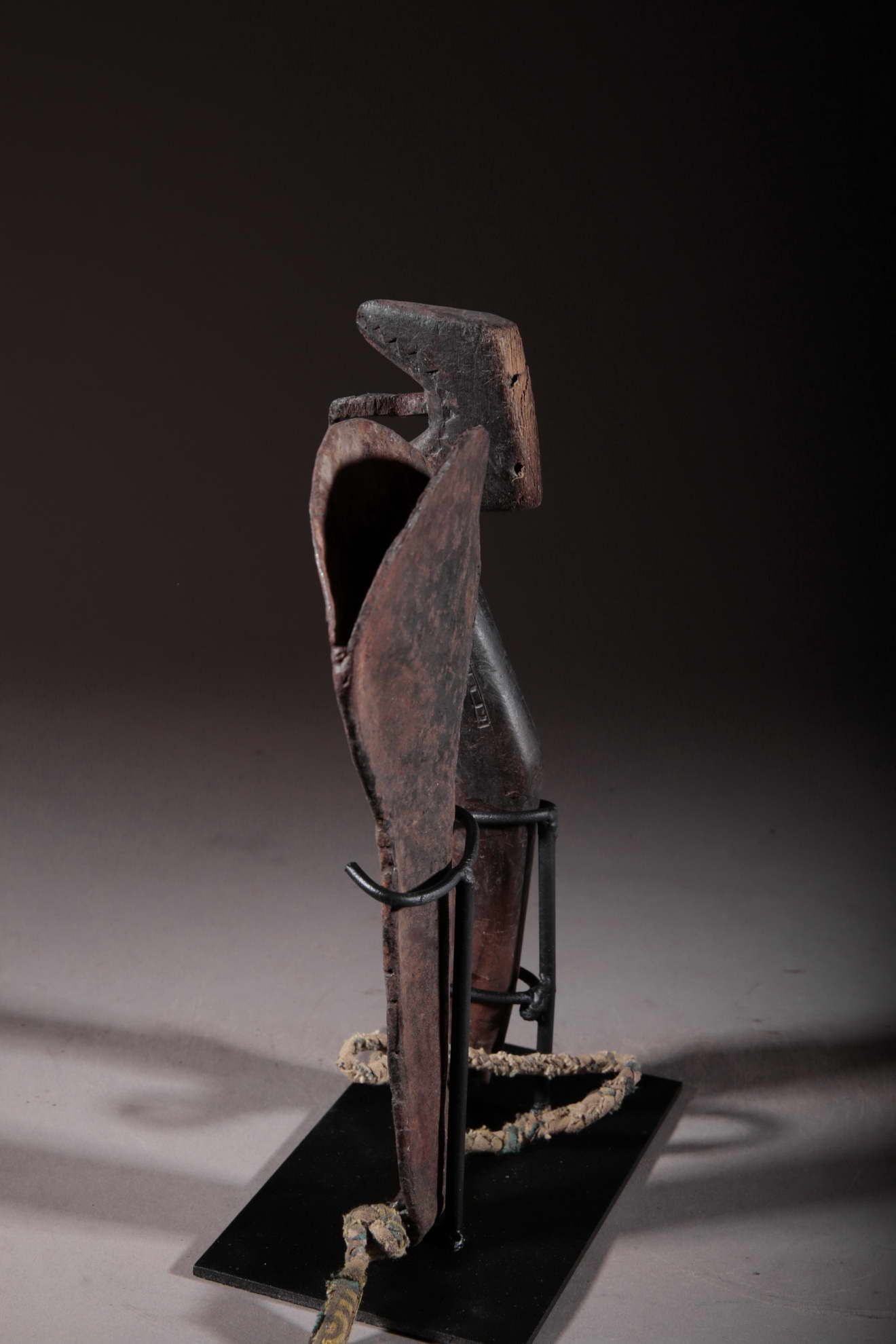 Chez les Baoule, il existe plusieurs techniques de divination, certaines simples par le matériel employé, bien que complexes pour l’analyse, comme le « jet de lacets ». Mais, sur le plan de la théâtralité et de la création plastique, la plus spectaculaire fait intervenir des devins-danseurs, les komyenfwé, qui, possédés par des génies de la nature, servent d’intermédiaires entre les esprits et le monde du village. On les appelle aussi awèfwè (« êtres des frontières », celles qui séparent le visible de l’invisible). Lors de leurs cérémonies de transes, quand les esprits qui les investissent parlent par leur entremise, ils se servent d’instruments rituels, plats en terre, hochets en forme de gourde, et surtout gongs de métal qu’ils frappent pour « réveiller » les génies, les faire surgir de la brousse et de leur torpeur, à l’aide, miracle de l’art, d’un marteau en bois décoré. Ces objets sont nommés lawlé waka. Plus le devin est réputé, plus son matériel religieux est ouvragé, comme en témoignent certains objets qui ont appartenu à des collections occidentales, notamment le marteau de l’ancienne collection d’Helena Rubinstein, qui, j’en suis persuadé, est le plus éblouissant de tous ceux que j’ai pu voir, en trente ans de fréquentation du peuple baule. Est-ce pour faire oublier que cette pièce reste un simple instrument de percussion ? En fait, loin d’être surajoutée à la partie fonctionnelle, la figure est insérée, en une évidence plastique. Son hiératisme, très relatif, s’harmonise avec le demi-cercle du heurtoir à l’intérieur duquel elle s’inscrit, mais aussi avec les torsades de la poignée au sommet de laquelle elle se dresse, souveraine, comme sur un piédestal, comme pour mieux se dégager de la spirale qui l’entraîne, avec un étagement des plans qui mène graduellement le regard vers la figure sommitale.