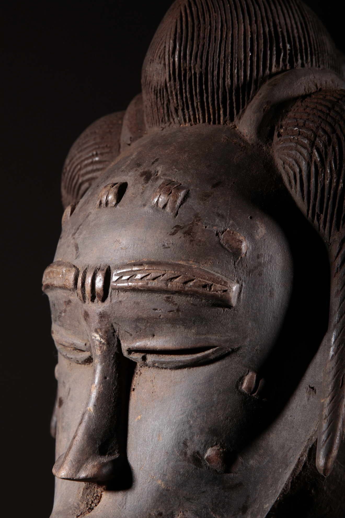 Les Baoulé possèdent des masques, sans doute, sous l’influence de leurs voisins Gouro ou Sénoufo. Il existe des masques Baoulé d’ancêtres mais qui maintenant ont un rôle laïc et apparaissent lors de danses de divertissements. Ces portraits possèdent les mêmes caractéristiques que la statuaire : élégants, sculptés finement et polis. Ils montrent une grande diversité régionale dans les coiffures et les tatouages. . Le masque Baoulé double représente le mariage du soleil et de la lune ou des jumeaux dont la naissance est toujours un bon signe.