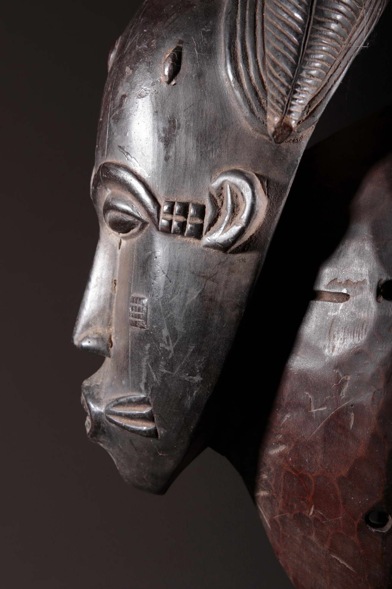 Les Baoulé possèdent des masques, sans doute, sous l’influence de leurs voisins Gouro ou Sénoufo. Il existe des masques Baoulé d’ancêtres mais qui maintenant ont un rôle laïc et apparaissent lors de danses de divertissements. Ces portraits possèdent les mêmes caractéristiques que la statuaire : élégants, sculptés finement et polis. Ils montrent une grande diversité régionale dans les coiffures et les tatouages. . Le masque Baoulé double représente le mariage du soleil et de la lune ou des jumeaux dont la naissance est toujours un bon signe.