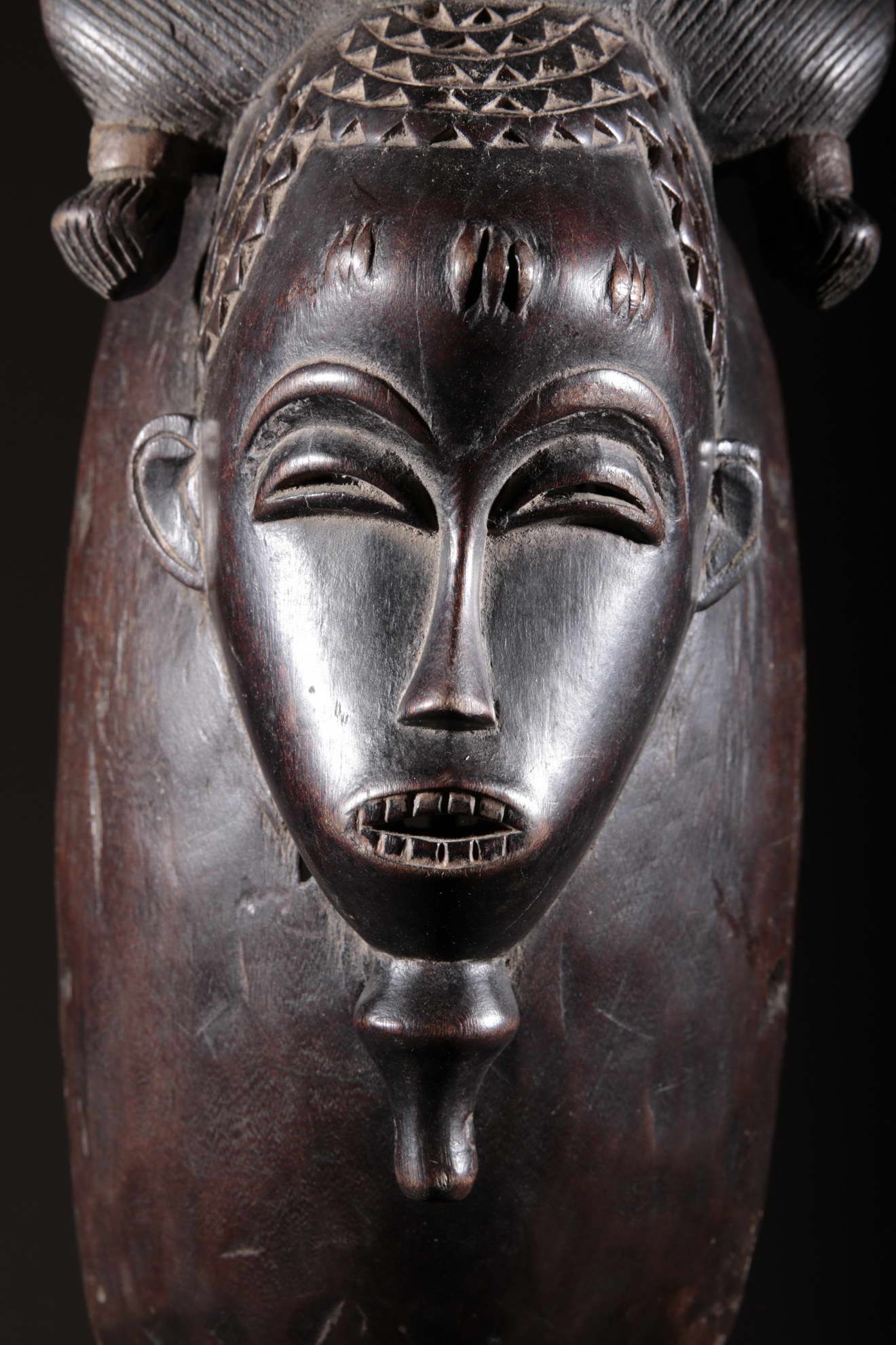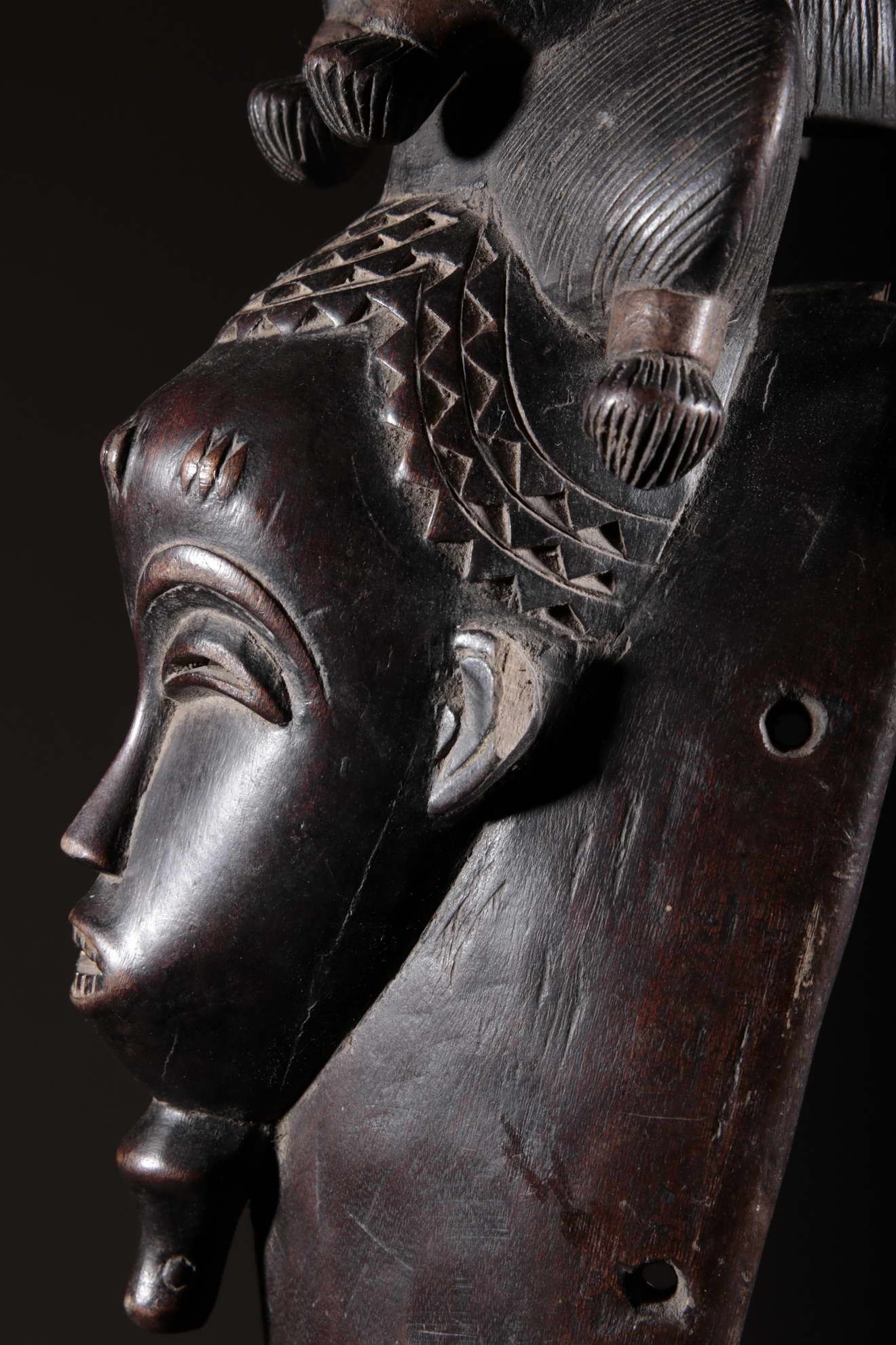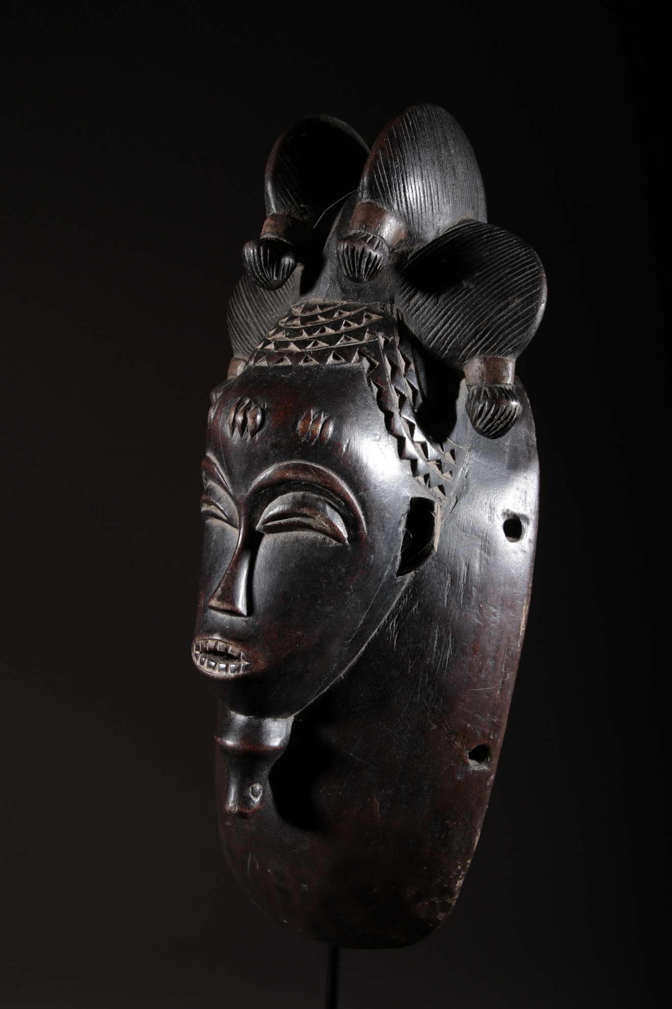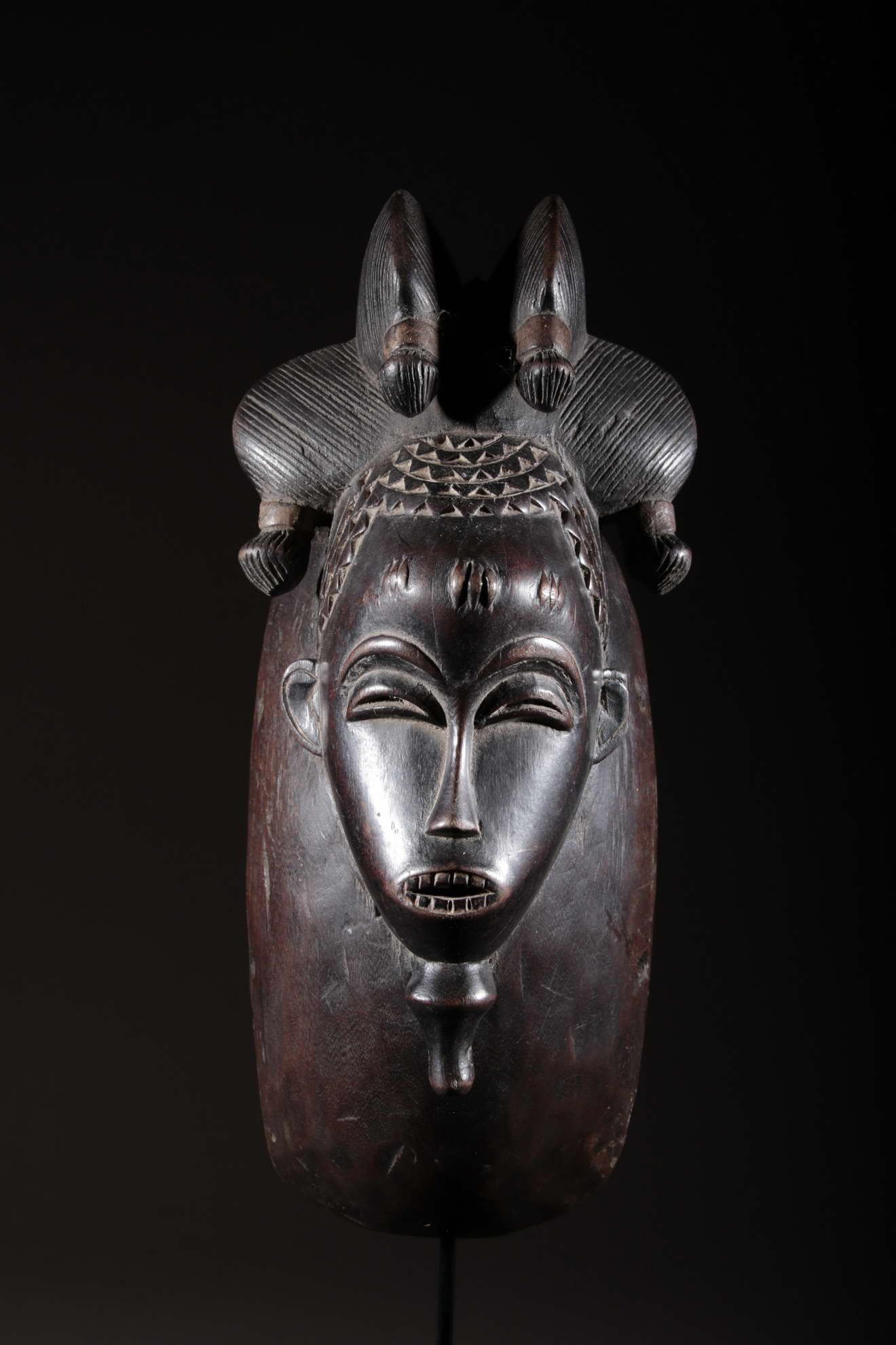 Les Baoulé possèdent des masques, sans doute, sous l’influence de leurs voisins Gouro ou Sénoufo. Il existe des masques Baoulé d’ancêtres mais qui maintenant ont un rôle laïc et apparaissent lors de danses de divertissements. Ces portraits possèdent les mêmes caractéristiques que la statuaire : élégants, sculptés finement et polis. Ils montrent une grande diversité régionale dans les coiffures et les tatouages. . Le masque Baoulé double représente le mariage du soleil et de la lune ou des jumeaux dont la naissance est toujours un bon signe.