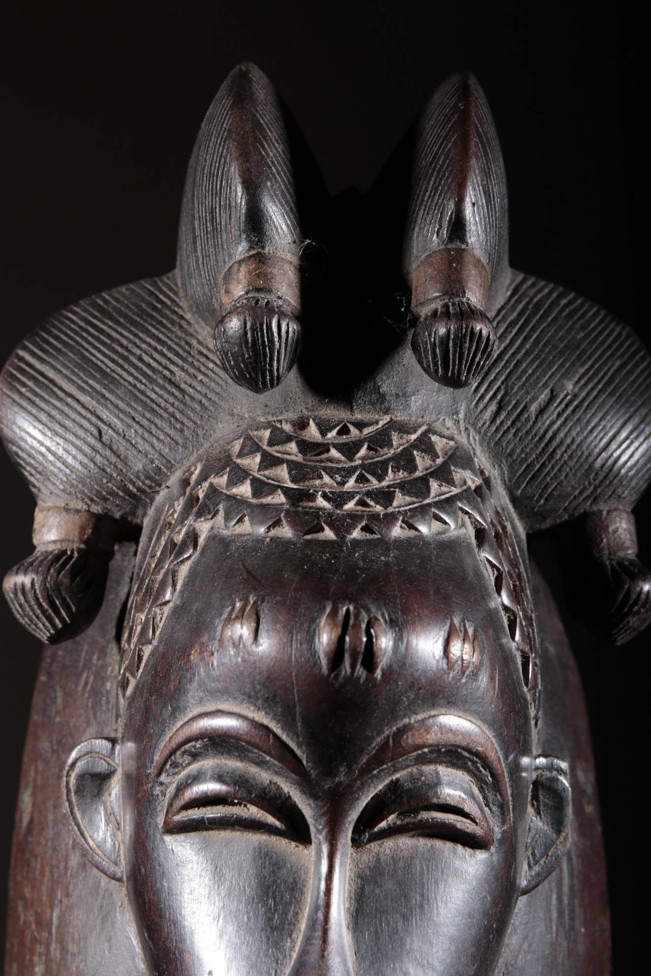 Autrement il existe des masques Baoulé zoomorphes, rappelant le buffle et l’antilope. Ces masques sont toujours portés par des hommes. Ils ont une réalisation différente des masques Baoulé portraits d’ancêtres, ils sont plus conceptuels et schématiques car ils représentent des esprits.