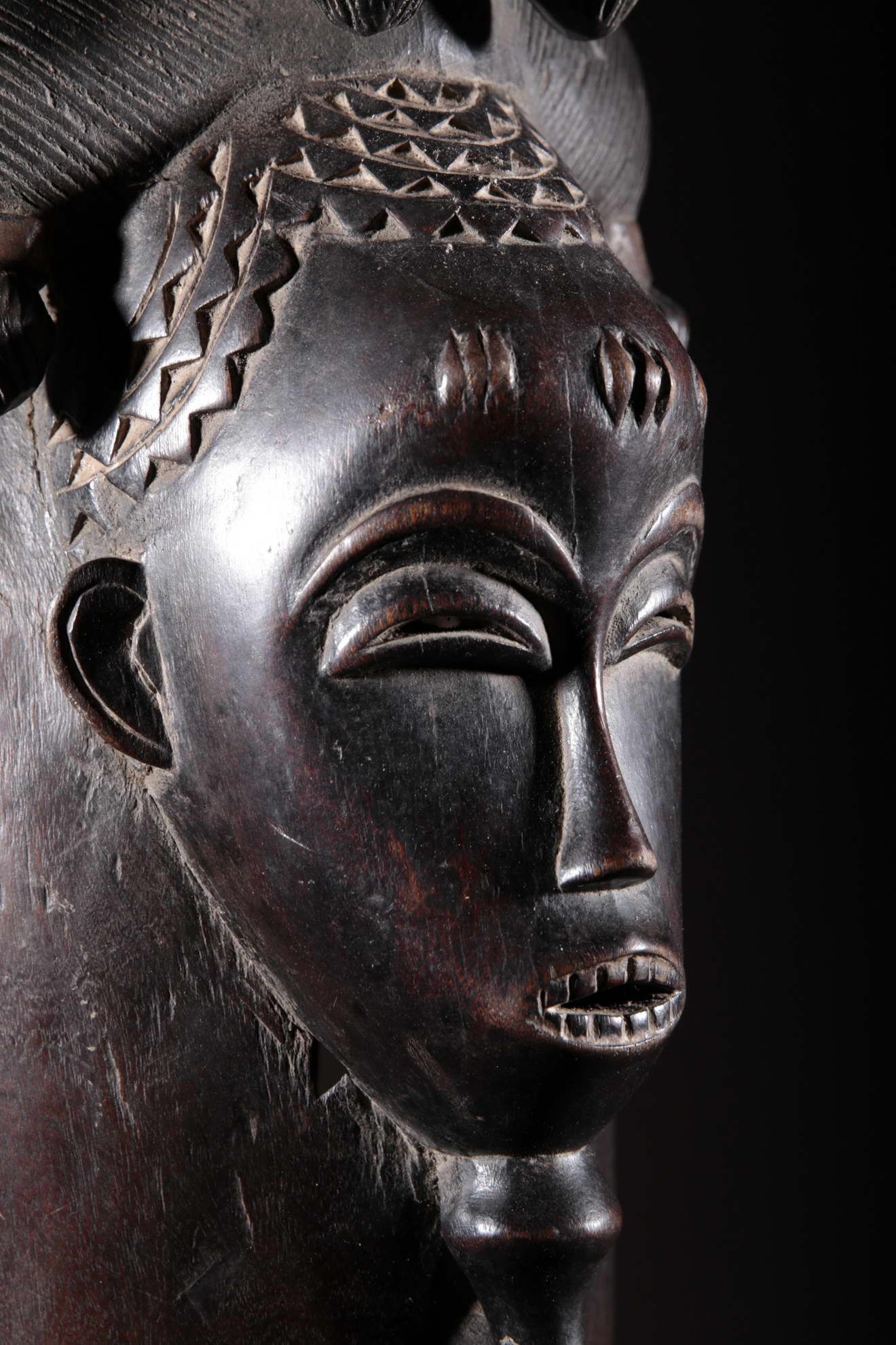 La sculpture Baoulé sur bois possède la finesse de réalisation de l’orfèvrerie : la sculpture est très raffinée, les surfaces sont très polie, la représentation des scarifications, des bijoux, de la coiffure, du visage est faite de manière soignée et minutieuse.
