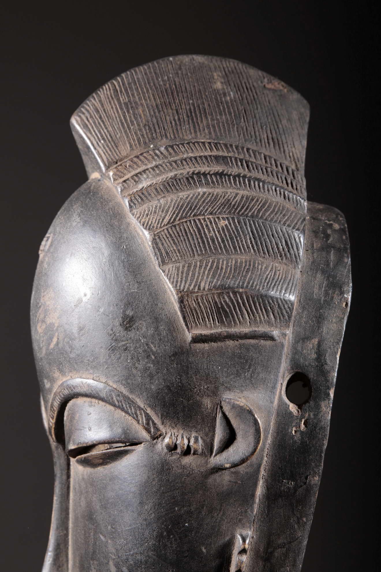 Le gba gba, d’origine Gouro, est employé pour des funérailles de femmes lors de la période des récoltes. Il célèbre la beauté et l’âge, d’où la finesse de ses traits.