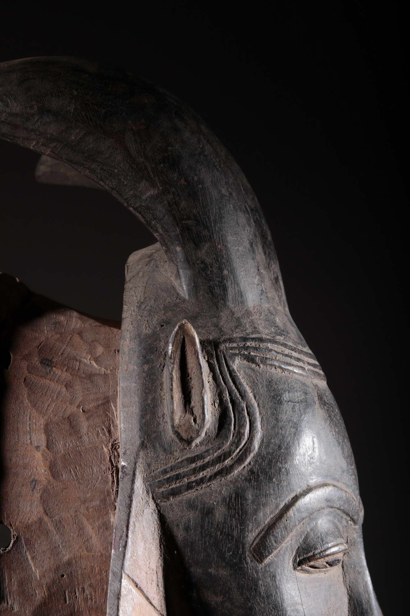 Autrement il existe des masques Baoulé zoomorphes, rappelant le buffle et l’antilope. Ces masques sont toujours portés par des hommes. Ils ont une réalisation différente des masques Baoulé portraits d’ancêtres, ils sont plus conceptuels et schématiques car ils représentent des esprits.