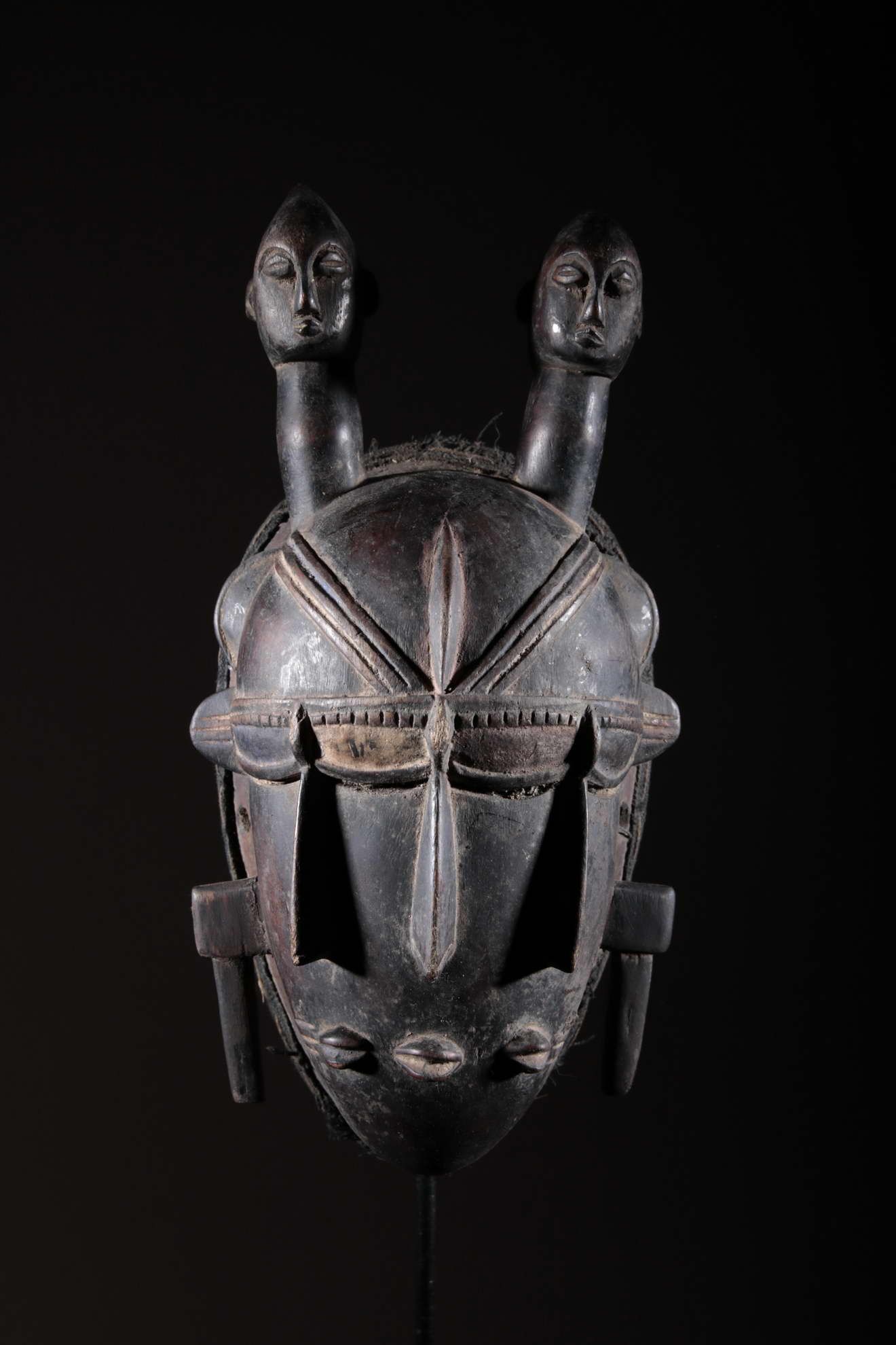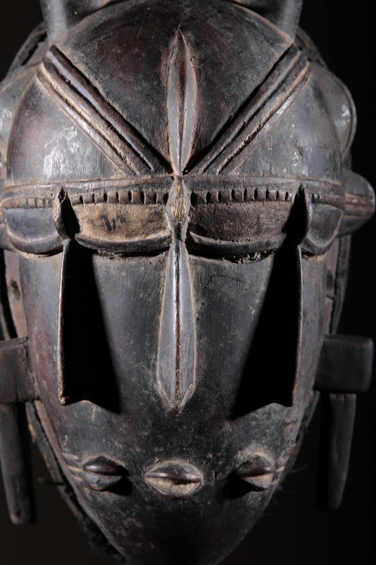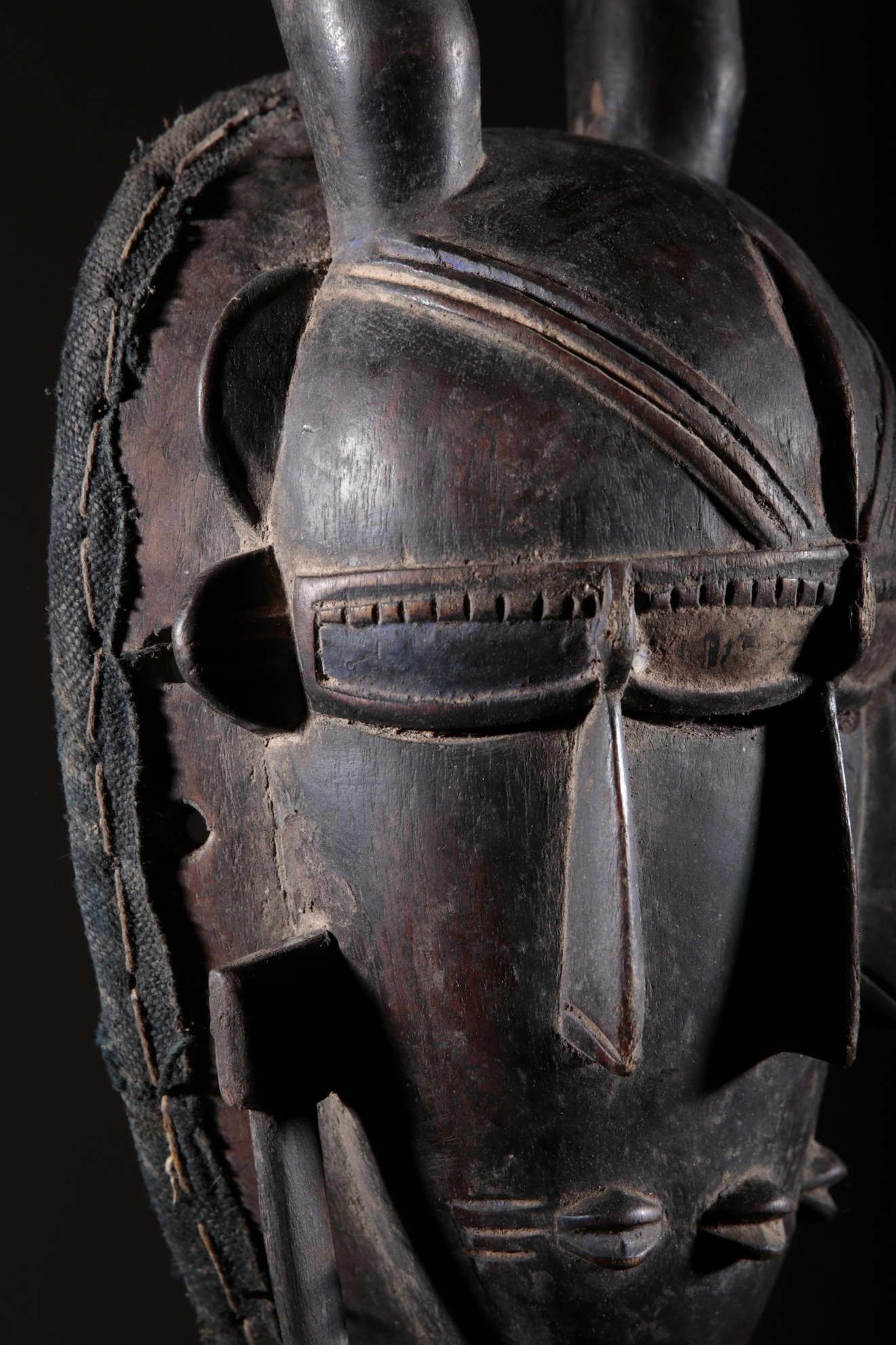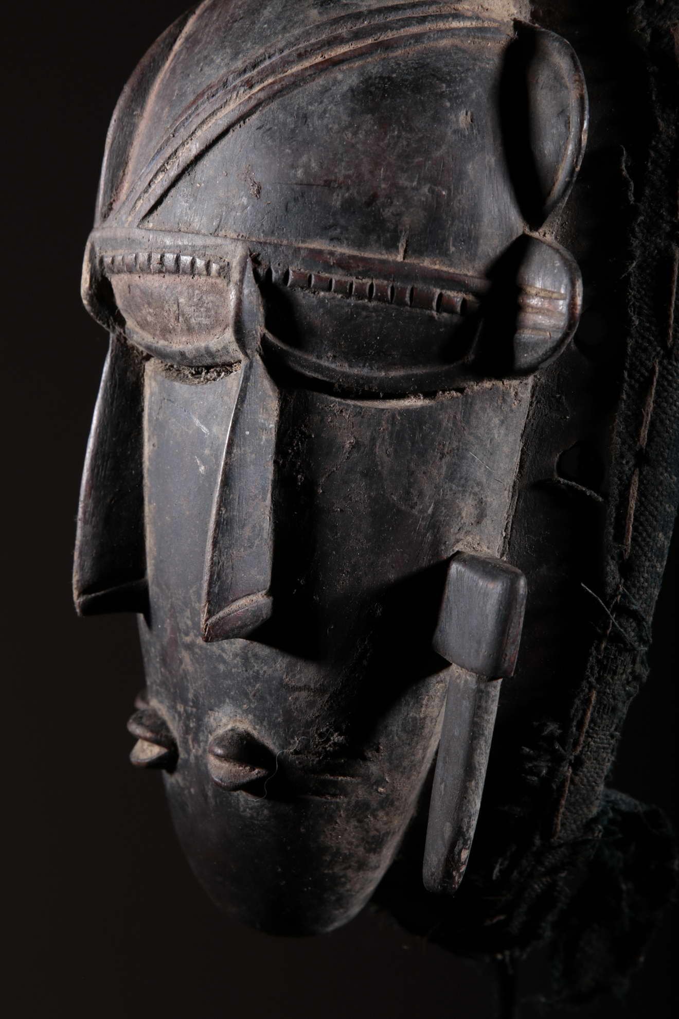 Les Djimini, comme les Tagouana, sont des Mandé du nord de la Côte d’Ivoire. Lors des conquêtes de Samory, ils payèrent un lourd tribut pour n’avoir pas voulu traiter avec lui. Colonisés par la France au XIXe siècle, ils ont adopté la religion importée. Pour ces deux raisons, les masques et la statuaire ont grandement disparu chez ces deux peuples. Cependant, quelques rares masques et statues dont on avait la certitude qu’ils étaient les représentations de bons génies furent conservés. On remarque la patine noire et épaisse à la surface de ce masque ci-dessus. Cela est dû à l’art des Djimini lesquels maîtrisaient les vernissages des poteries en se servant de résines d’arbres, des techniques qu’ils ont répliqué sur la surface des masques. Quant à l’usage de l’objet, on en a oublié l’exactitude. Il reste toutefois porté durant les mascarades au cours des cérémonies rituelles.