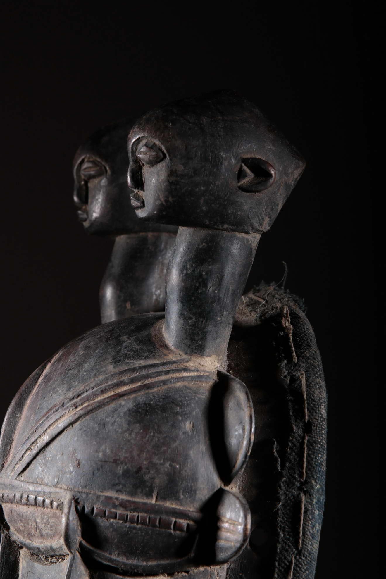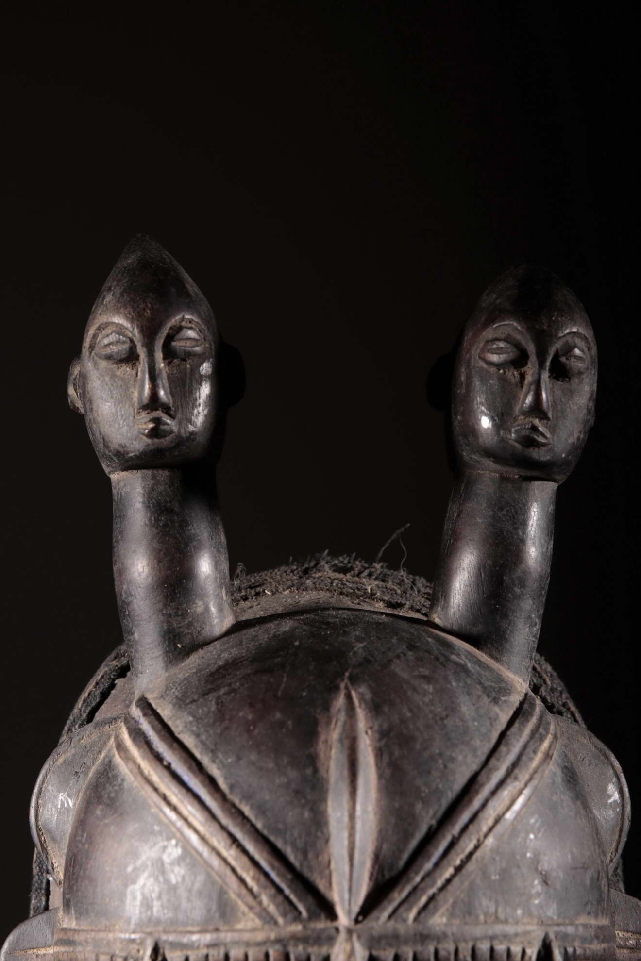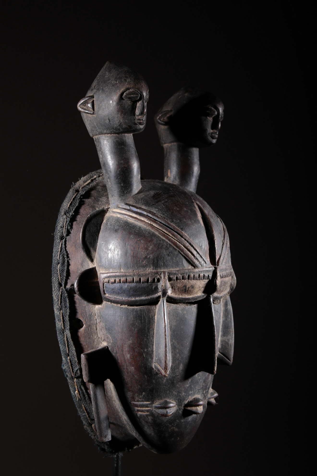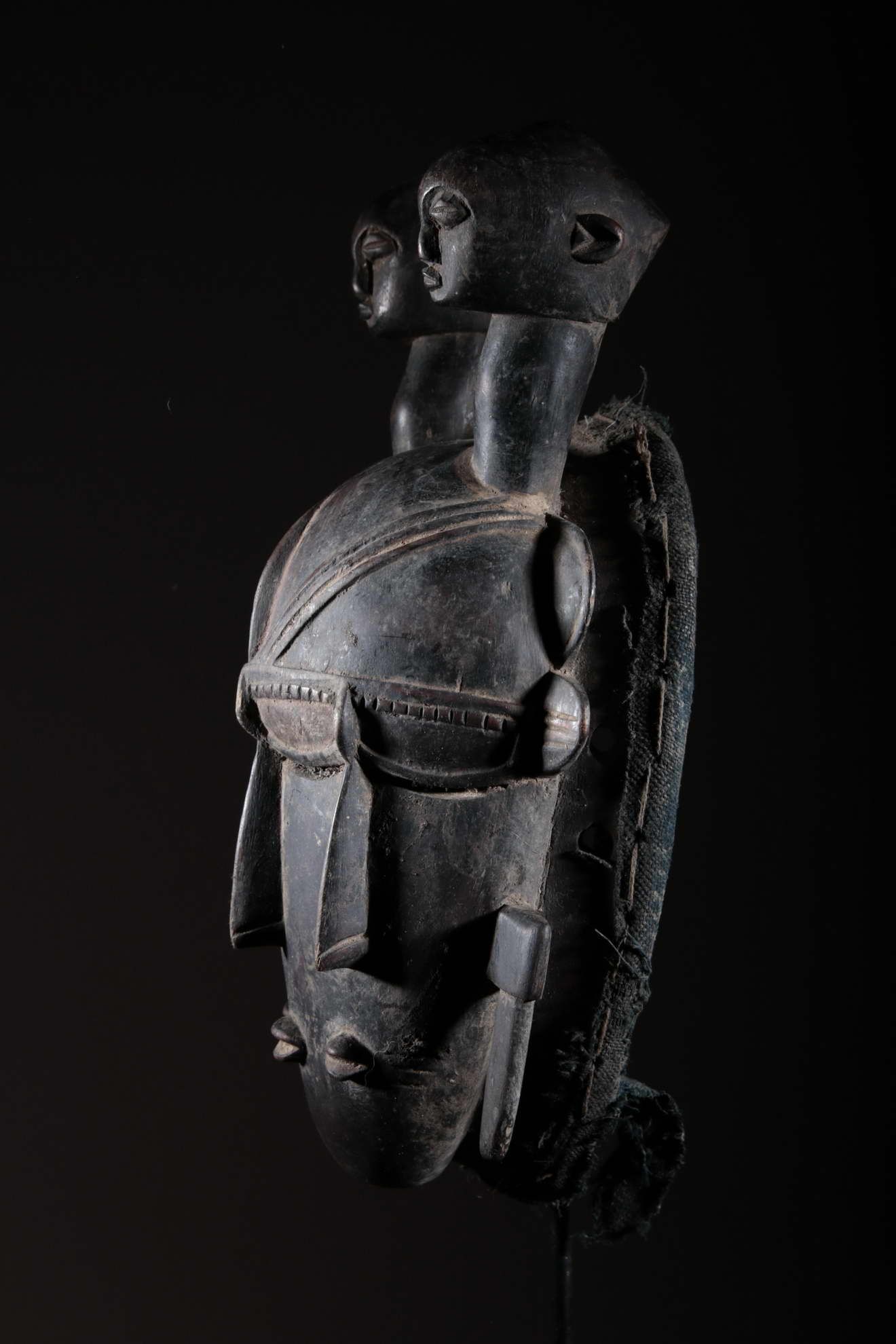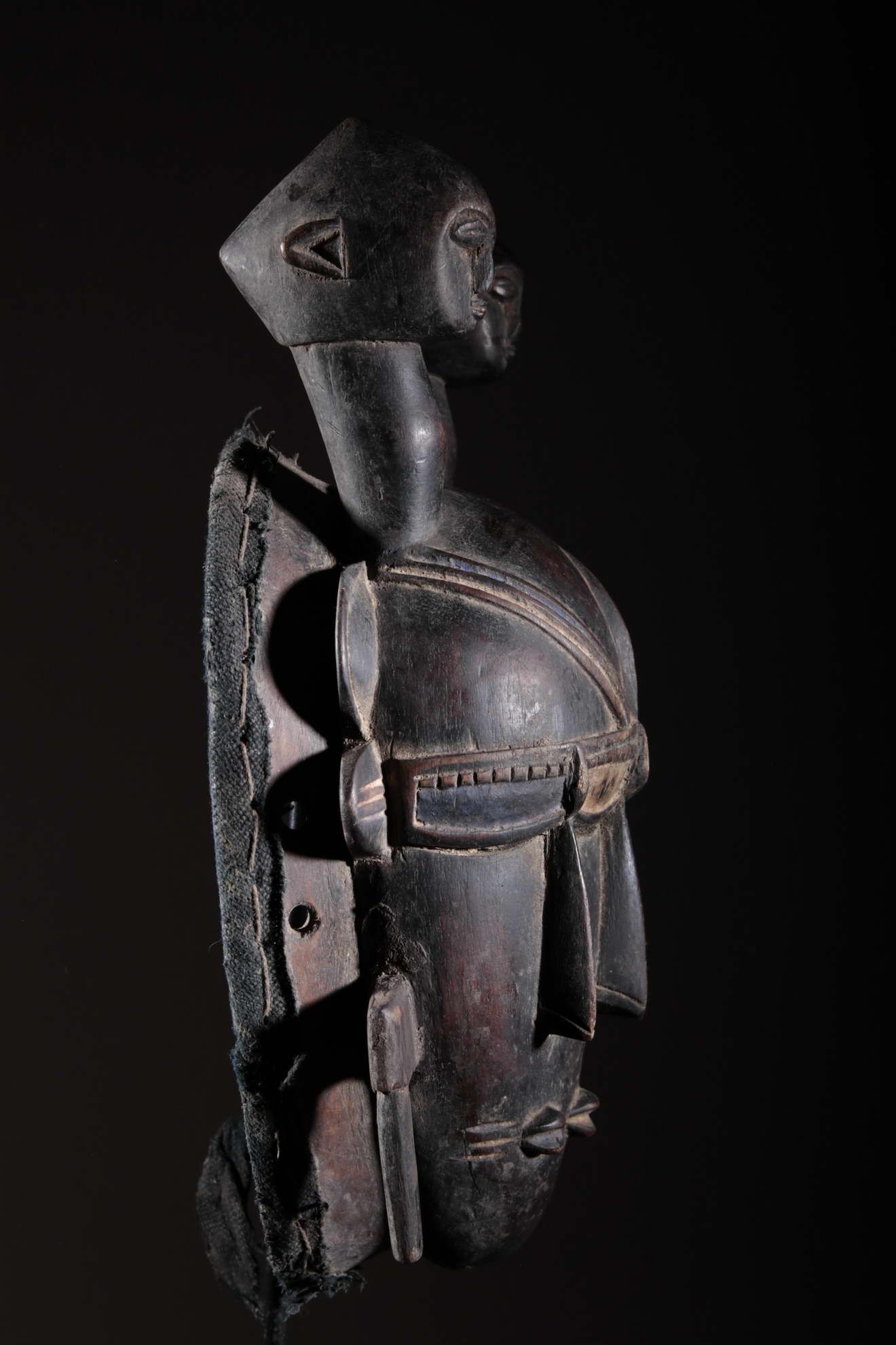Les Djimini, comme les Tagouana, sont des Mandé du nord de la Côte d’Ivoire. Lors des conquêtes de Samory, ils payèrent un lourd tribut pour n’avoir pas voulu traiter avec lui. Colonisés par la France au XIXe siècle, ils ont adopté la religion importée. Pour ces deux raisons, les masques et la statuaire ont grandement disparu chez ces deux peuples. Cependant, quelques rares masques et statues dont on avait la certitude qu’ils étaient les représentations de bons génies furent conservés. On remarque la patine noire et épaisse à la surface de ce masque ci-dessus. Cela est dû à l’art des Djimini lesquels maîtrisaient les vernissages des poteries en se servant de résines d’arbres, des techniques qu’ils ont répliqué sur la surface des masques. Quant à l’usage de l’objet, on en a oublié l’exactitude. Il reste toutefois porté durant les mascarades au cours des cérémonies rituelles.
