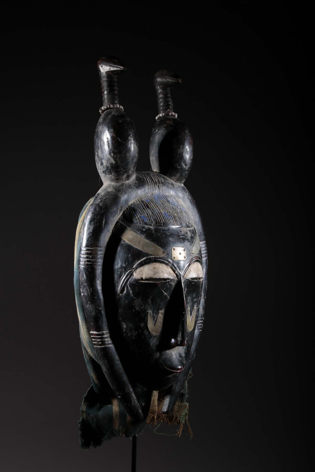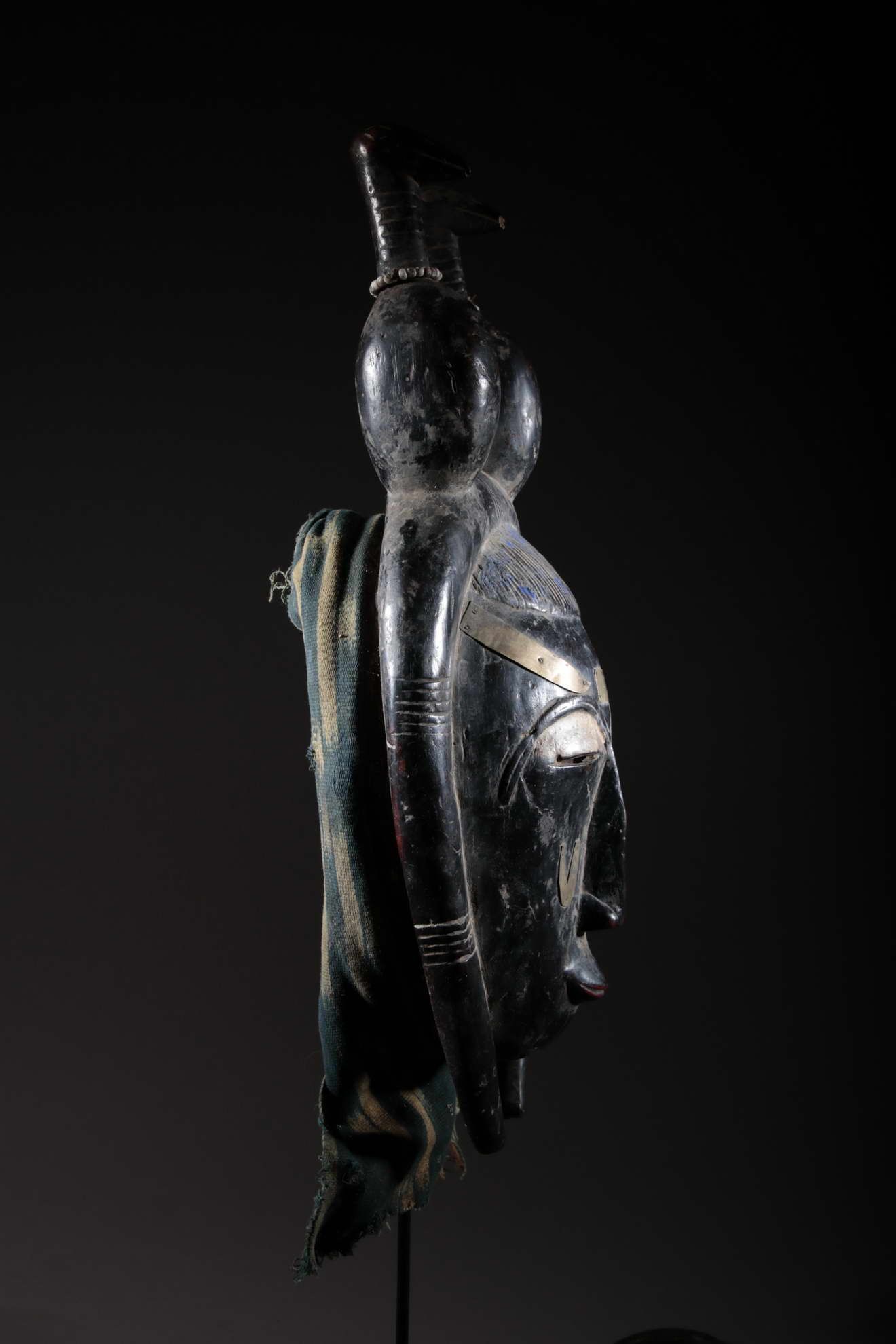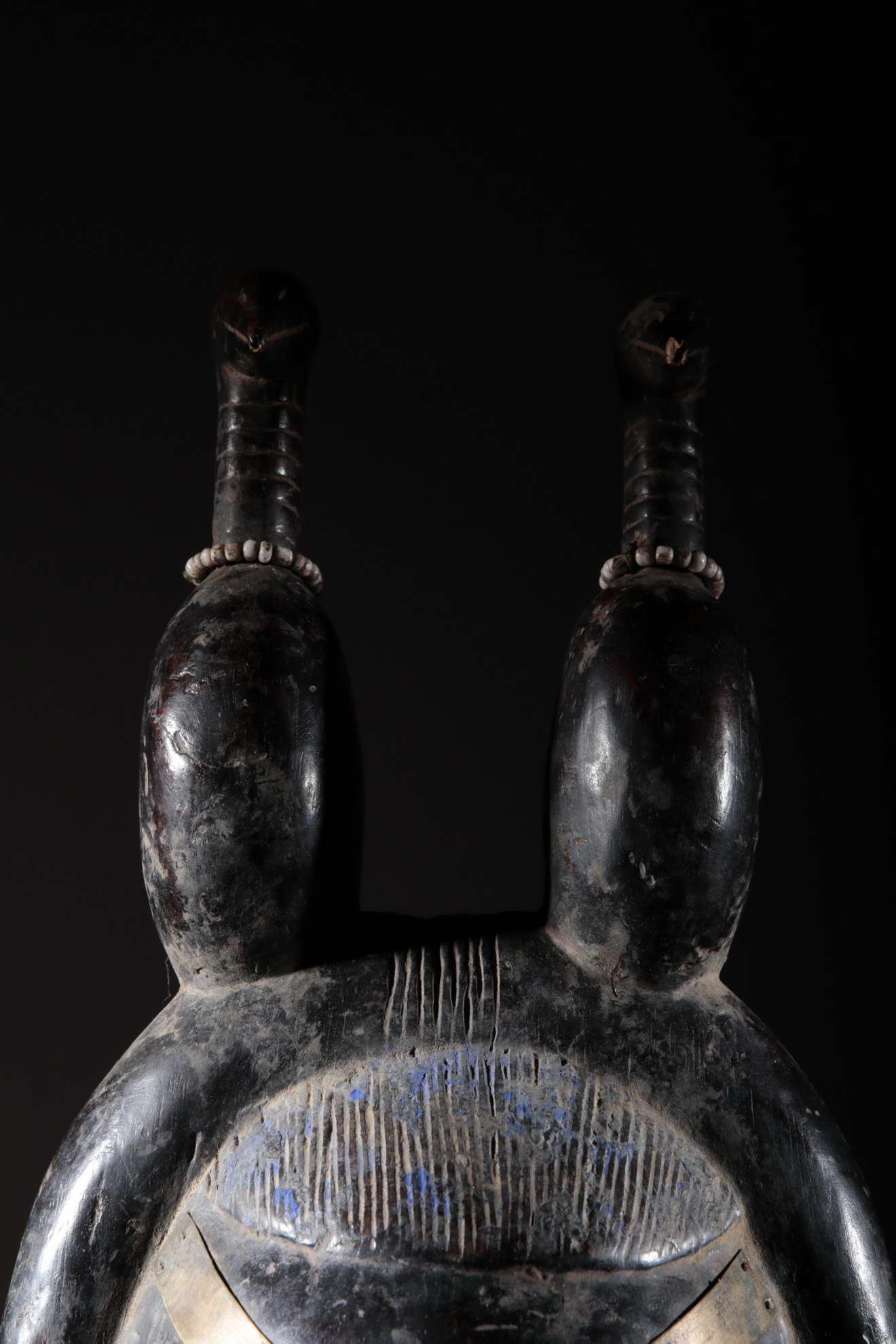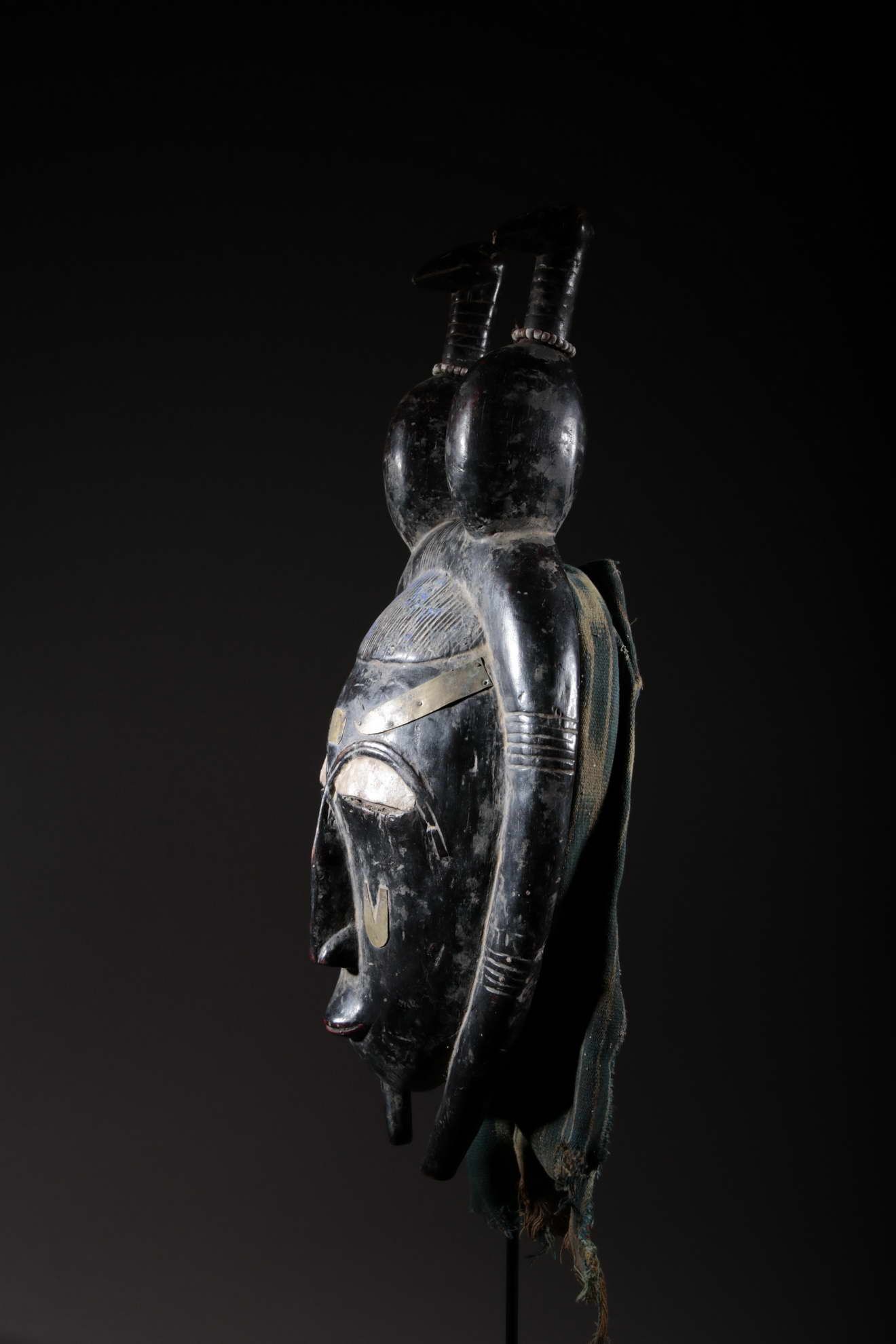Les Djimini, comme les Tagouana, sont des Mandé du nord de la Côte d’Ivoire. Lors des conquêtes de Samory, ils payèrent un lourd tribut pour n’avoir pas voulu traiter avec lui. Colonisés par la France au XIXe siècle, ils ont adopté la religion importée. Pour ces deux raisons, les masques et la statuaire ont grandement disparu chez ces deux peuples. Cependant, quelques rares masques et statues dont on avait la certitude qu’ils étaient les représentations de bons génies furent conservés. On remarque la patine noire et épaisse à la surface de ce masque ci-dessus. Cela est dû à l’art des Djimini lesquels maîtrisaient les vernissages des poteries en se servant de résines d’arbres, des techniques qu’ils ont répliqué sur la surface des masques. Quant à l’usage de l’objet, on en a oublié l’exactitude. Il reste toutefois porté durant les mascarades au cours des cérémonies rituelles.