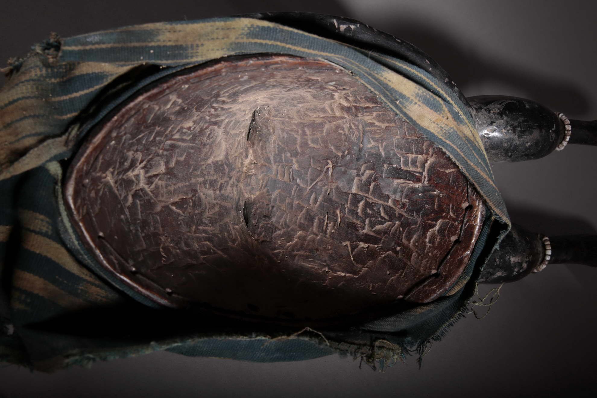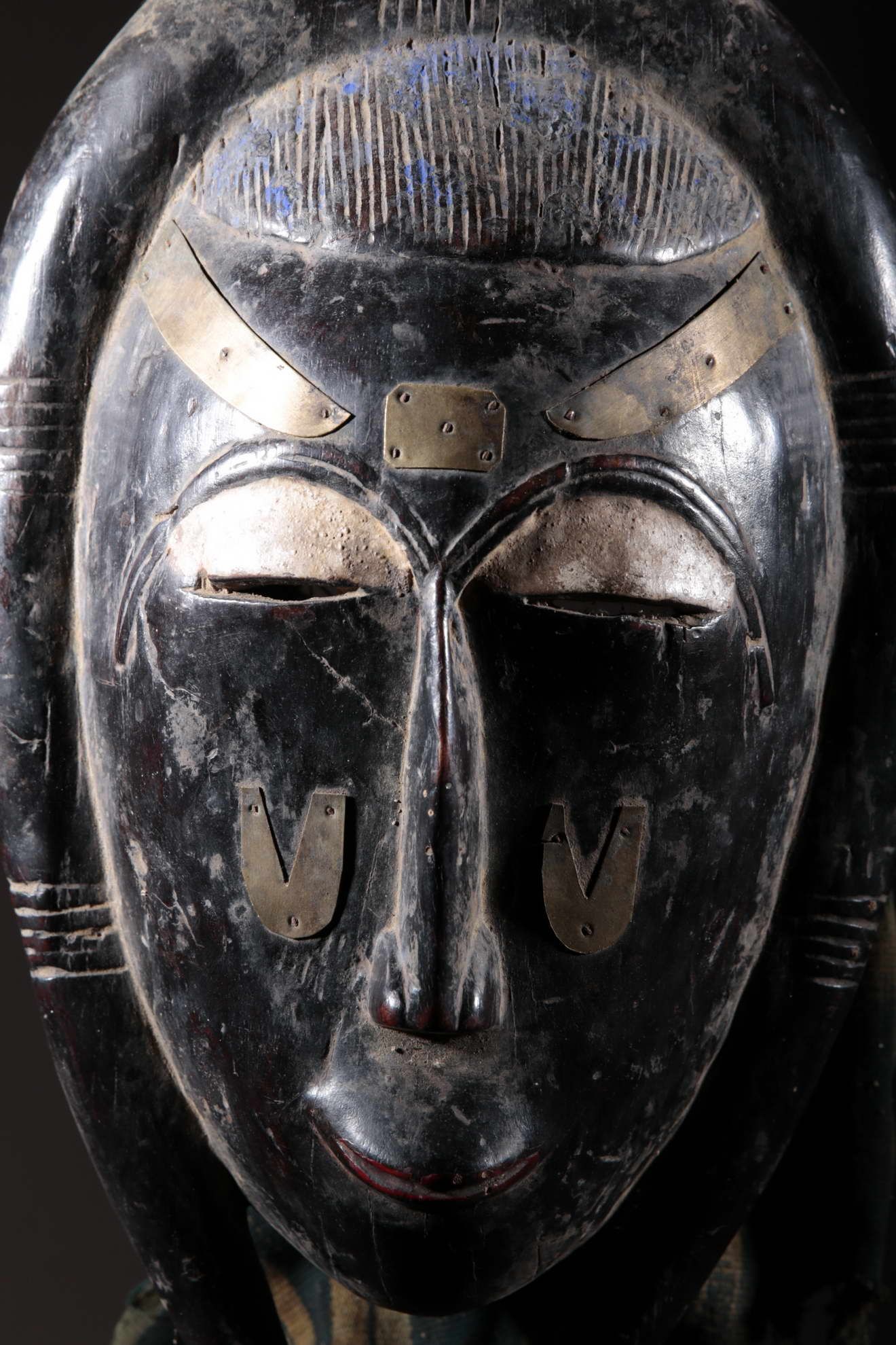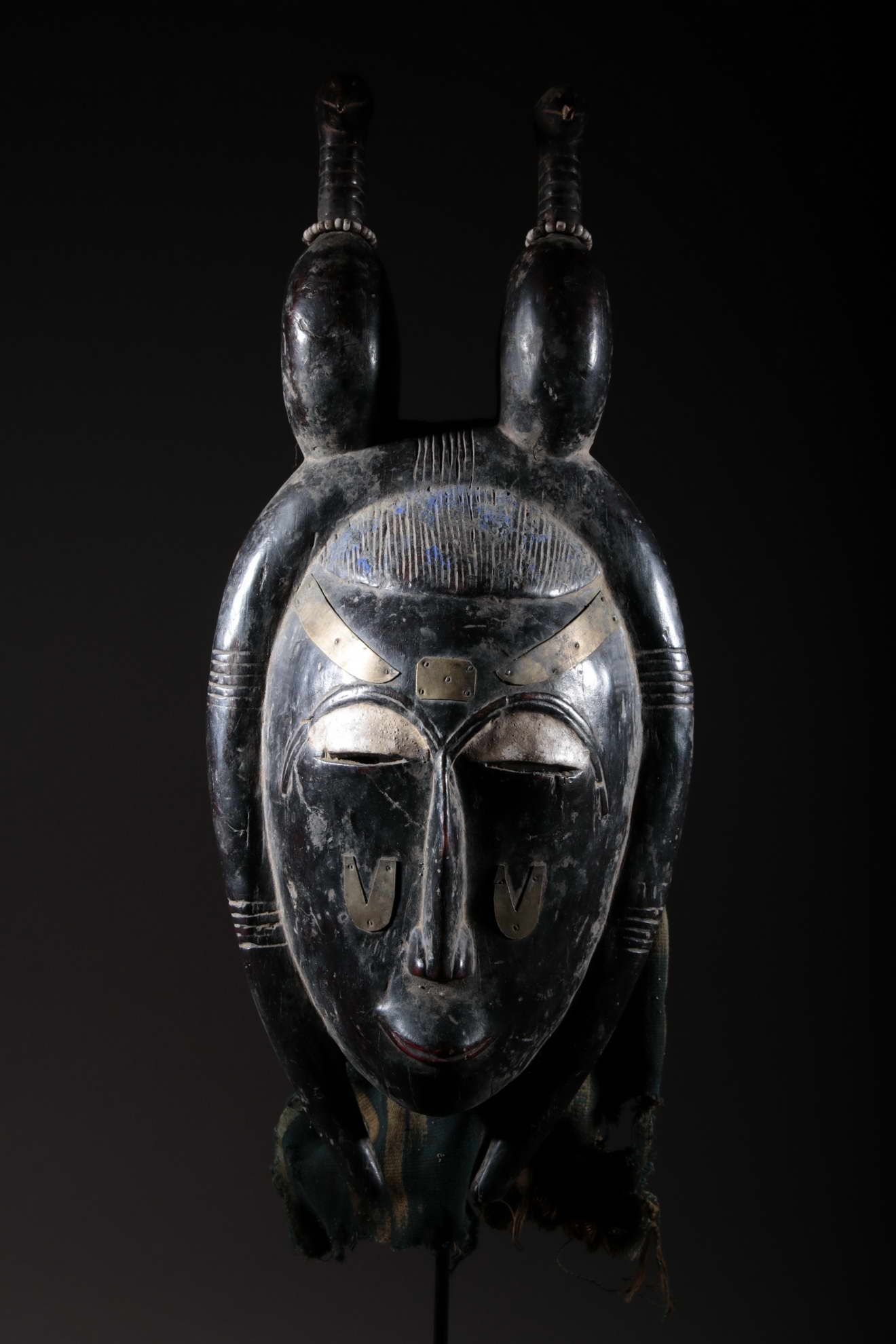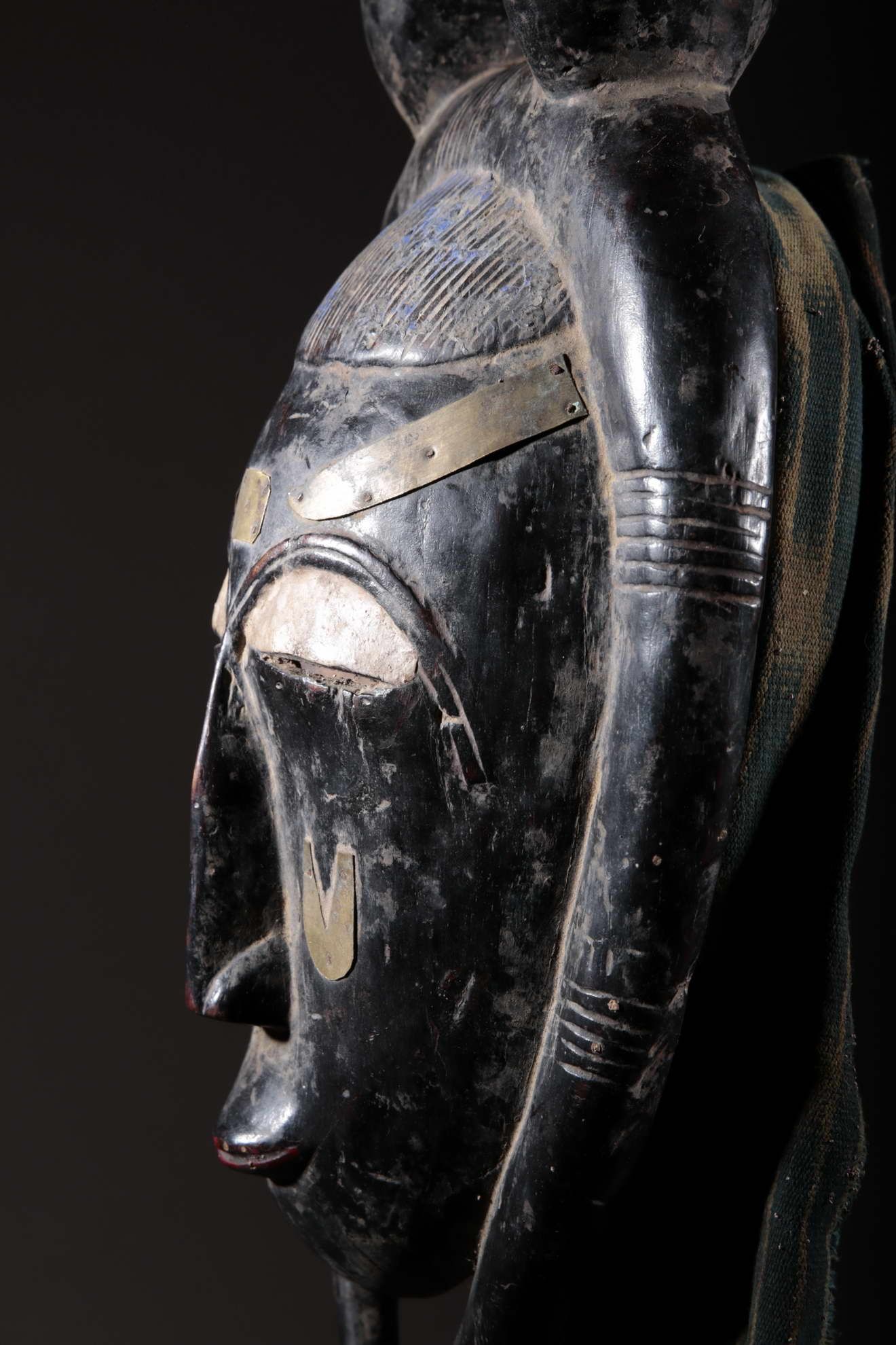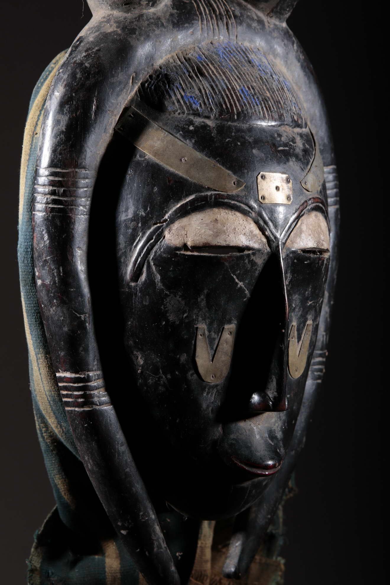 Les Djimini, comme les Tagouana, sont des Mandé du nord de la Côte d’Ivoire. Lors des conquêtes de Samory, ils payèrent un lourd tribut pour n’avoir pas voulu traiter avec lui. Colonisés par la France au XIXe siècle, ils ont adopté la religion importée. Pour ces deux raisons, les masques et la statuaire ont grandement disparu chez ces deux peuples. Cependant, quelques rares masques et statues dont on avait la certitude qu’ils étaient les représentations de bons génies furent conservés. On remarque la patine noire et épaisse à la surface de ce masque ci-dessus. Cela est dû à l’art des Djimini lesquels maîtrisaient les vernissages des poteries en se servant de résines d’arbres, des techniques qu’ils ont répliqué sur la surface des masques. Quant à l’usage de l’objet, on en a oublié l’exactitude. Il reste toutefois porté durant les mascarades au cours des cérémonies rituelles.