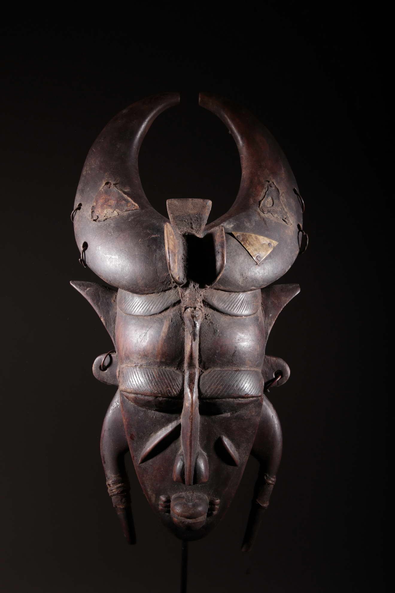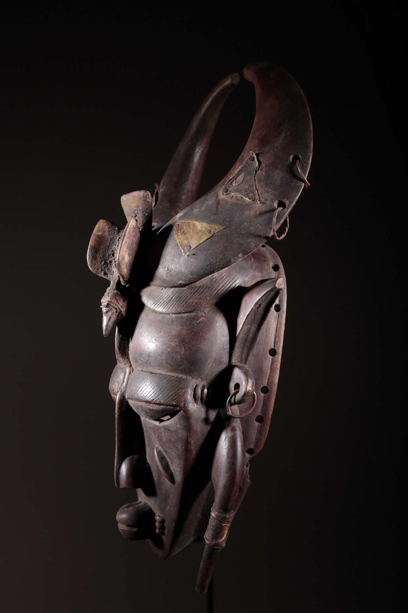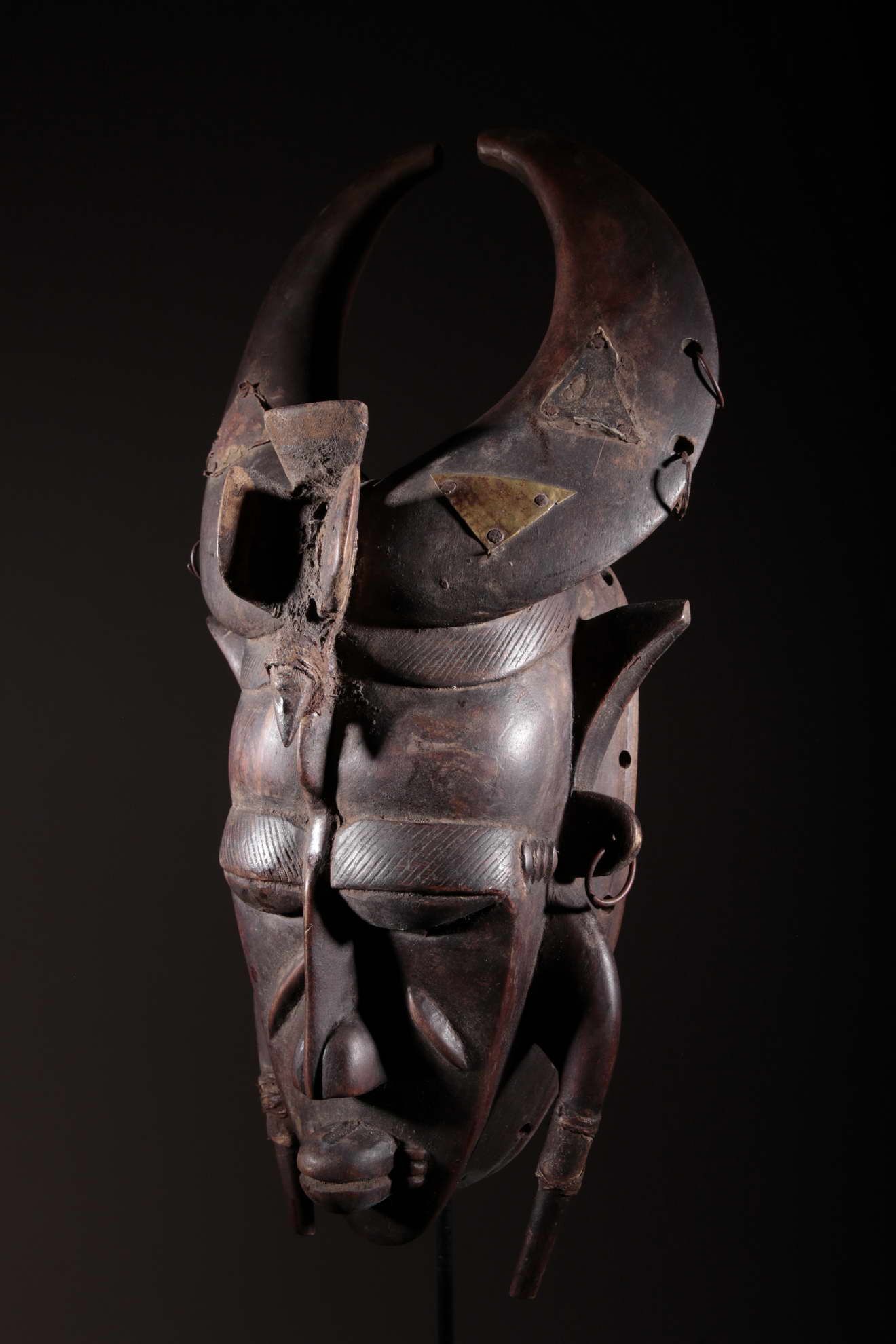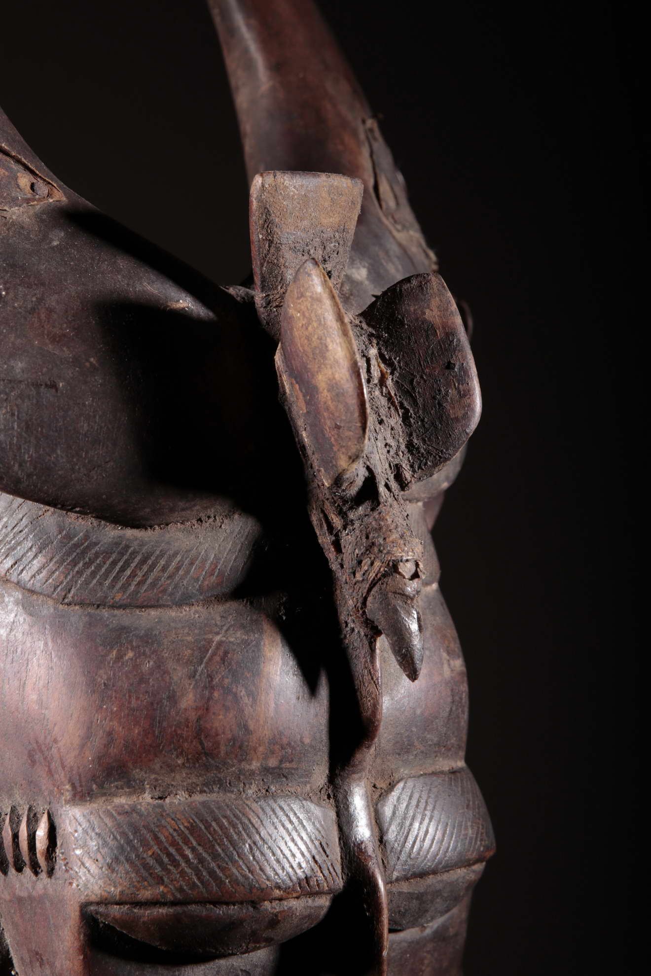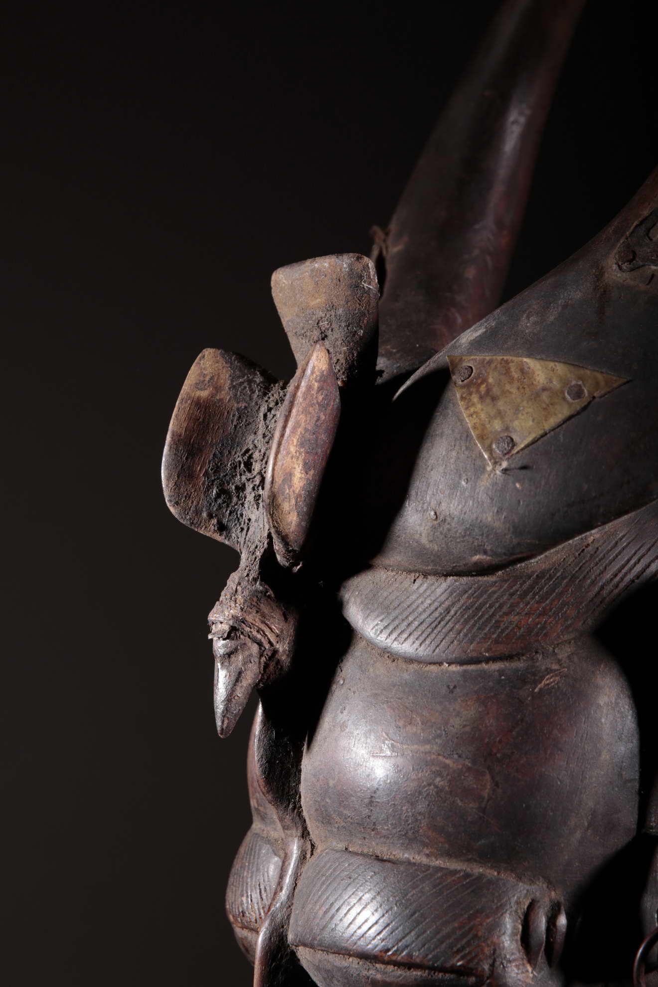 Les Djimini, comme les Tagouana, sont des Mandé du nord de la Côte d’Ivoire. Lors des conquêtes de Samory, ils payèrent un lourd tribut pour n’avoir pas voulu traiter avec lui. Colonisés par la France au XIXe siècle, ils ont adopté la religion importée. Pour ces deux raisons, les masques et la statuaire ont grandement disparu chez ces deux peuples. Cependant, quelques rares masques et statues dont on avait la certitude qu’ils étaient les représentations de bons génies furent conservés. On remarque la patine noire et épaisse à la surface de ce masque ci-dessus. Cela est dû à l’art des Djimini lesquels maîtrisaient les vernissages des poteries en se servant de résines d’arbres, des techniques qu’ils ont répliqué sur la surface des masques. Quant à l’usage de l’objet, on en a oublié l’exactitude. Il reste toutefois porté durant les mascarades au cours des cérémonies rituelles.