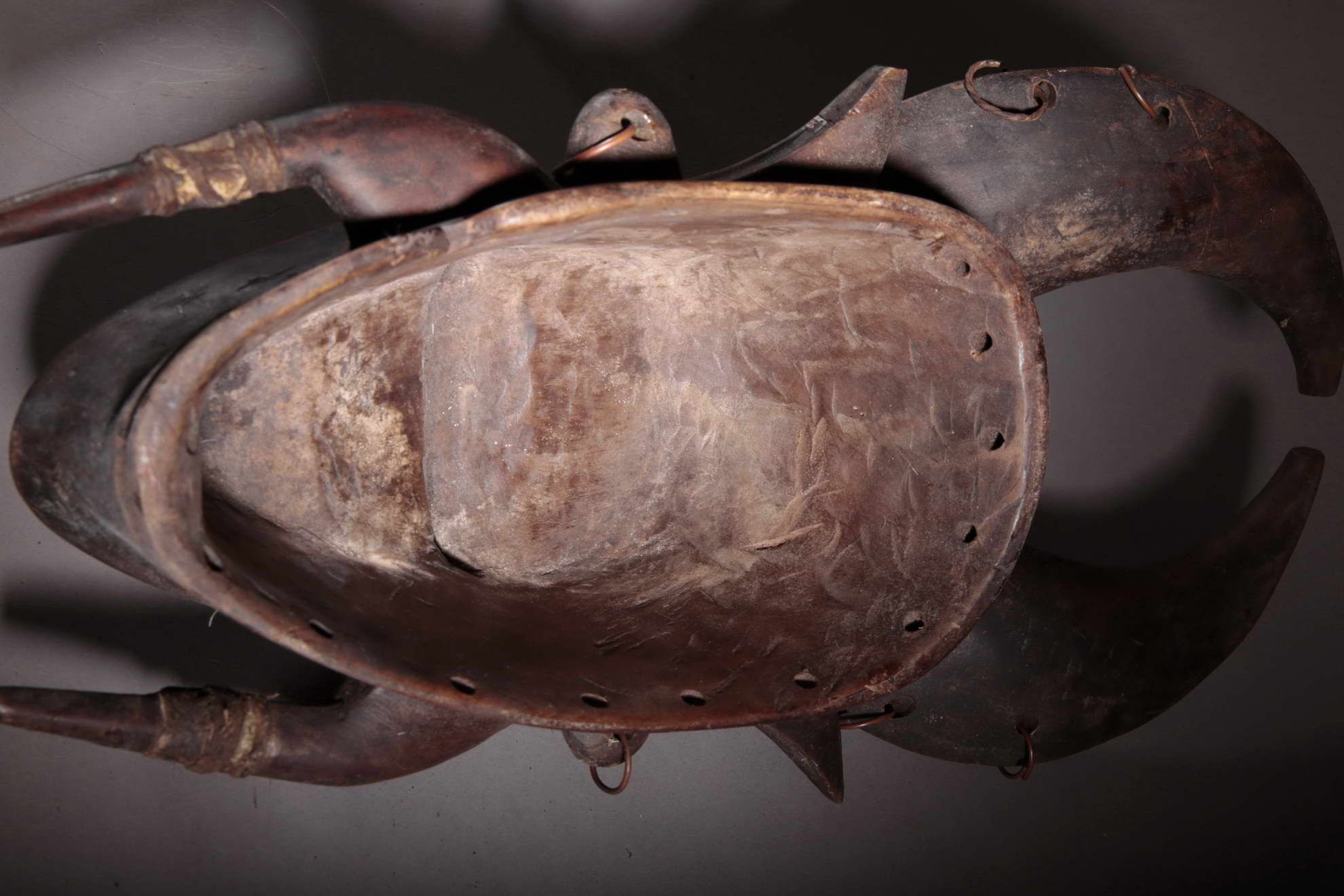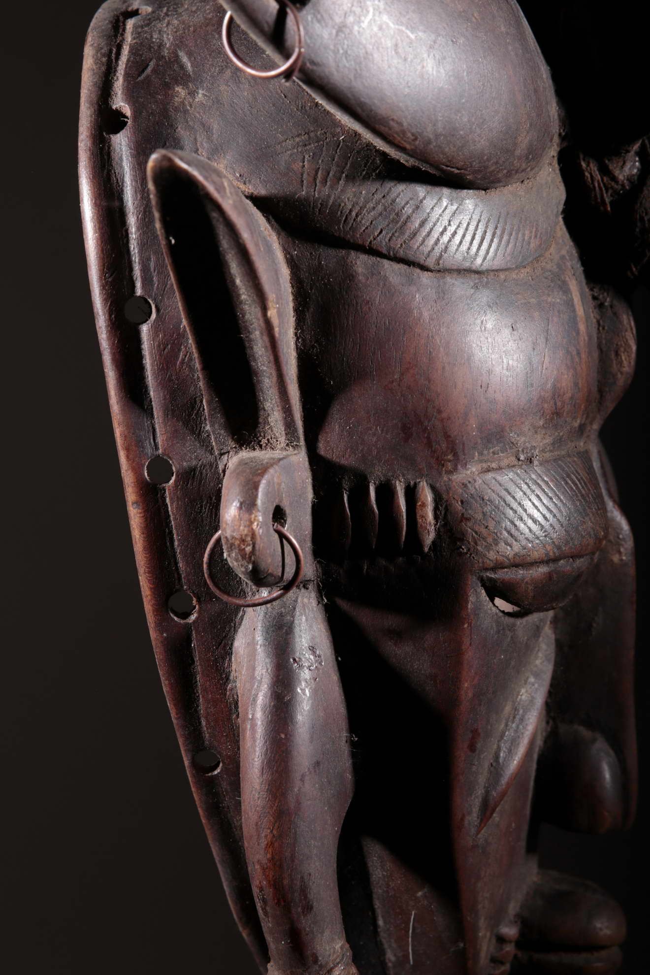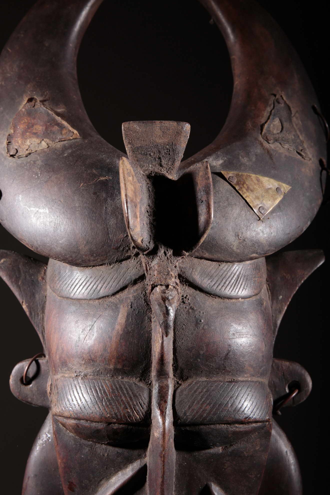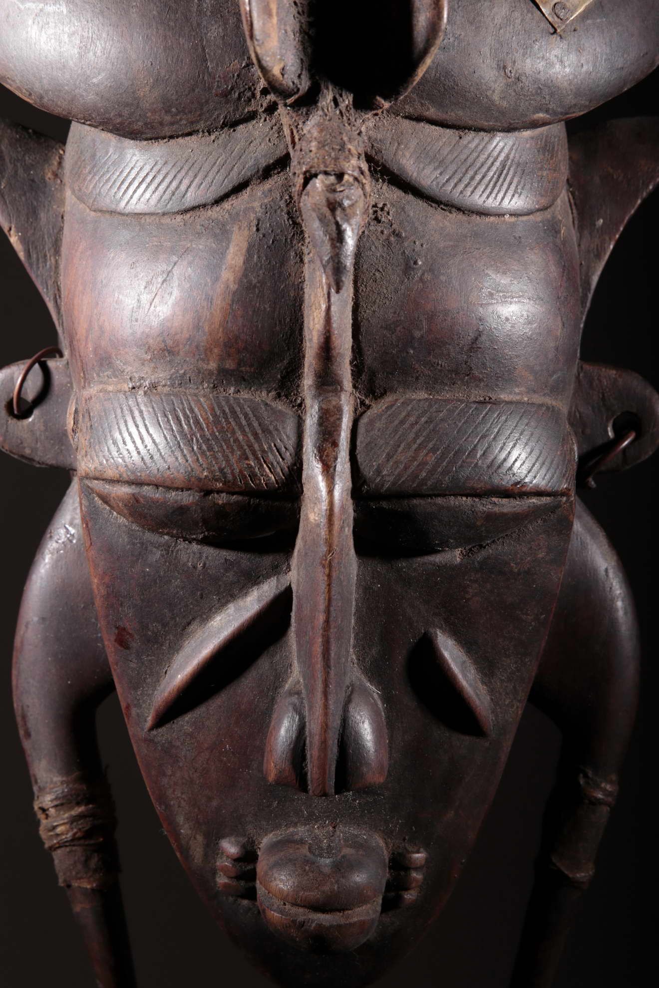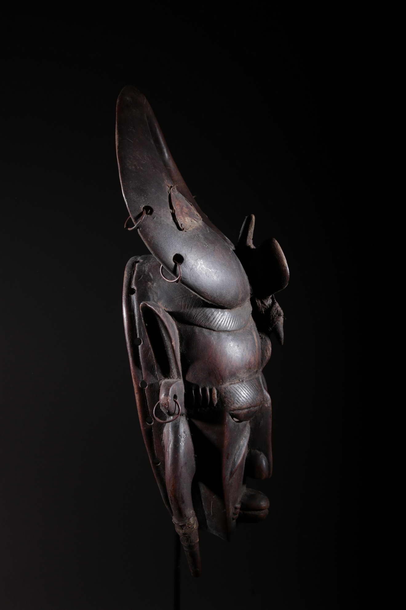Les Djimini, comme les Tagouana, sont des Mandé du nord de la Côte d’Ivoire. Lors des conquêtes de Samory, ils payèrent un lourd tribut pour n’avoir pas voulu traiter avec lui. Colonisés par la France au XIXe siècle, ils ont adopté la religion importée. Pour ces deux raisons, les masques et la statuaire ont grandement disparu chez ces deux peuples. Cependant, quelques rares masques et statues dont on avait la certitude qu’ils étaient les représentations de bons génies furent conservés. On remarque la patine noire et épaisse à la surface de ce masque ci-dessus. Cela est dû à l’art des Djimini lesquels maîtrisaient les vernissages des poteries en se servant de résines d’arbres, des techniques qu’ils ont répliqué sur la surface des masques. Quant à l’usage de l’objet, on en a oublié l’exactitude. Il reste toutefois porté durant les mascarades au cours des cérémonies rituelles.