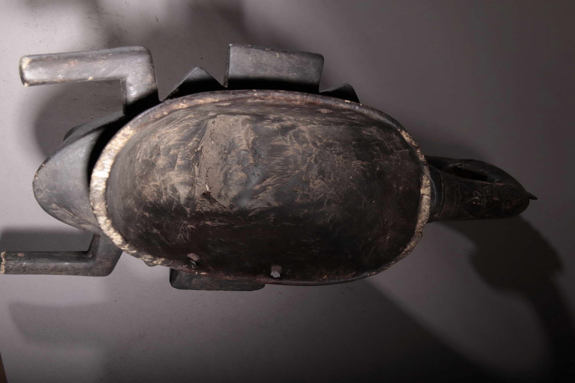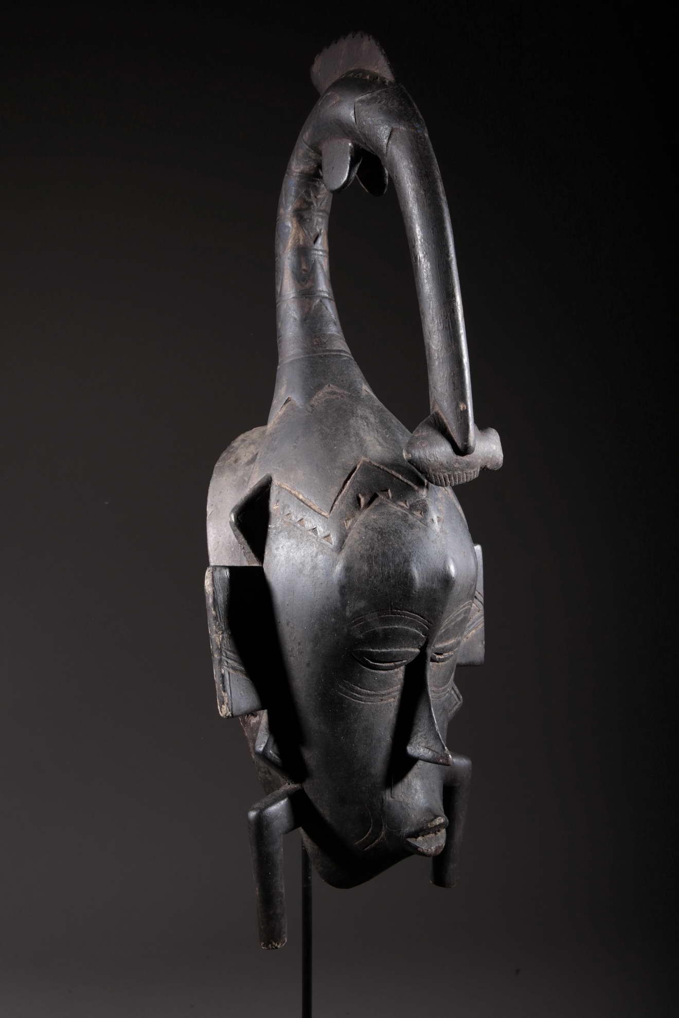 Les Djimini, comme les Tagouana, sont des Mandé du nord de la Côte d’Ivoire. Lors des conquêtes de Samory, ils payèrent un lourd tribut pour n’avoir pas voulu traiter avec lui. Colonisés par la France au XIXe siècle, ils ont adopté la religion importée. Pour ces deux raisons, les masques et la statuaire ont grandement disparu chez ces deux peuples. Cependant, quelques rares masques et statues dont on avait la certitude qu’ils étaient les représentations de bons génies furent conservés. On remarque la patine noire et épaisse à la surface de ce masque ci-dessus. Cela est dû à l’art des Djimini lesquels maîtrisaient les vernissages des poteries en se servant de résines d’arbres, des techniques qu’ils ont répliqué sur la surface des masques. Quant à l’usage de l’objet, on en a oublié l’exactitude. Il reste toutefois porté durant les mascarades au cours des cérémonies rituelles.