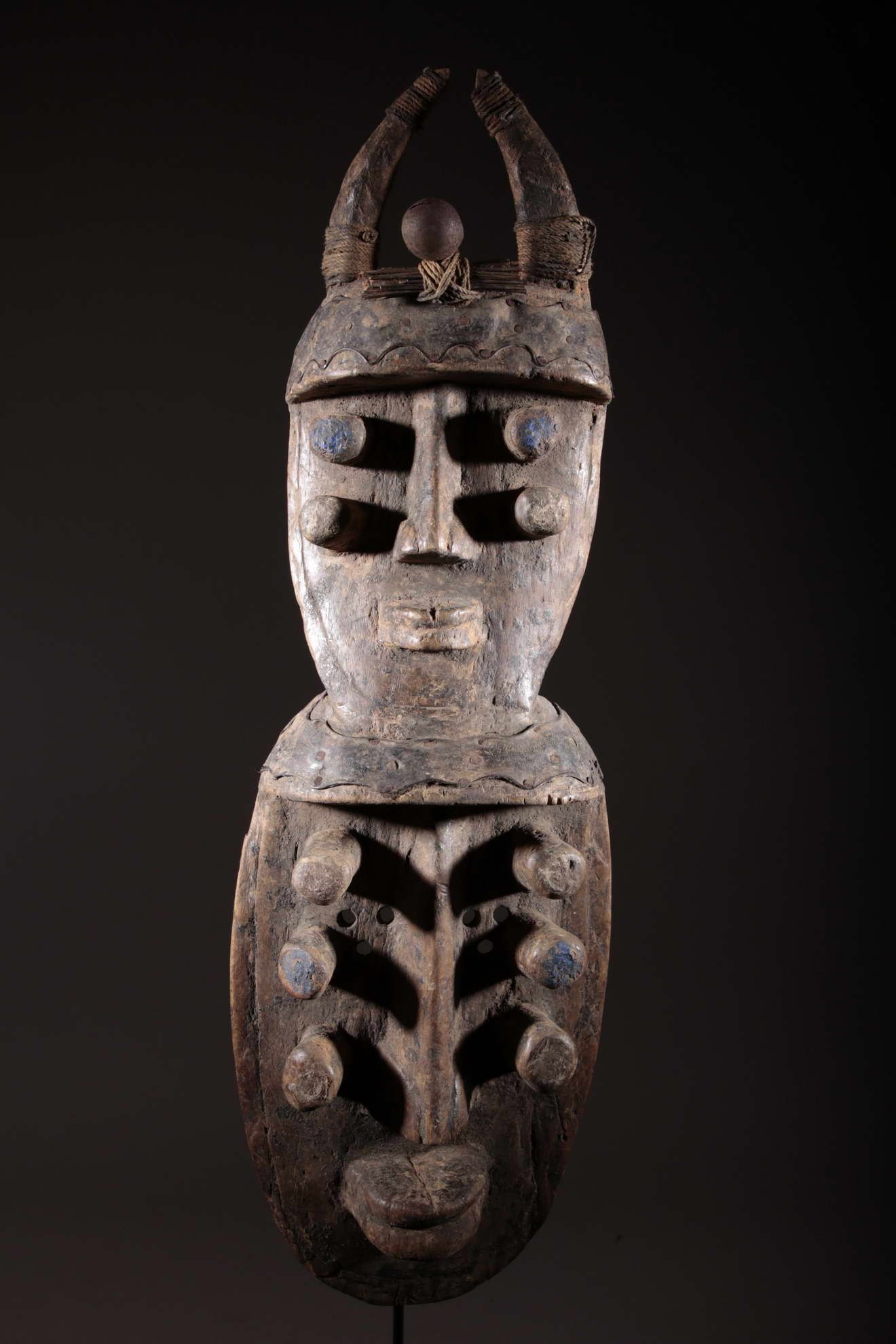 Les masques masculins aux formes géométriques sont souvent reconnaissables à leur long nez encadré par une, deux ou plusieurs paires d'yeux protubérants de forme tubulaire, d'allure parfois menaçante. Les traits des masques féminins sont plus doux, plus harmonieux et plus sereins.