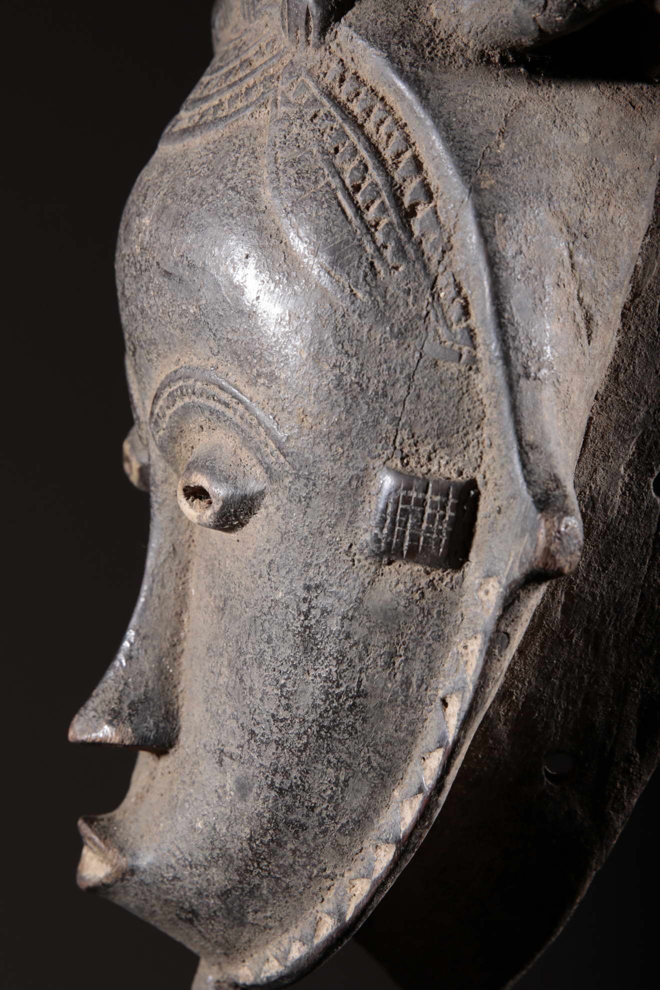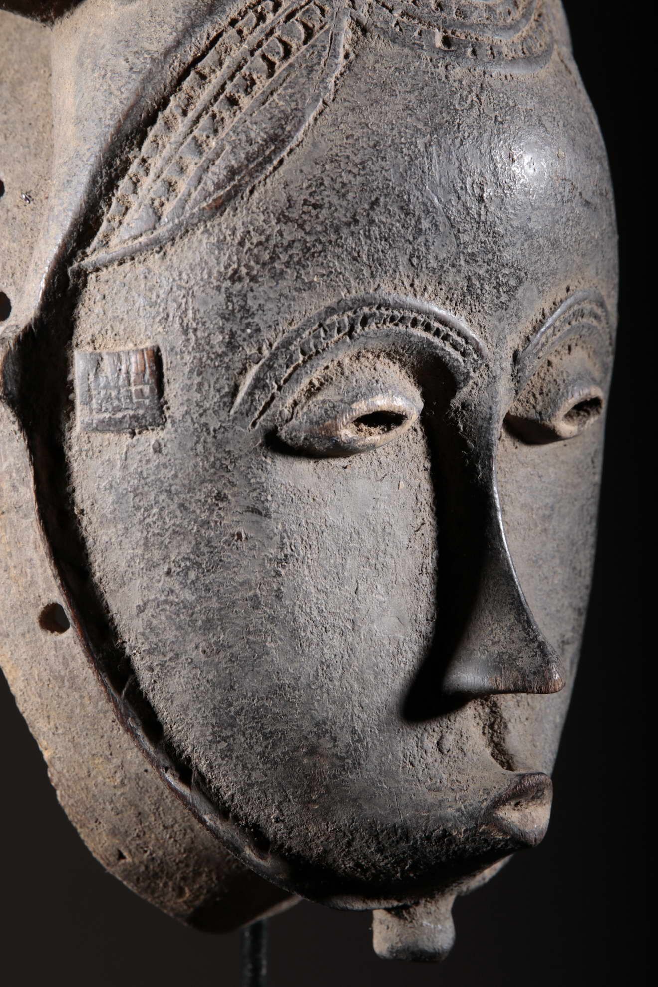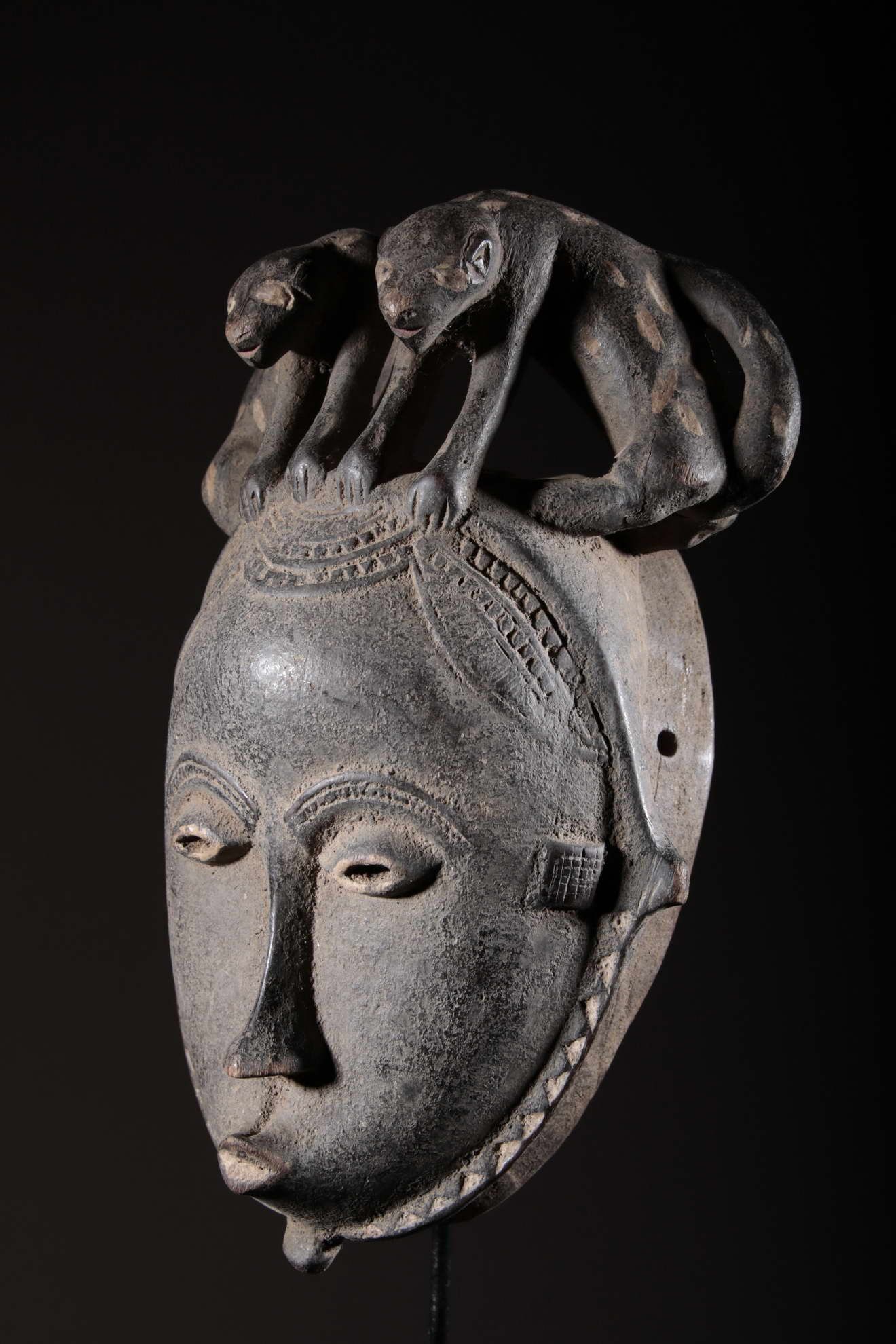 Les Yaouré sont divisés en trois groupes principaux rassemblant chacun une vingtaine de villages. Chaque village est dirigé par un chef, assisté par un conseil des anciens. La langue, la religion, la culture et l'art yaouré sont influencés par leurs puissants voisins les Baoulé et les Gouro. Cependant, ils possèdent un grand sens identitaire et ont créé un art caractéristique et rafiné.Chez les Yohouré ou Yaouré, les masques africains servent à influencer les forces surnaturelles 'YU' responsables des maux des hommes mais aussi de leur prospérité. Les masques dans cette ethnie sont interdits aux femmes, ils sont dansés le plus souvent pour rétablir le déséquilibre social et politique que peut entrainer le décès. Les Yohourés ont influencé les Baoulés en ce qui concerne l'esthétique des masques et ont été eux-mêmes influencés par le style Gouro. Sur ce masque le nez et la chevelure rappellent les masques Gu des Gouro. La chevelure est disposée en trois demi-cercles très travaillés : cela est le signe chez les Yohouré de pouvoir et de richesse*. Les masques de cette ethnie dégagent une sérénité, une douceur qui sont dûs à des conditions de vie relativement clémentes (climat et agriculture favorisés par la région lagunaire boisée qu'ils occupent). Les masques Yohouré sont souvent entourés d'une bordure dentelée caractéristique qui structure le masque et souligne l'harmonie générale des formes.