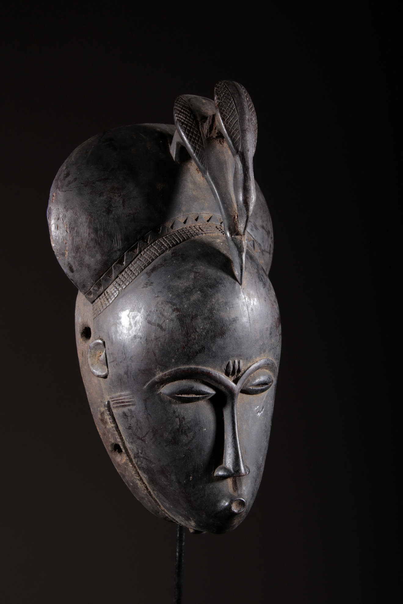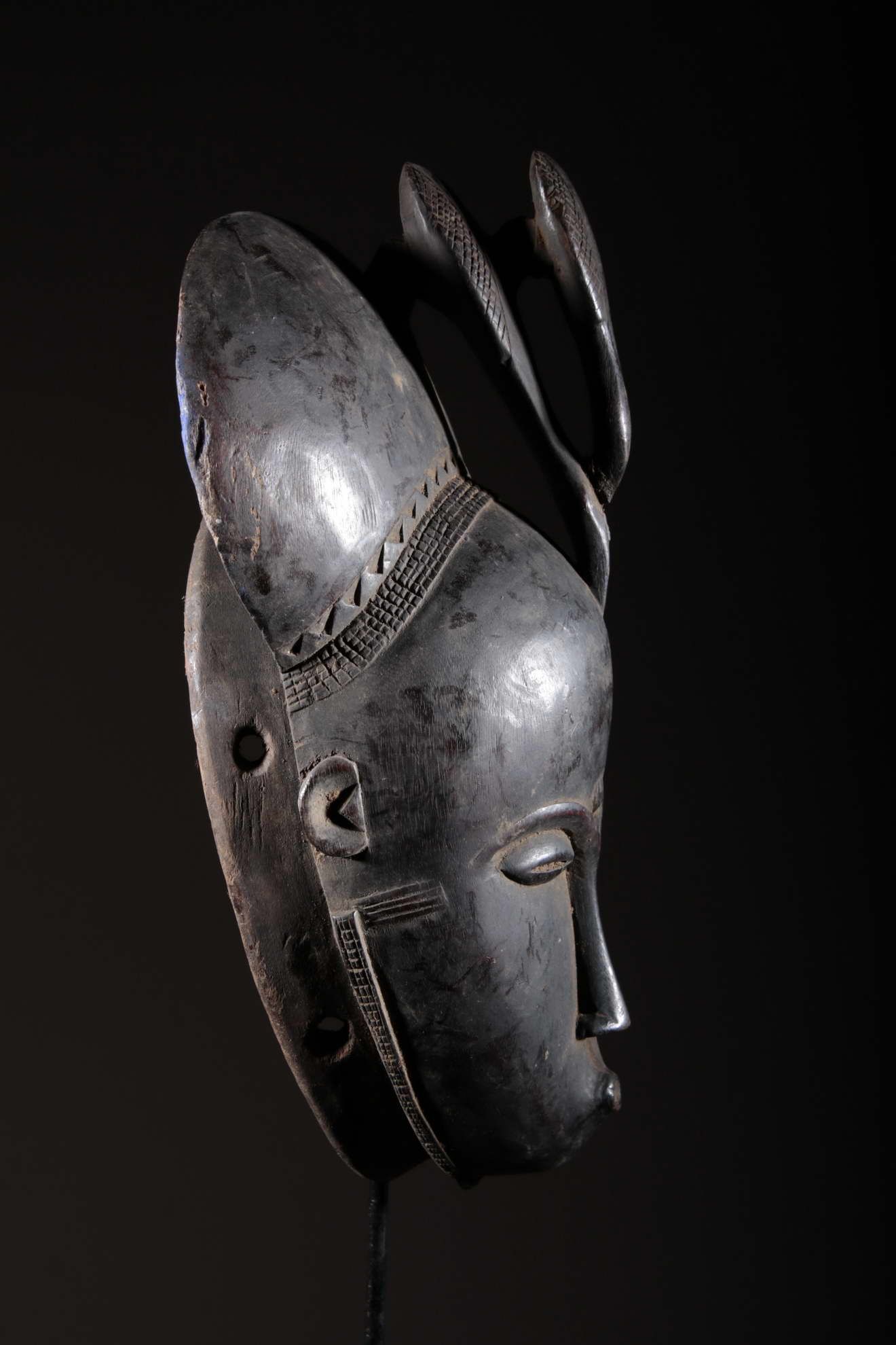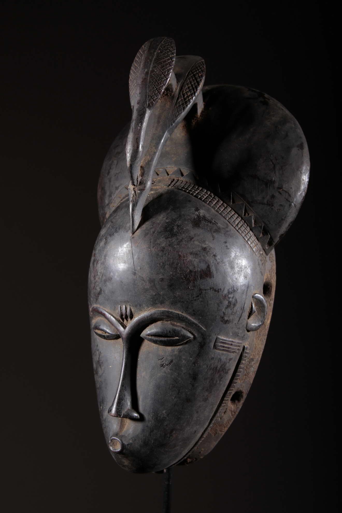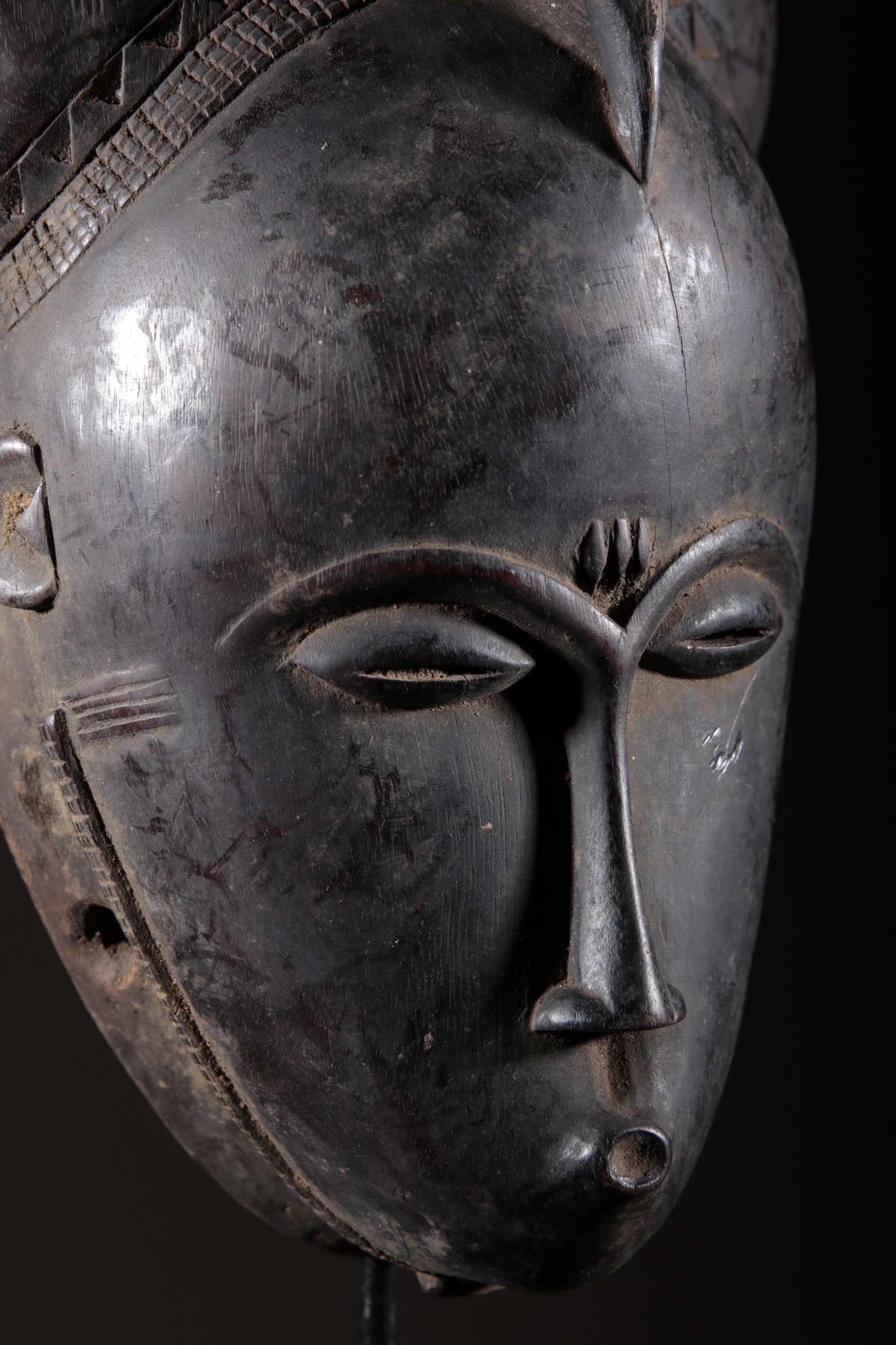 Les Yaouré sont divisés en trois groupes principaux rassemblant chacun une vingtaine de villages. Chaque village est dirigé par un chef, assisté par un conseil des anciens. La langue, la religion, la culture et l'art yaouré sont influencés par leurs puissants voisins les Baoulé et les Gouro. Cependant, ils possèdent un grand sens identitaire et ont créé un art caractéristique et rafiné.Chez les Yohouré ou Yaouré, les masques africains servent à influencer les forces surnaturelles 'YU' responsables des maux des hommes mais aussi de leur prospérité. Les masques dans cette ethnie sont interdits aux femmes, ils sont dansés le plus souvent pour rétablir le déséquilibre social et politique que peut entrainer le décès. Les Yohourés ont influencé les Baoulés en ce qui concerne l'esthétique des masques et ont été eux-mêmes influencés par le style Gouro. Sur ce masque le nez et la chevelure rappellent les masques Gu des Gouro. La chevelure est disposée en trois demi-cercles très travaillés : cela est le signe chez les Yohouré de pouvoir et de richesse*. Les masques de cette ethnie dégagent une sérénité, une douceur qui sont dûs à des conditions de vie relativement clémentes (climat et agriculture favorisés par la région lagunaire boisée qu'ils occupent). Les masques Yohouré sont souvent entourés d'une bordure dentelée caractéristique qui structure le masque et souligne l'harmonie générale des formes.