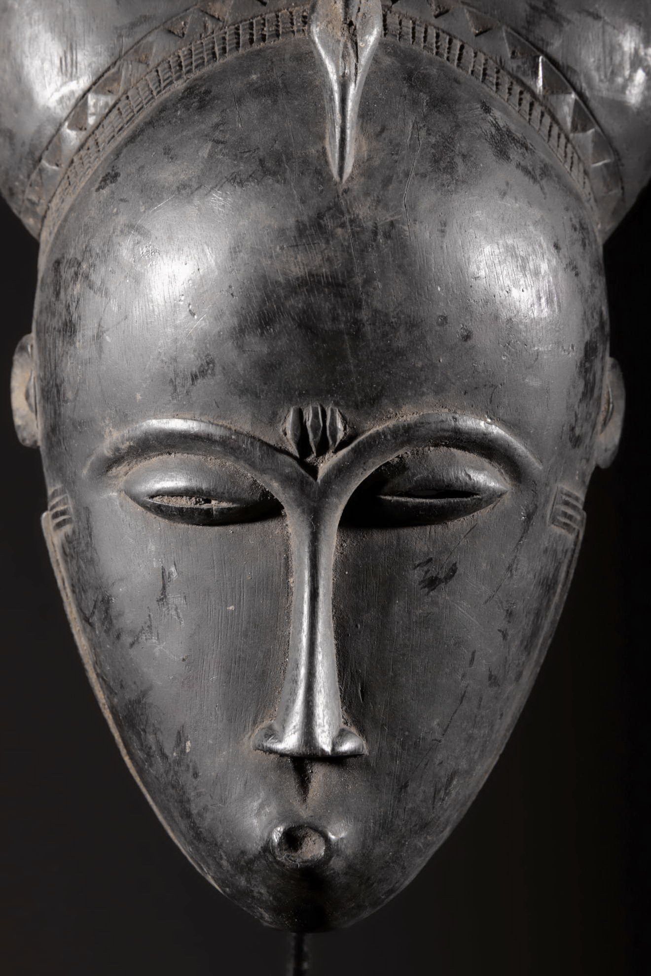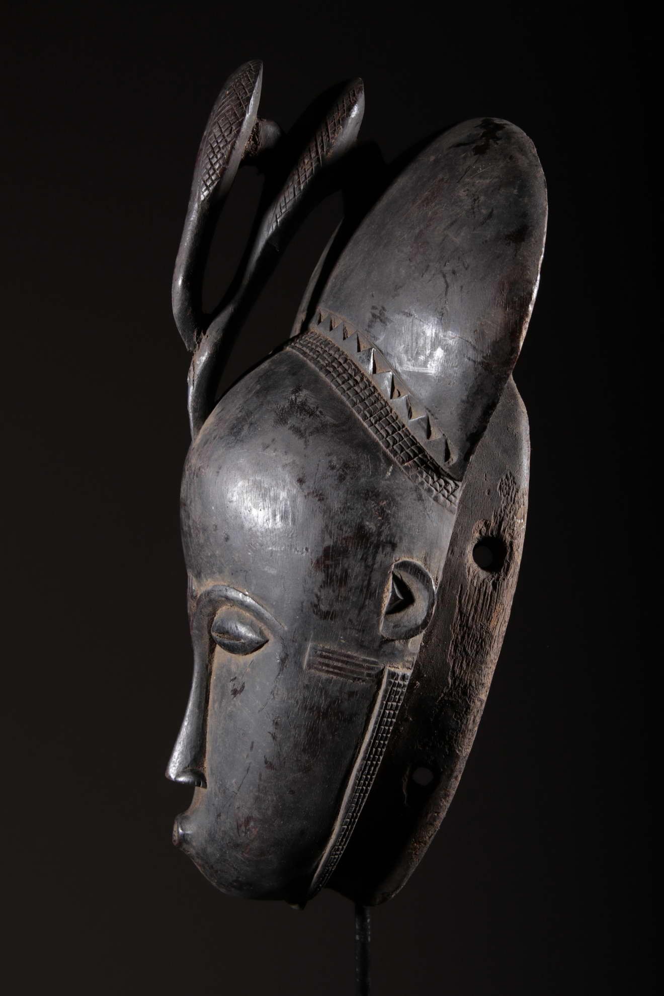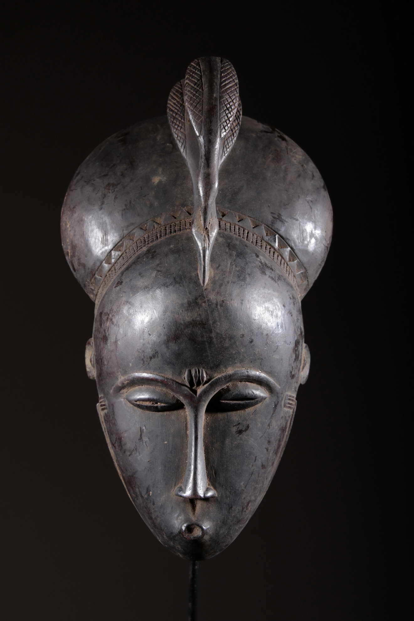 Les Yaouré sont divisés en trois groupes principaux rassemblant chacun une vingtaine de villages. Chaque village est dirigé par un chef, assisté par un conseil des anciens. La langue, la religion, la culture et l'art yaouré sont influencés par leurs puissants voisins les Baoulé et les Gouro. Cependant, ils possèdent un grand sens identitaire et ont créé un art caractéristique et rafiné.Chez les Yohouré ou Yaouré, les masques africains servent à influencer les forces surnaturelles 'YU' responsables des maux des hommes mais aussi de leur prospérité. Les masques dans cette ethnie sont interdits aux femmes, ils sont dansés le plus souvent pour rétablir le déséquilibre social et politique que peut entrainer le décès. Les Yohourés ont influencé les Baoulés en ce qui concerne l'esthétique des masques et ont été eux-mêmes influencés par le style Gouro. Sur ce masque le nez et la chevelure rappellent les masques Gu des Gouro. La chevelure est disposée en trois demi-cercles très travaillés : cela est le signe chez les Yohouré de pouvoir et de richesse*. Les masques de cette ethnie dégagent une sérénité, une douceur qui sont dûs à des conditions de vie relativement clémentes (climat et agriculture favorisés par la région lagunaire boisée qu'ils occupent). Les masques Yohouré sont souvent entourés d'une bordure dentelée caractéristique qui structure le masque et souligne l'harmonie générale des formes.