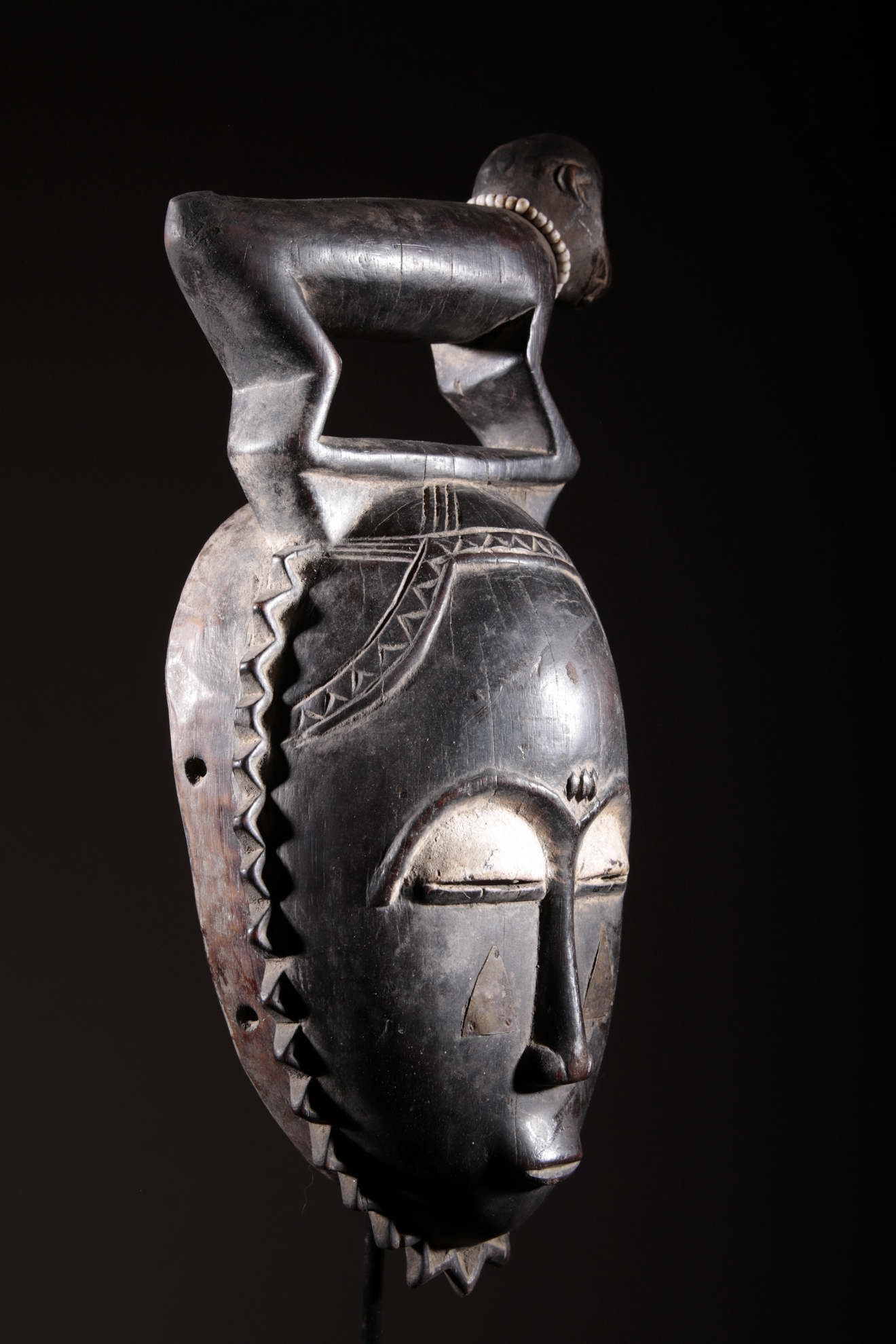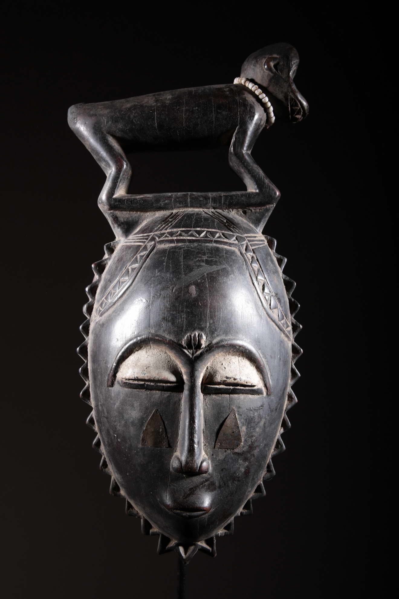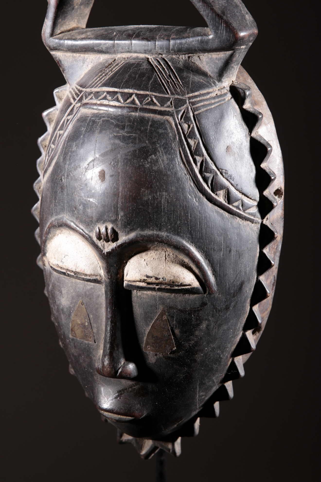Les Yaouré sont divisés en trois groupes principaux rassemblant chacun une vingtaine de villages. Chaque village est dirigé par un chef, assisté par un conseil des anciens. La langue, la religion, la culture et l'art yaouré sont influencés par leurs puissants voisins les Baoulé et les Gouro. Cependant, ils possèdent un grand sens identitaire et ont créé un art caractéristique et rafiné.Chez les Yohouré ou Yaouré, les masques africains servent à influencer les forces surnaturelles 'YU' responsables des maux des hommes mais aussi de leur prospérité. Les masques dans cette ethnie sont interdits aux femmes, ils sont dansés le plus souvent pour rétablir le déséquilibre social et politique que peut entrainer le décès. Les Yohourés ont influencé les Baoulés en ce qui concerne l'esthétique des masques et ont été eux-mêmes influencés par le style Gouro. Sur ce masque le nez et la chevelure rappellent les masques Gu des Gouro. La chevelure est disposée en trois demi-cercles très travaillés : cela est le signe chez les Yohouré de pouvoir et de richesse*. Les masques de cette ethnie dégagent une sérénité, une douceur qui sont dûs à des conditions de vie relativement clémentes (climat et agriculture favorisés par la région lagunaire boisée qu'ils occupent). Les masques Yohouré sont souvent entourés d'une bordure dentelée caractéristique qui structure le masque et souligne l'harmonie générale des formes.