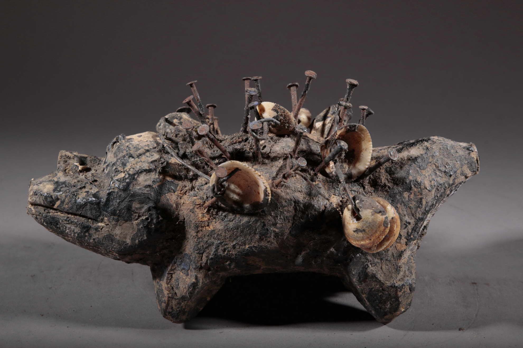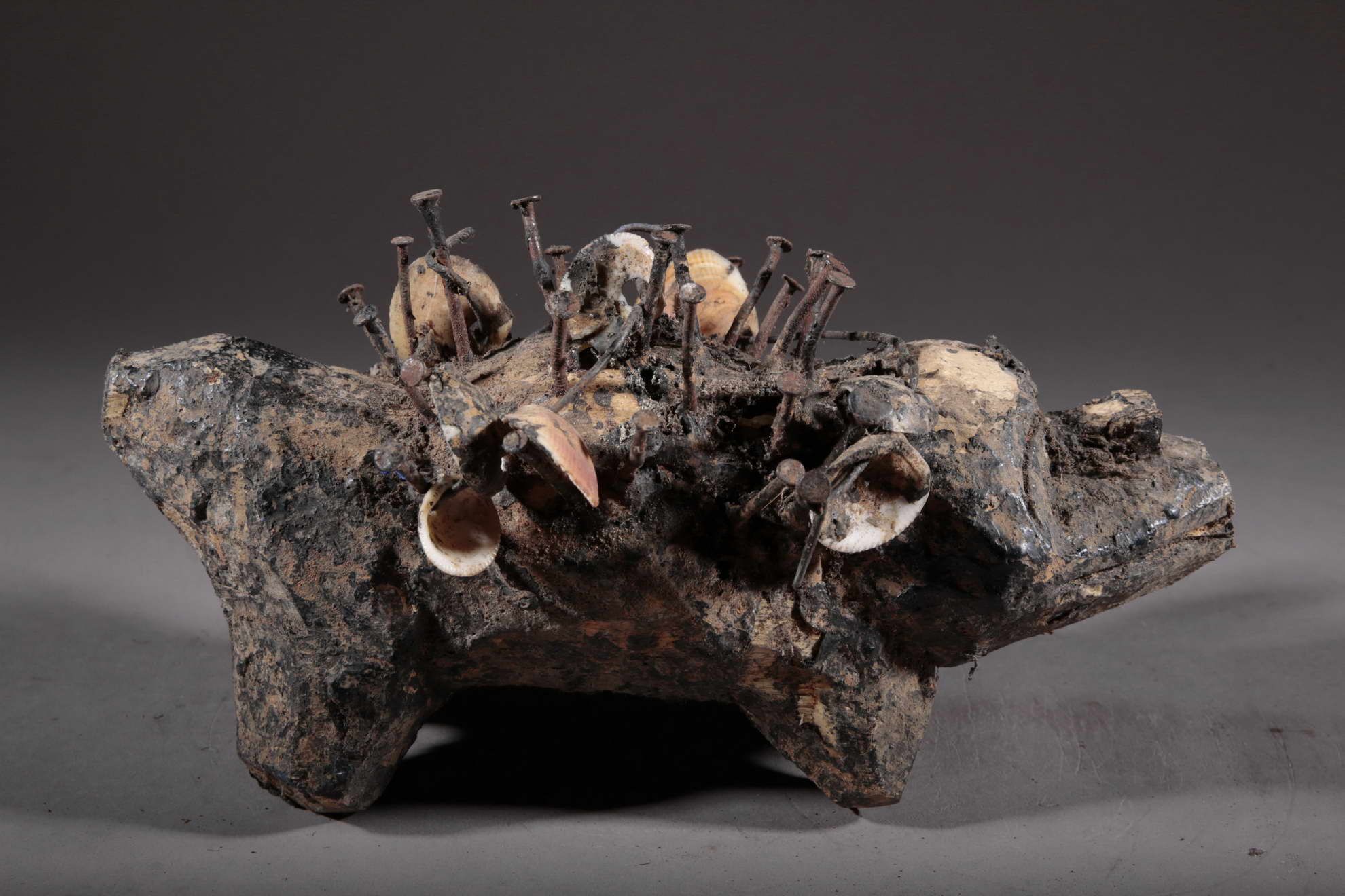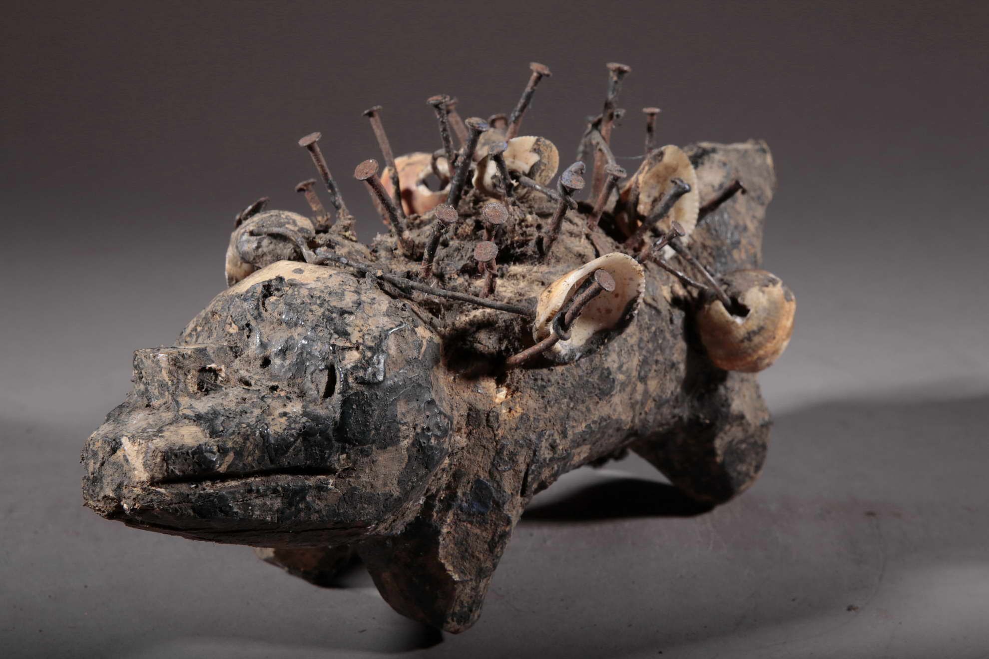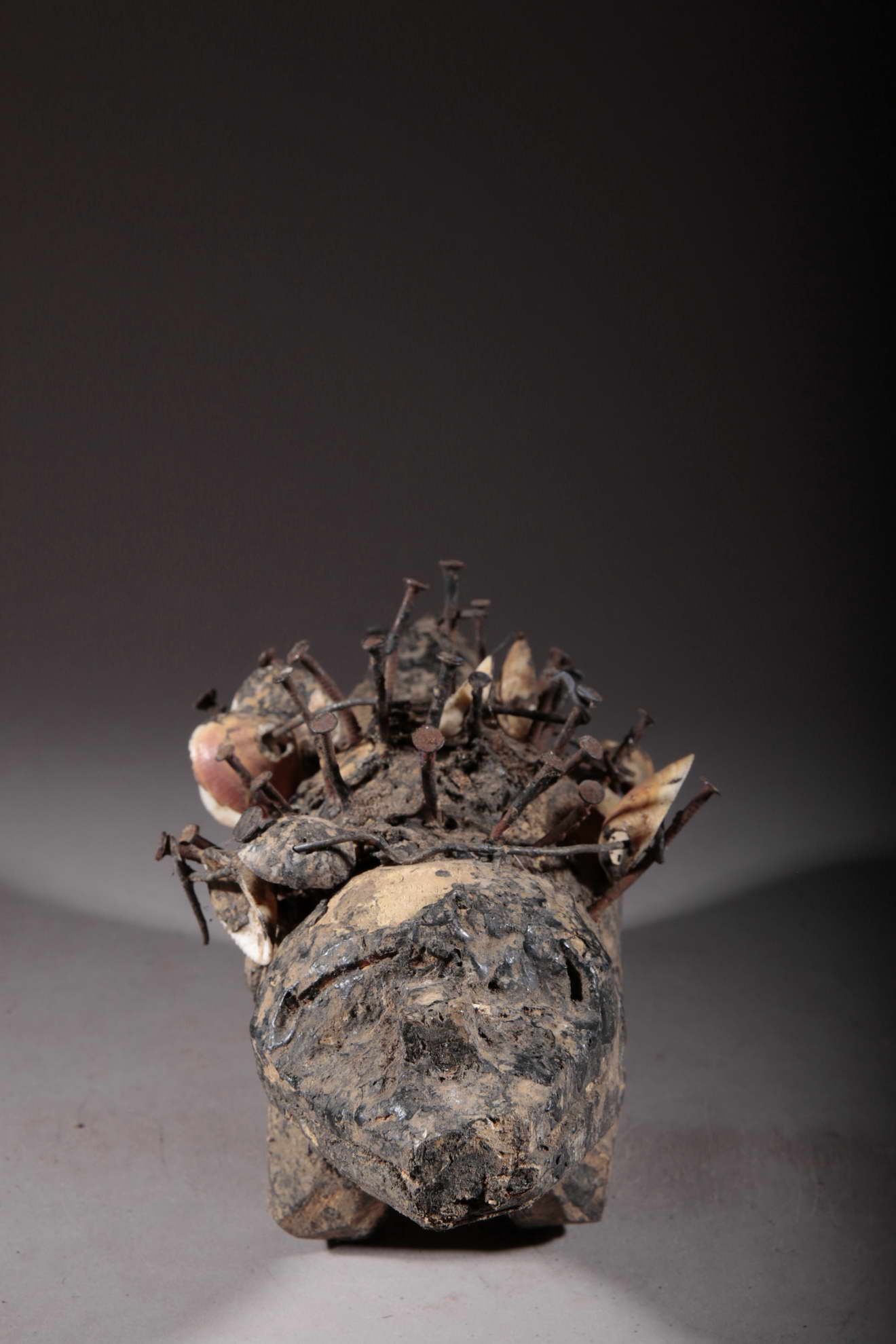 Chez les Kongo, les minkisi (sing. nkisi) constituent probablement la classe d’esprits la plus étendue. Elle a donné lieu jusqu’à aujourd’hui à la production de très nombreuses sculptures qui sont de véritables « objets-force » destinés à agir sur le monde et sur tous les êtres qui le peuplent. Les minkisi anthropomorphes n’en constituent qu’une fraction, sans doute la plus connue car elle attira de tout temps l’intérêt des ethnographes et des collectionneurs. S’ils sont sculptés par des artistes, ils ne seront sacralisés, mis en forme, « armés » de substances magiques et manipulés que par des spécialistes du rituel que l’on appelle nganga. Ceux-ci sont reconnus socialement dans la culture kongo comme utiles. Ils répondent aux diverses demandes d’individus qui se sentent affligés ou menacés par des esprits maléfiques. Par exemple, un nganga utilisera ses minkisi pour redonner à un chasseur du succès à la chasse, pour trouver et neutraliser un ensorceleur qui menace la vie de son client ou encore pour protéger un village des vols et des agressions. Certains servent à régler des conflits entre personnes, entre familles ou entre clans. Parmi tous les types de minkisi, les minkisi nkondi sont reconnus comme étant les objets-force les plus agressifs, pouvant être utilisés pour des attaques violentes susceptibles d’entraîner la mort. Ils ont pour signe distinctif un bras brandissant un couteau ou une lance. Les nombreux clous qui recouvrent la surface de ces objets n’étaient pas en rapport avec le mal que l’on voulait faire à leurs victimes, mais bien avec la douleur que l’on voulait infliger à l’esprit du nkisi afin que celui-ci se fâche et se mette à poursuivre et à persécuter la victime désignée ! Lors du rituel d’invocation de l’esprit, le nganga pouvait également jeter de l’eau-de-vie ou de la poudre à fusil aux yeux de la figure pour l’irriter davantage et aussi l’insulter. Les substances magiques les plus importantes, dont les aspects symboliques se réfèrent aux qualités de l’esprit, se trouvent encapsulées derrière un miroir sur l’abdomen. Les miroirs, comme l’argile blanche ou l’ouverture de certains coquillages marins, renvoient au monde des ancêtres, monde virtuel sous la surface de l’eau, inverse du monde des vivants.
