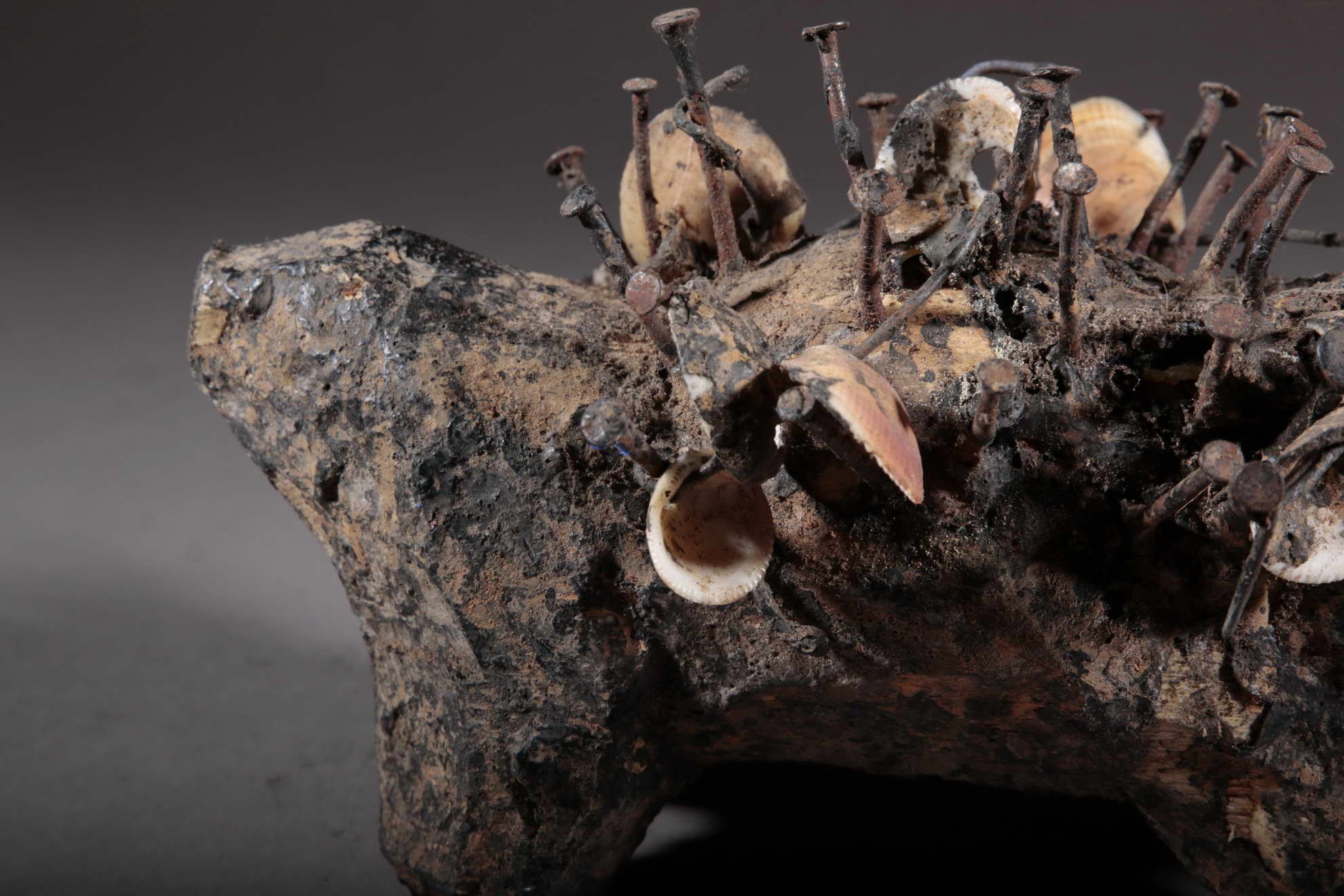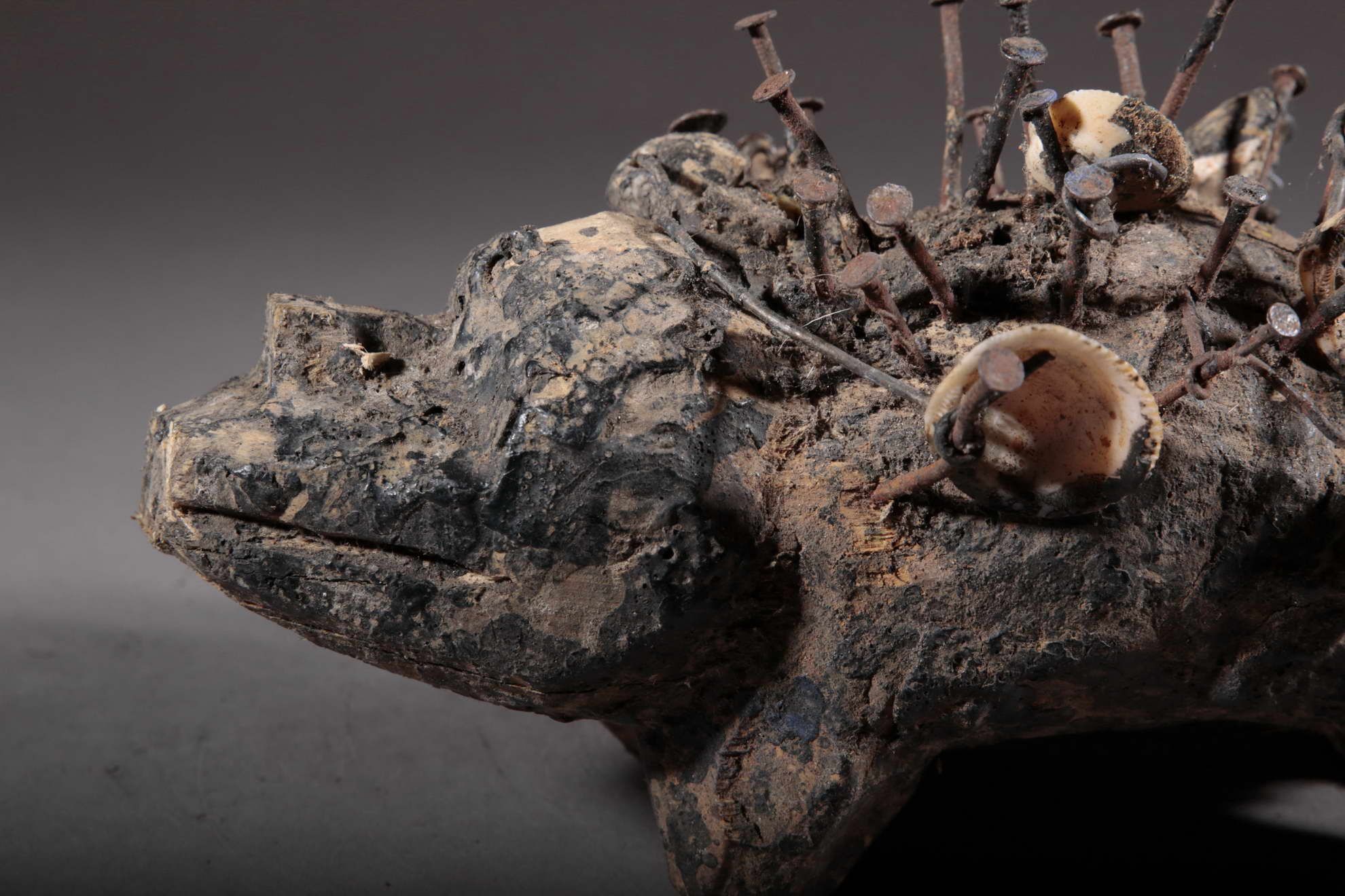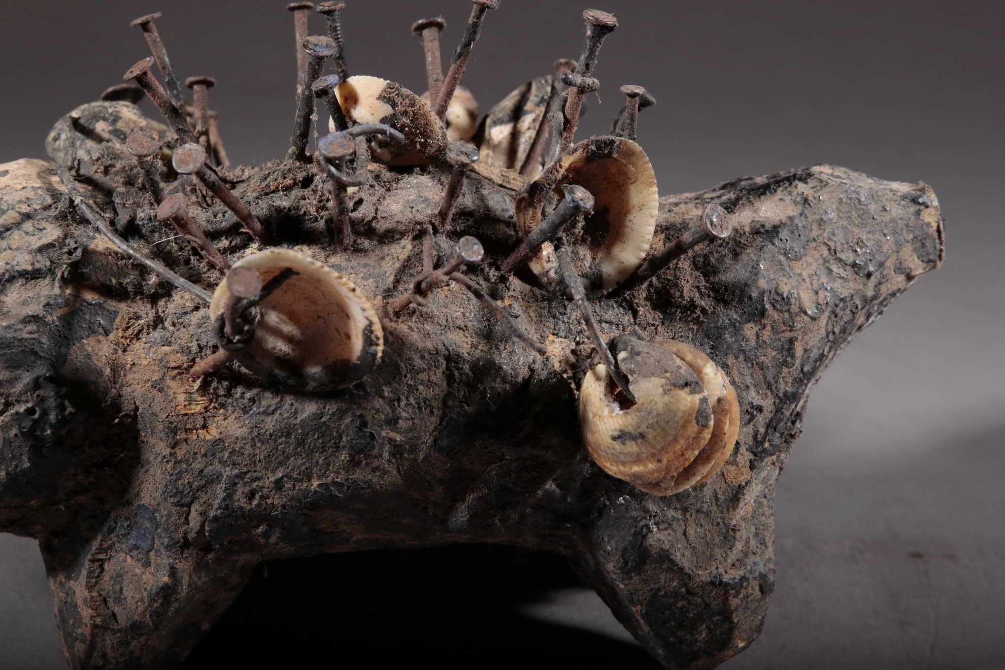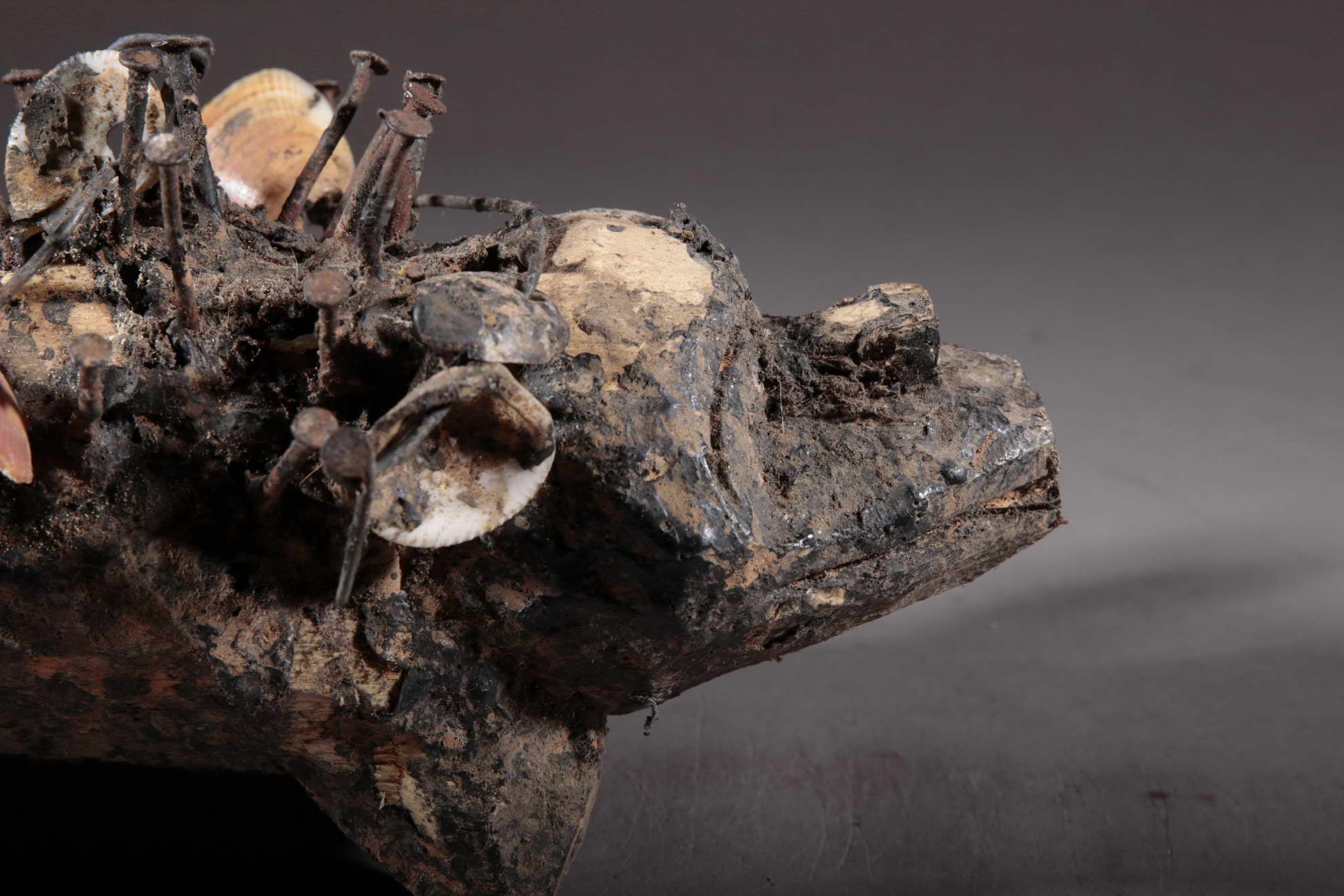 Chez les Kongo, les minkisi (sing. nkisi) constituent probablement la classe d’esprits la plus étendue. Elle a donné lieu jusqu’à aujourd’hui à la production de très nombreuses sculptures qui sont de véritables « objets-force » destinés à agir sur le monde et sur tous les êtres qui le peuplent. Les minkisi anthropomorphes n’en constituent qu’une fraction, sans doute la plus connue car elle attira de tout temps l’intérêt des ethnographes et des collectionneurs. S’ils sont sculptés par des artistes, ils ne seront sacralisés, mis en forme, « armés » de substances magiques et manipulés que par des spécialistes du rituel que l’on appelle nganga. Ceux-ci sont reconnus socialement dans la culture kongo comme utiles. Ils répondent aux diverses demandes d’individus qui se sentent affligés ou menacés par des esprits maléfiques. Par exemple, un nganga utilisera ses minkisi pour redonner à un chasseur du succès à la chasse, pour trouver et neutraliser un ensorceleur qui menace la vie de son client ou encore pour protéger un village des vols et des agressions. Certains servent à régler des conflits entre personnes, entre familles ou entre clans. Parmi tous les types de minkisi, les minkisi nkondi sont reconnus comme étant les objets-force les plus agressifs, pouvant être utilisés pour des attaques violentes susceptibles d’entraîner la mort. Ils ont pour signe distinctif un bras brandissant un couteau ou une lance. Les nombreux clous qui recouvrent la surface de ces objets n’étaient pas en rapport avec le mal que l’on voulait faire à leurs victimes, mais bien avec la douleur que l’on voulait infliger à l’esprit du nkisi afin que celui-ci se fâche et se mette à poursuivre et à persécuter la victime désignée ! Lors du rituel d’invocation de l’esprit, le nganga pouvait également jeter de l’eau-de-vie ou de la poudre à fusil aux yeux de la figure pour l’irriter davantage et aussi l’insulter. Les substances magiques les plus importantes, dont les aspects symboliques se réfèrent aux qualités de l’esprit, se trouvent encapsulées derrière un miroir sur l’abdomen. Les miroirs, comme l’argile blanche ou l’ouverture de certains coquillages marins, renvoient au monde des ancêtres, monde virtuel sous la surface de l’eau, inverse du monde des vivants.