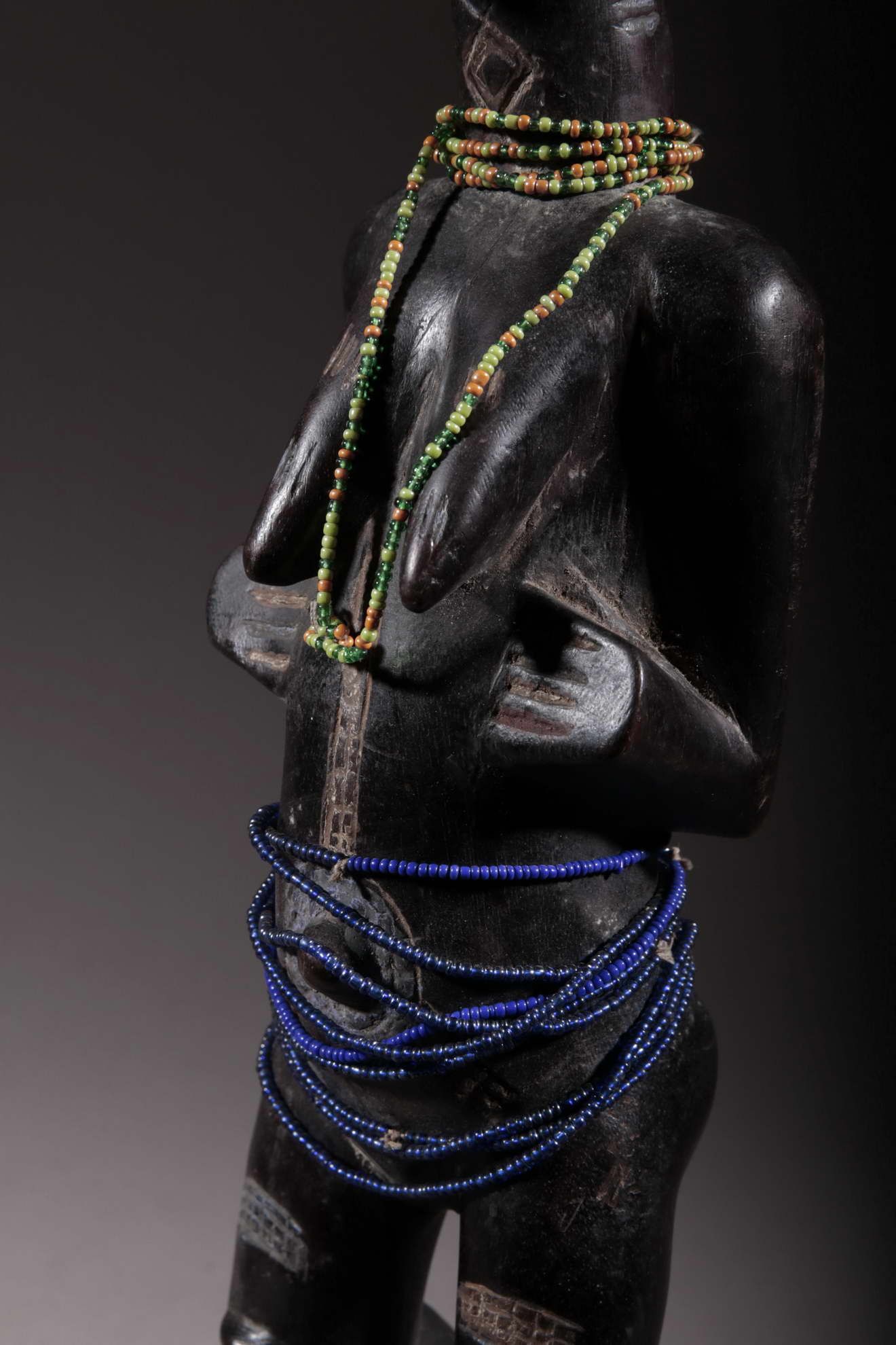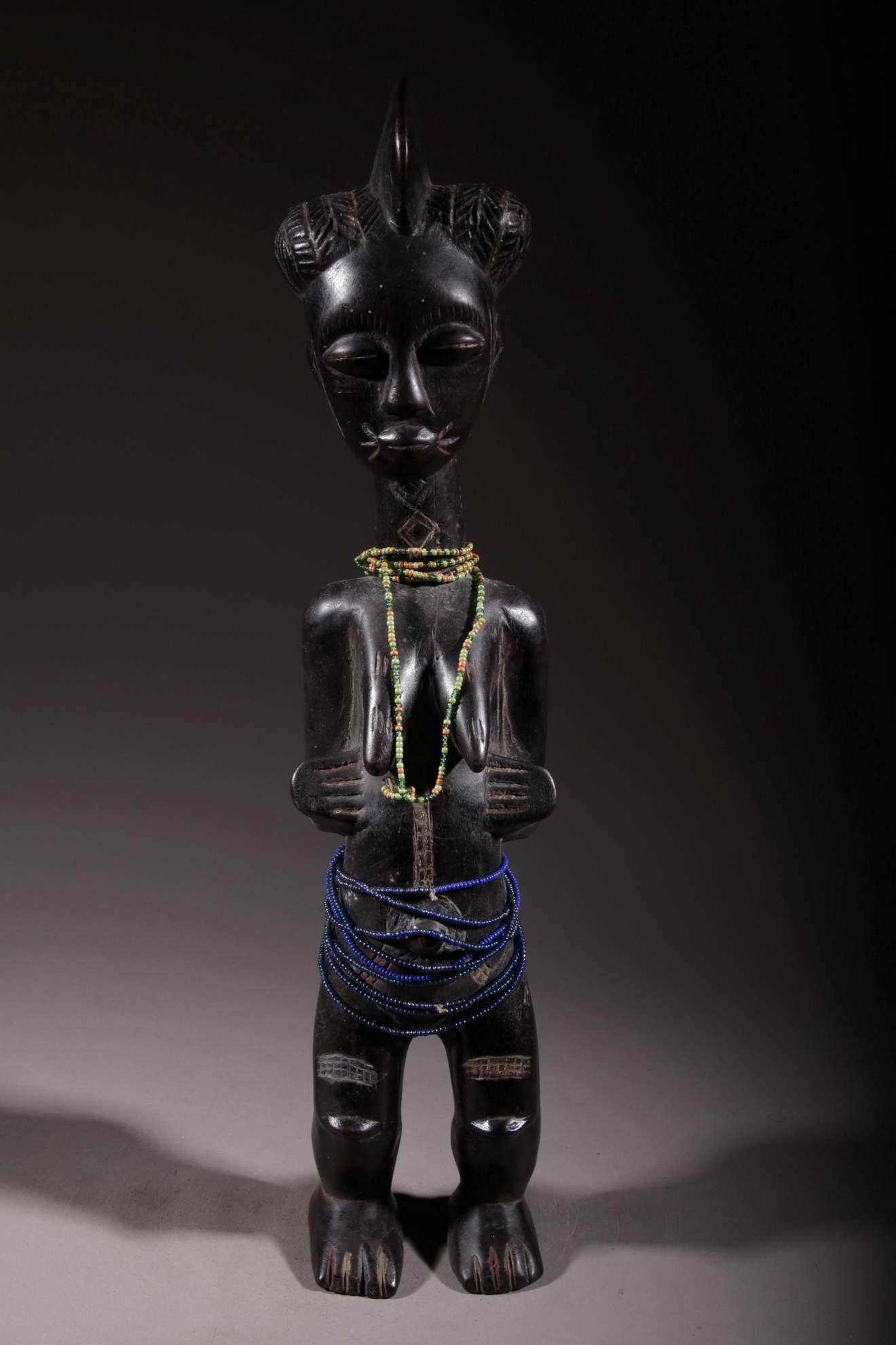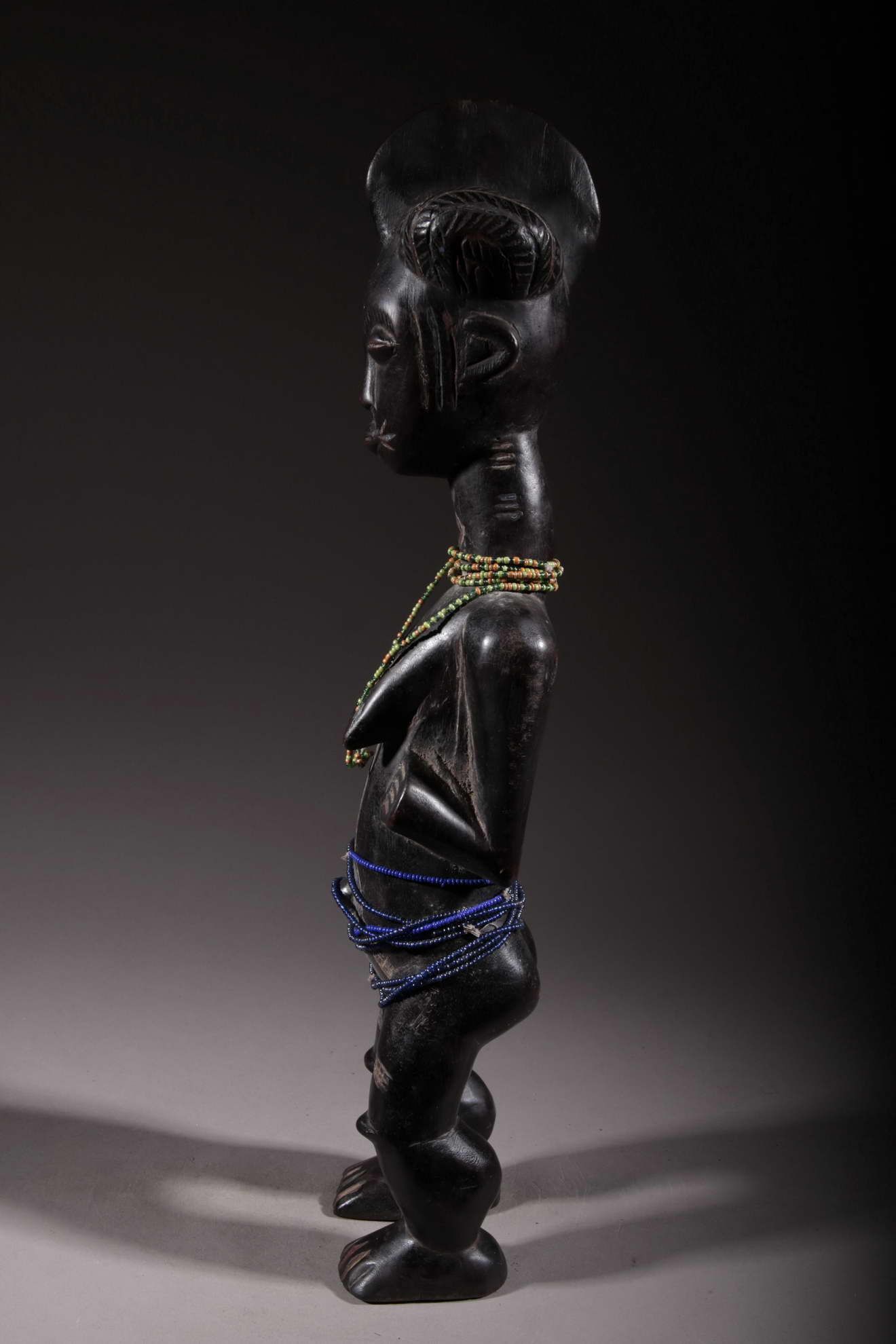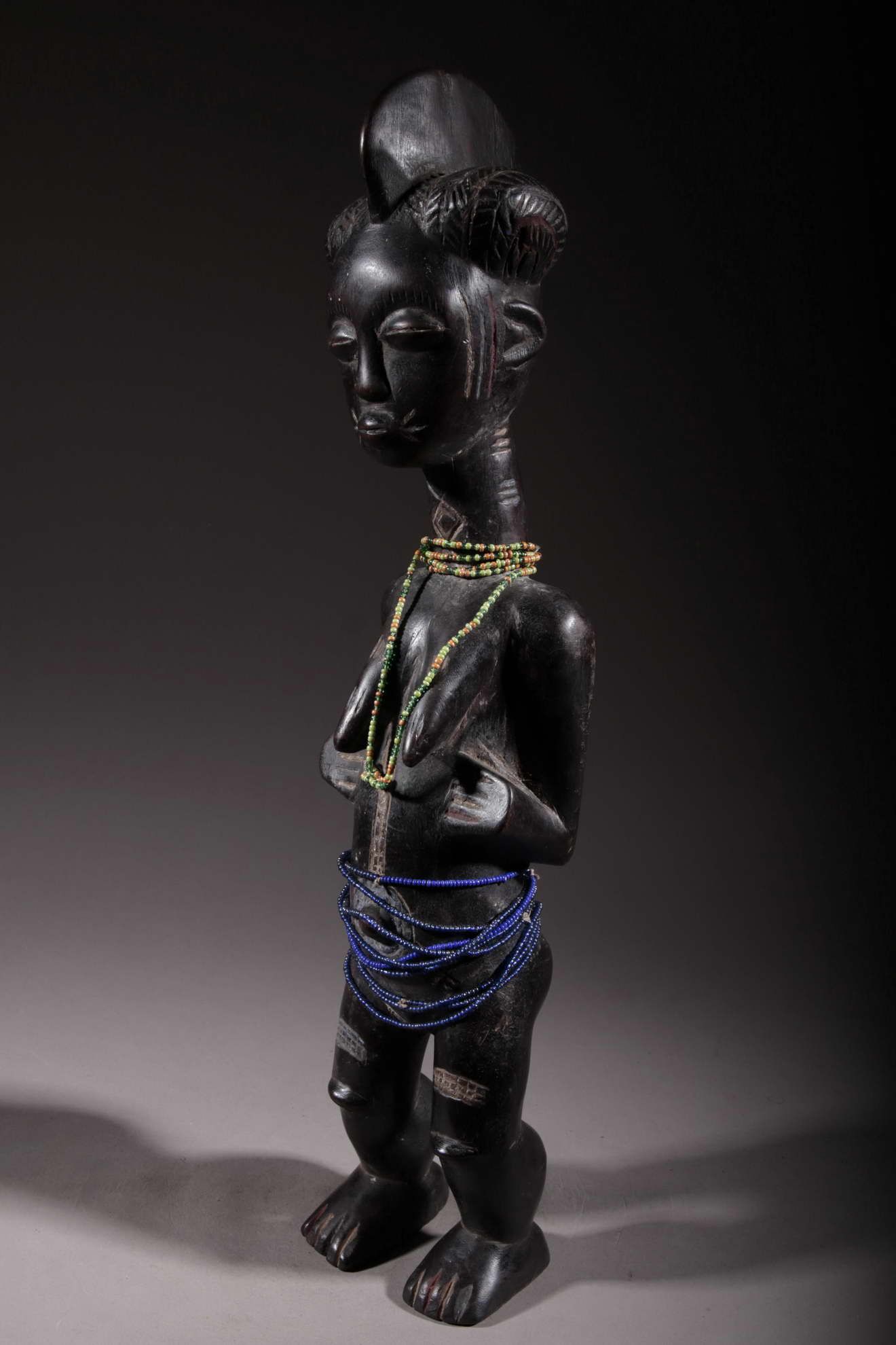 - les proportions du corps sont proches de celles des ancêtres Baoulé (jambes courtes, bras le long du corps, proportions de la tête importantes par rapport au reste du corps, importance du nombril)