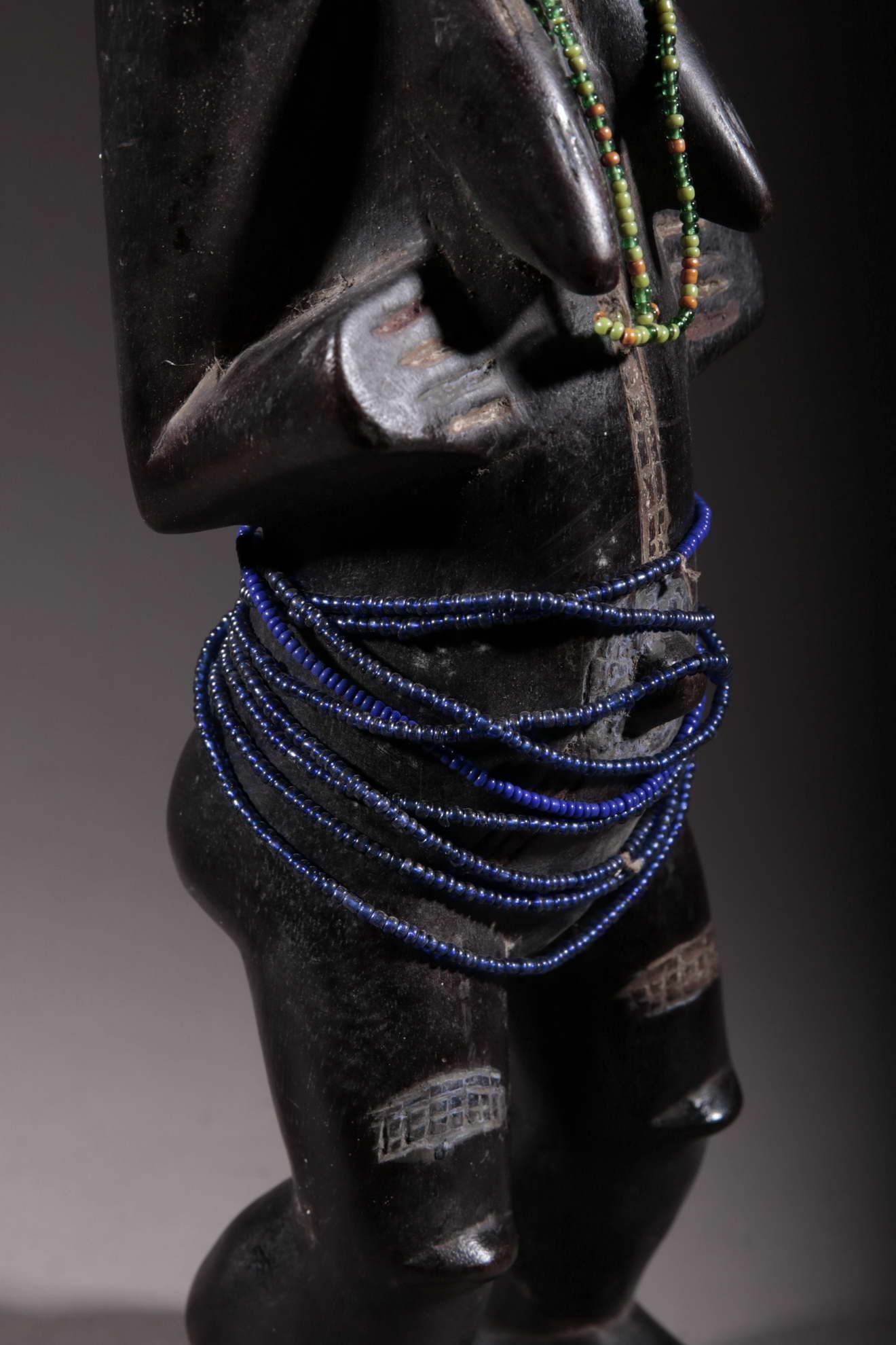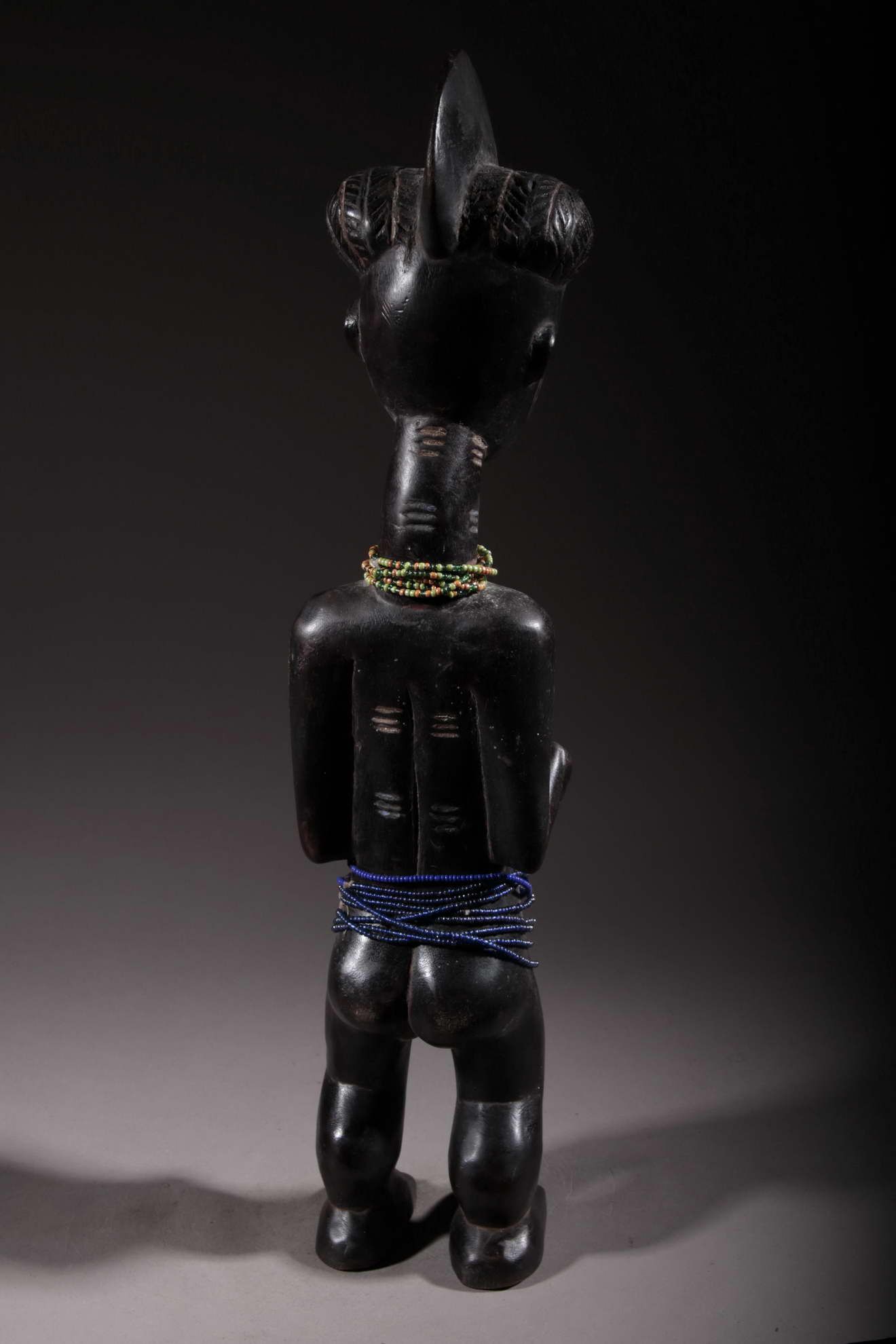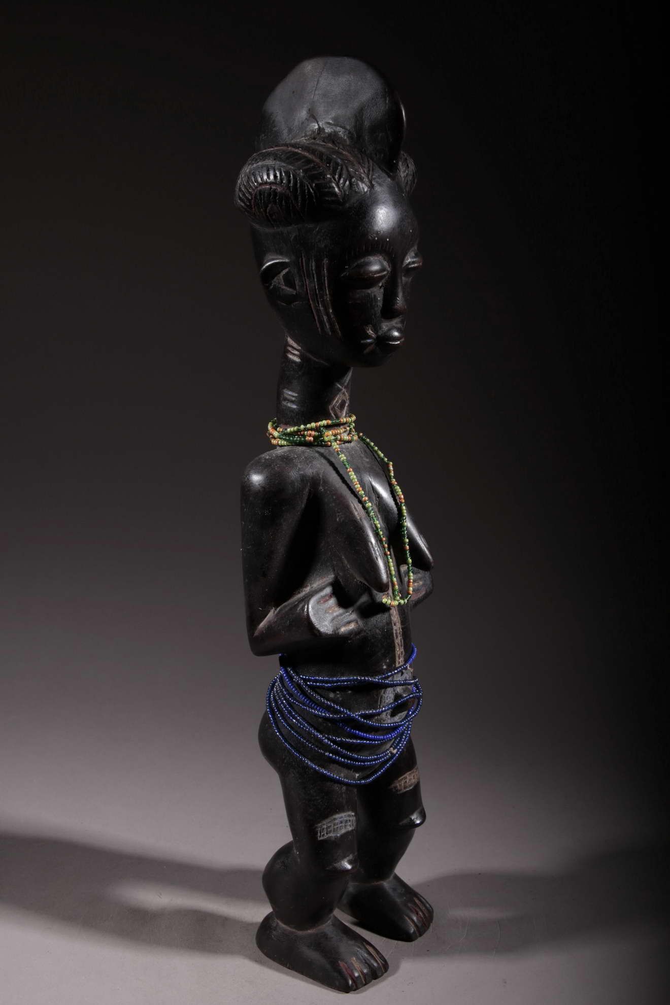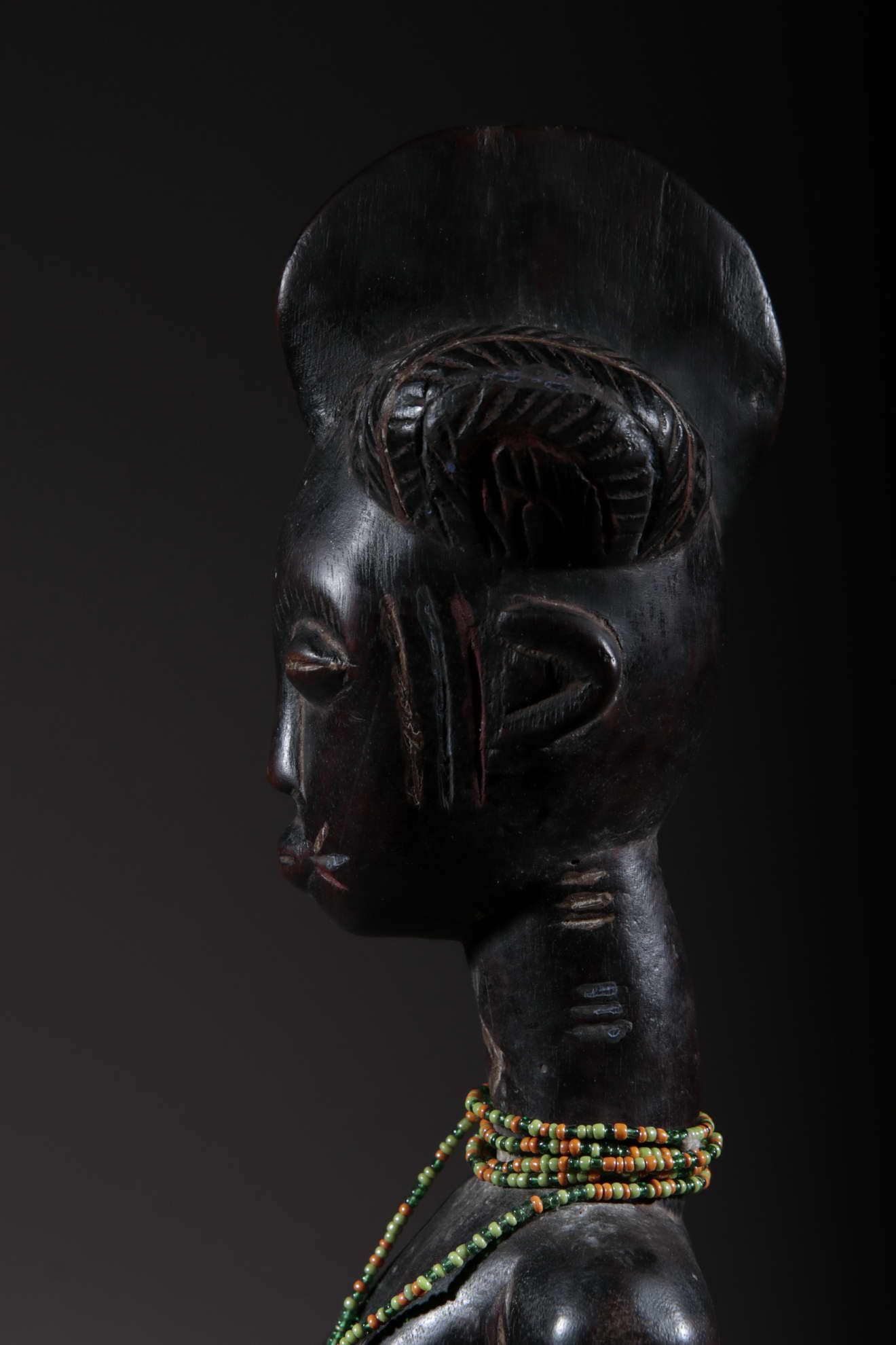 - les proportions du corps sont proches de celles des ancêtres Baoulé (jambes courtes, bras le long du corps, proportions de la tête importantes par rapport au reste du corps, importance du nombril)