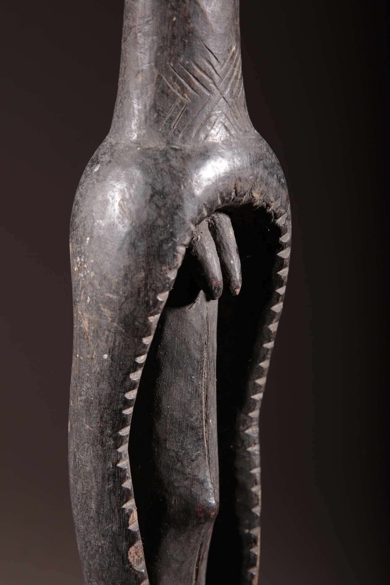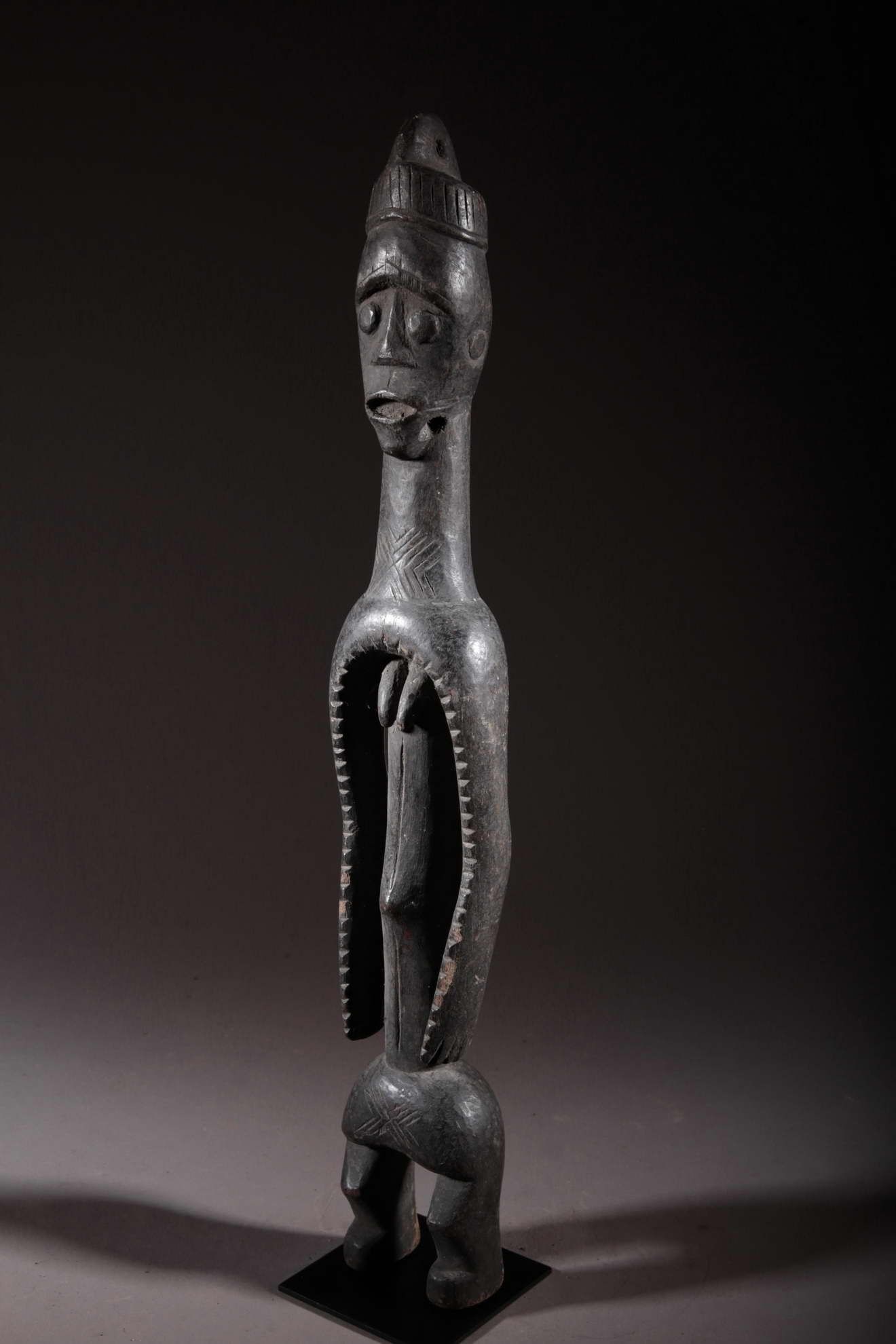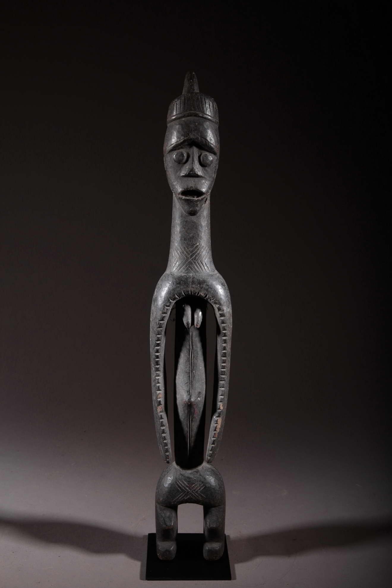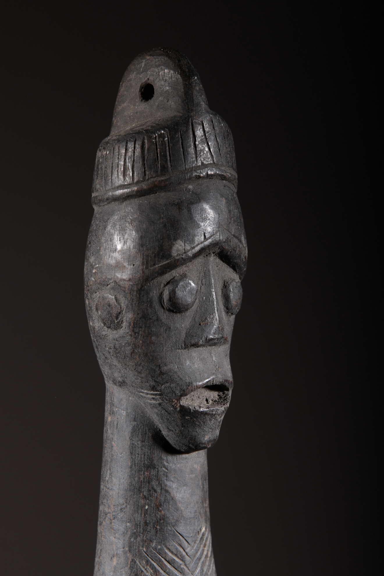 Cette statue est une figure oraculaire et guérisseuse. Elle est typique du style mumuye : mince avec un corps allongé et une petite tête, un torse et des bras longs et des jambes très courtes. C’est une « figure parlante », qui était probablement dressée à l’extérieure d’une case ou à l’intérieur d’un bâtiment. Elle sert à révéler l’identité des voleurs et autres malfaiteurs. Un jus de plante médicinale était badigeonné sur la bouche de la statue, qui « parlait » alors à l’être humain à l’écoute, comme un oracle. Les statues mumuye étaient également utilisées pour les rites de guérison lors d’épidémies telles que la variole.