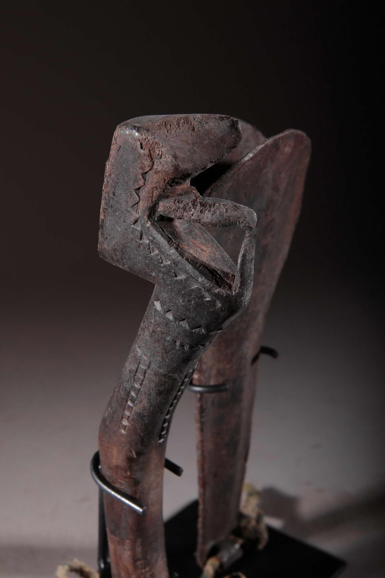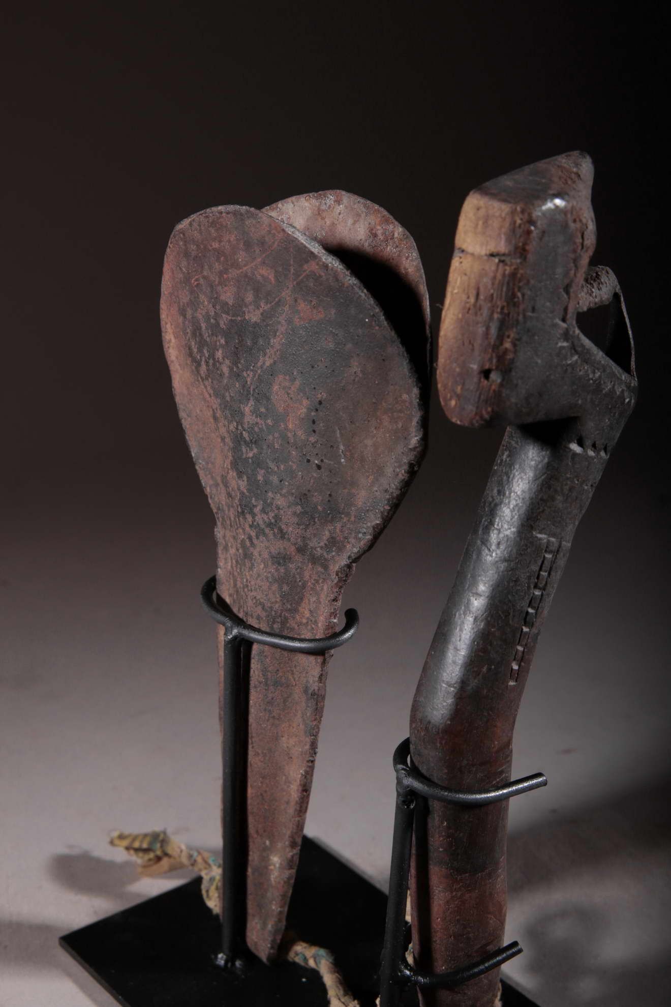 Chez les Baoule, il existe plusieurs techniques de divination, certaines simples par le matériel employé, bien que complexes pour l’analyse, comme le « jet de lacets ». Mais, sur le plan de la théâtralité et de la création plastique, la plus spectaculaire fait intervenir des devins-danseurs, les komyenfwé, qui, possédés par des génies de la nature, servent d’intermédiaires entre les esprits et le monde du village. On les appelle aussi awèfwè (« êtres des frontières », celles qui séparent le visible de l’invisible). Lors de leurs cérémonies de transes, quand les esprits qui les investissent parlent par leur entremise, ils se servent d’instruments rituels, plats en terre, hochets en forme de gourde, et surtout gongs de métal qu’ils frappent pour « réveiller » les génies, les faire surgir de la brousse et de leur torpeur, à l’aide, miracle de l’art, d’un marteau en bois décoré. Ces objets sont nommés lawlé waka. Plus le devin est réputé, plus son matériel religieux est ouvragé, comme en témoignent certains objets qui ont appartenu à des collections occidentales, notamment le marteau de l’ancienne collection d’Helena Rubinstein, qui, j’en suis persuadé, est le plus éblouissant de tous ceux que j’ai pu voir, en trente ans de fréquentation du peuple baule. Est-ce pour faire oublier que cette pièce reste un simple instrument de percussion ? En fait, loin d’être surajoutée à la partie fonctionnelle, la figure est insérée, en une évidence plastique. Son hiératisme, très relatif, s’harmonise avec le demi-cercle du heurtoir à l’intérieur duquel elle s’inscrit, mais aussi avec les torsades de la poignée au sommet de laquelle elle se dresse, souveraine, comme sur un piédestal, comme pour mieux se dégager de la spirale qui l’entraîne, avec un étagement des plans qui mène graduellement le regard vers la figure sommitale.