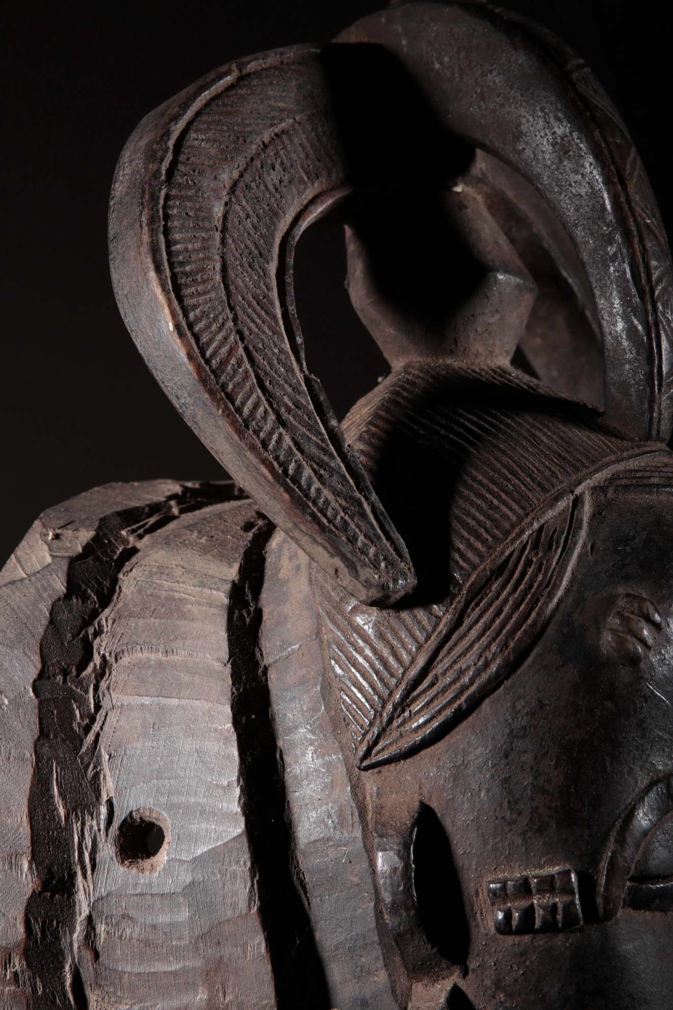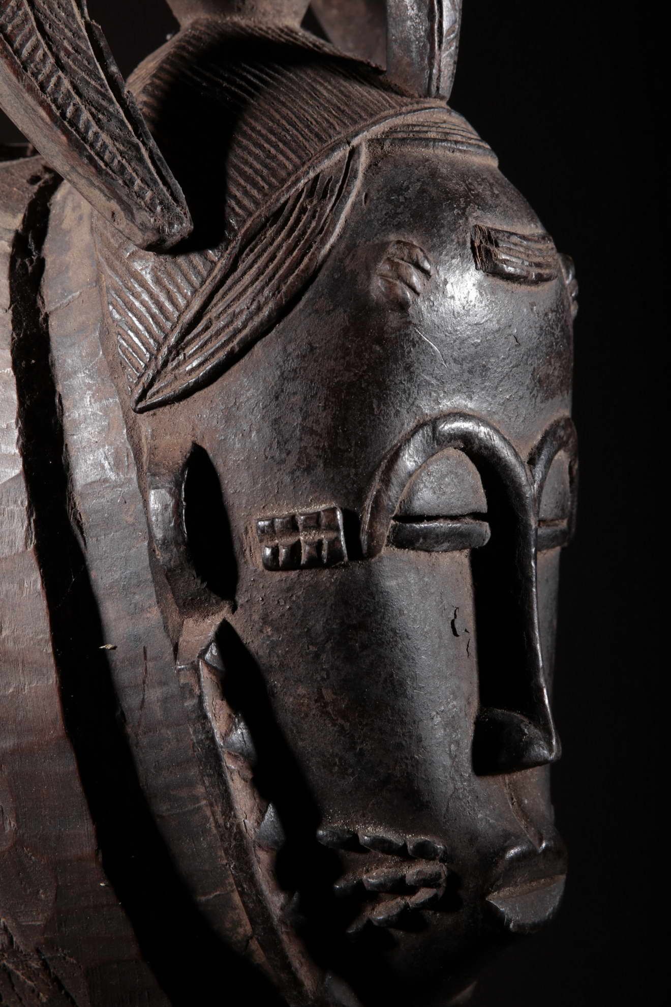 Autrement il existe des masques Baoulé zoomorphes, rappelant le buffle et l’antilope. Ces masques sont toujours portés par des hommes. Ils ont une réalisation différente des masques Baoulé portraits d’ancêtres, ils sont plus conceptuels et schématiques car ils représentent des esprits.