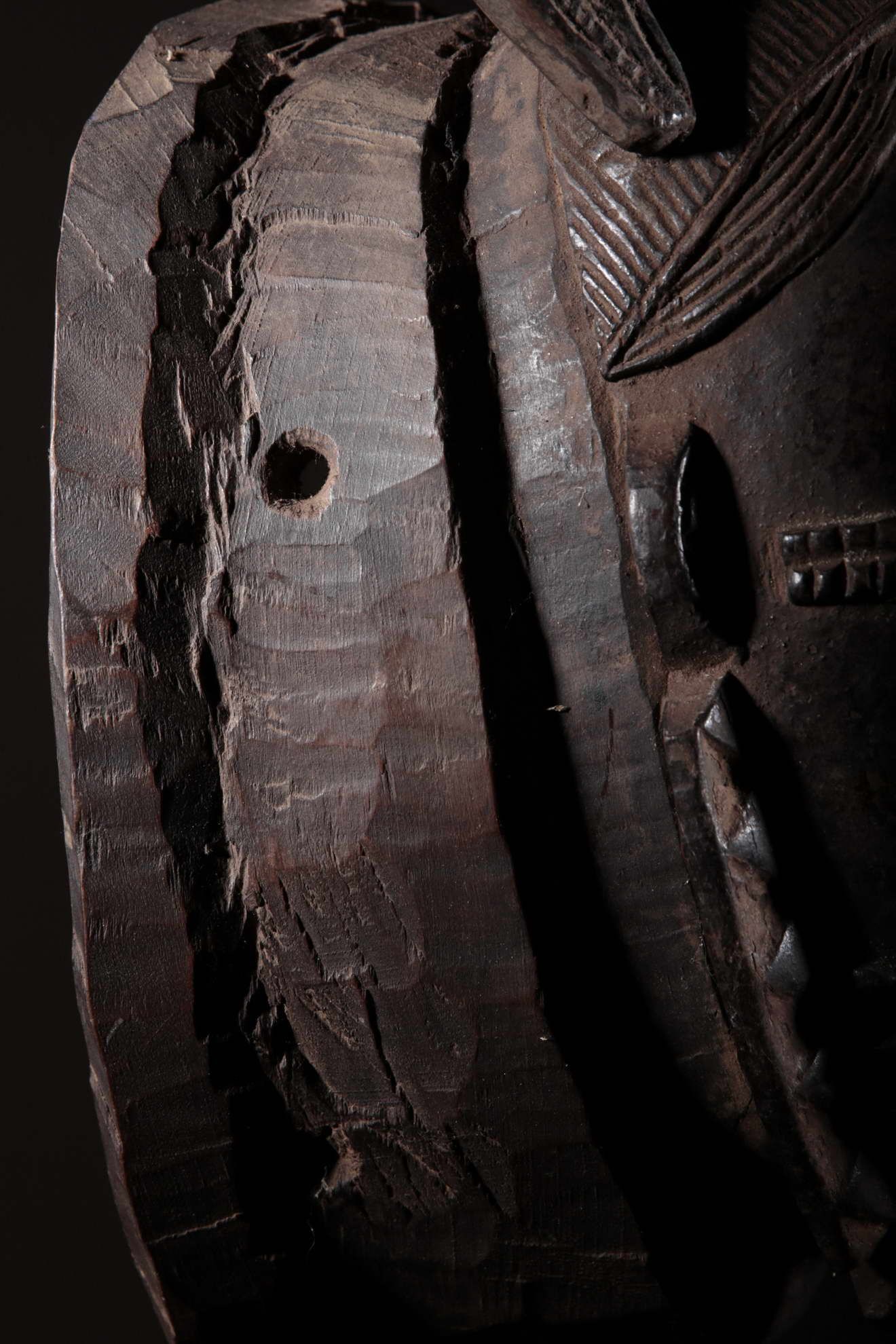 Le gba gba, d’origine Gouro, est employé pour des funérailles de femmes lors de la période des récoltes. Il célèbre la beauté et l’âge, d’où la finesse de ses traits.