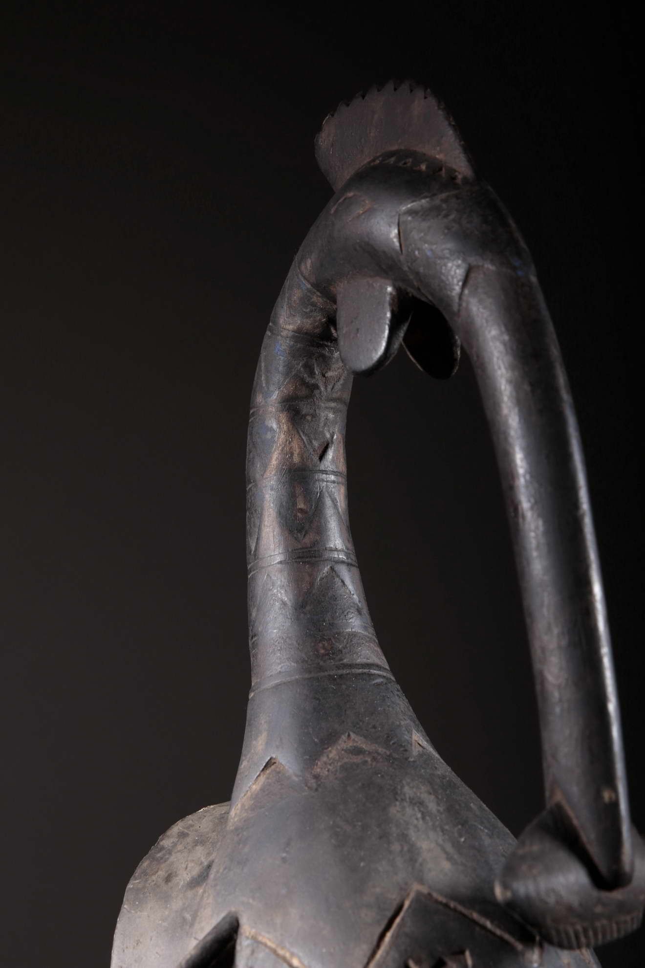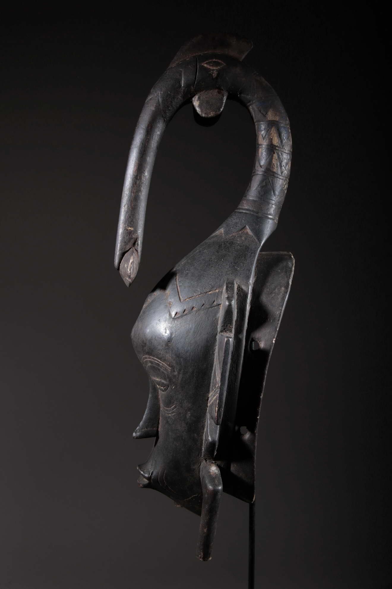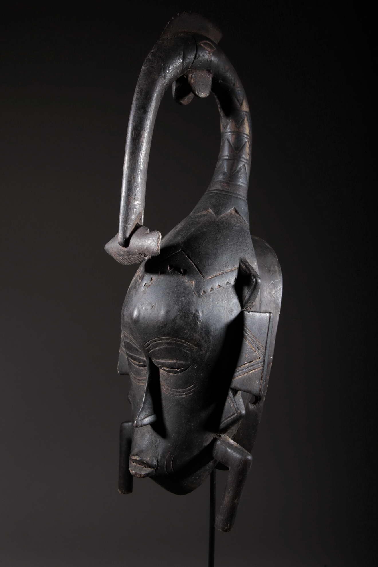 Les Djimini, comme les Tagouana, sont des Mandé du nord de la Côte d’Ivoire. Lors des conquêtes de Samory, ils payèrent un lourd tribut pour n’avoir pas voulu traiter avec lui. Colonisés par la France au XIXe siècle, ils ont adopté la religion importée. Pour ces deux raisons, les masques et la statuaire ont grandement disparu chez ces deux peuples. Cependant, quelques rares masques et statues dont on avait la certitude qu’ils étaient les représentations de bons génies furent conservés. On remarque la patine noire et épaisse à la surface de ce masque ci-dessus. Cela est dû à l’art des Djimini lesquels maîtrisaient les vernissages des poteries en se servant de résines d’arbres, des techniques qu’ils ont répliqué sur la surface des masques. Quant à l’usage de l’objet, on en a oublié l’exactitude. Il reste toutefois porté durant les mascarades au cours des cérémonies rituelles.
