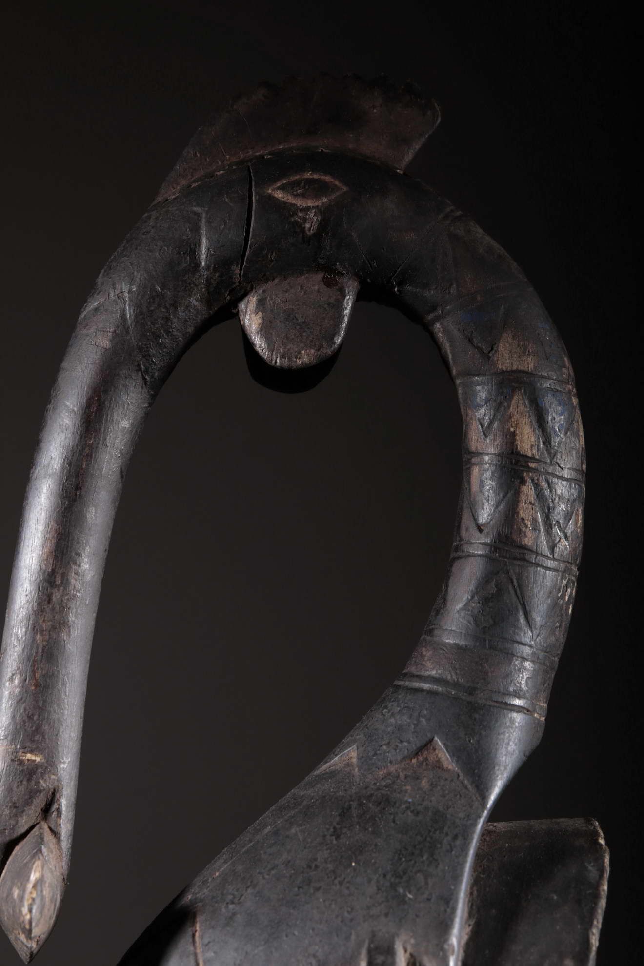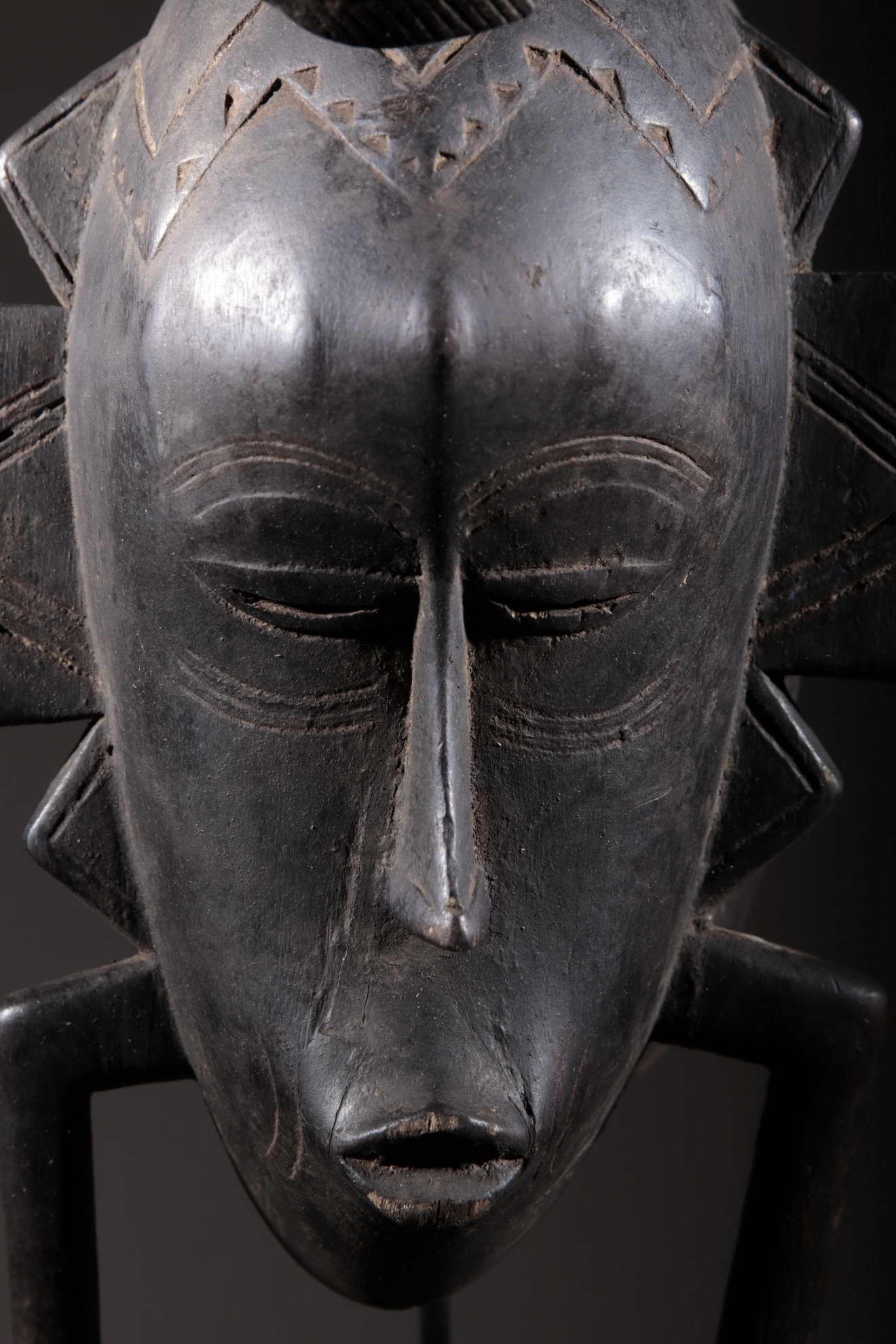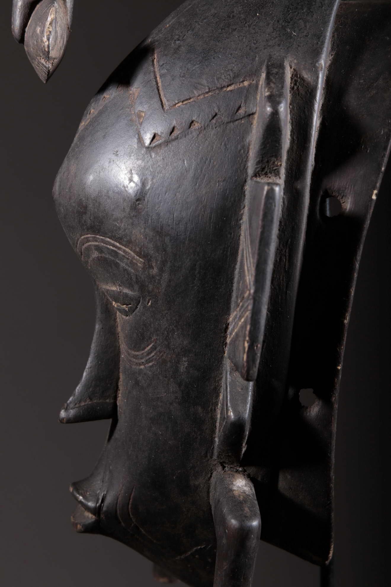 Les Djimini, comme les Tagouana, sont des Mandé du nord de la Côte d’Ivoire. Lors des conquêtes de Samory, ils payèrent un lourd tribut pour n’avoir pas voulu traiter avec lui. Colonisés par la France au XIXe siècle, ils ont adopté la religion importée. Pour ces deux raisons, les masques et la statuaire ont grandement disparu chez ces deux peuples. Cependant, quelques rares masques et statues dont on avait la certitude qu’ils étaient les représentations de bons génies furent conservés. On remarque la patine noire et épaisse à la surface de ce masque ci-dessus. Cela est dû à l’art des Djimini lesquels maîtrisaient les vernissages des poteries en se servant de résines d’arbres, des techniques qu’ils ont répliqué sur la surface des masques. Quant à l’usage de l’objet, on en a oublié l’exactitude. Il reste toutefois porté durant les mascarades au cours des cérémonies rituelles.