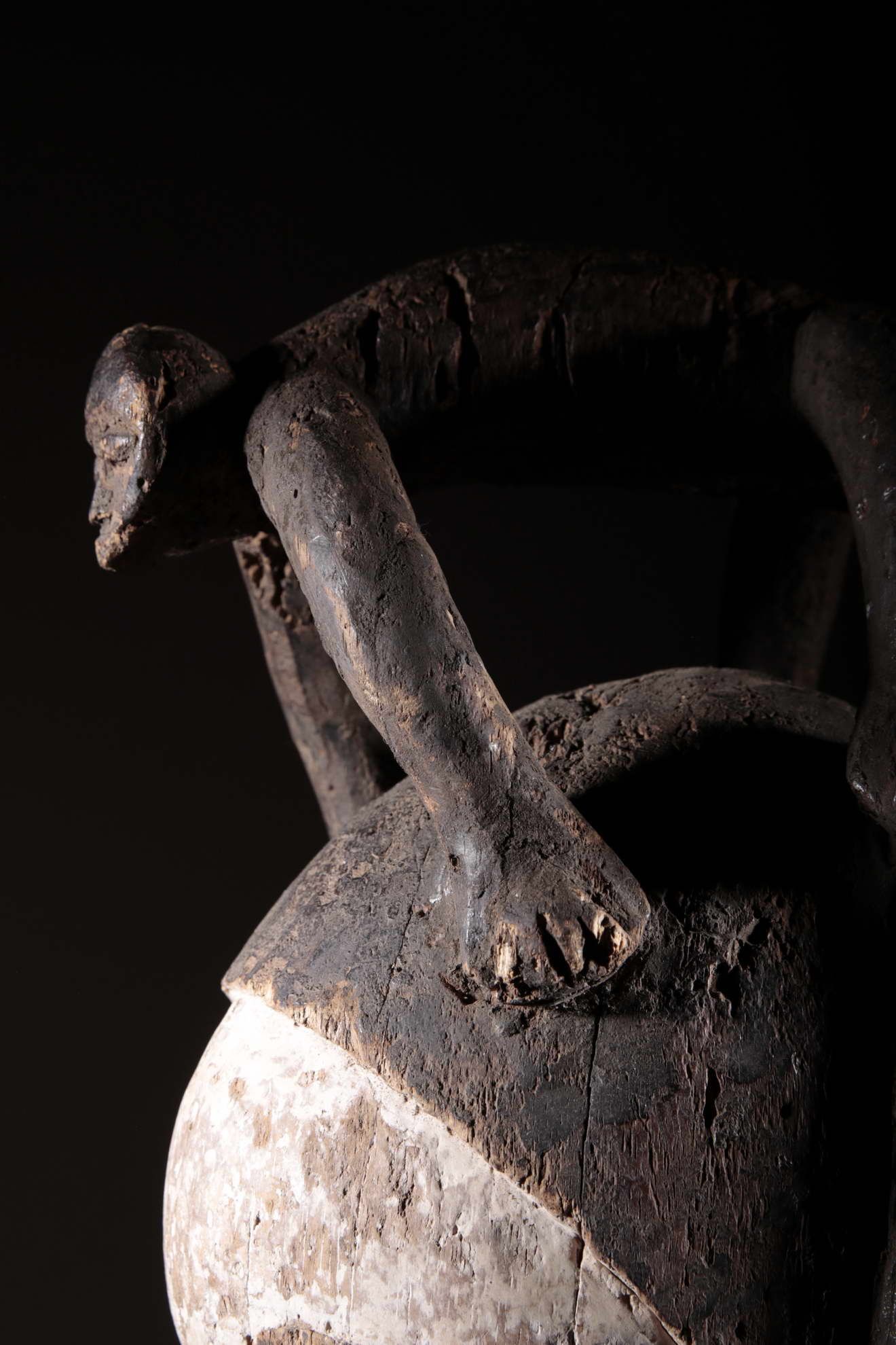 Ce type de masque était utilisé par la société masculine Ngil qui n'existe plus de nos jours. Cette société secrète était chargée des initiations et elle luttait contre la sorcellerie. Le Ngil est un rite du feu purificateur symbolisé par le gorille. Les porteurs de ces masques faisaient leur apparition la nuit dans les villages, éclairés par des torches, et étaient toujours en grand nombre. La face est couverte de kaolin (la couleur blanche évoque le pouvoir des ancêtres). Ce type de masque blanc incarne donc l'esprit d'un défunt. Il avait aussi une fonction judiciaire et désignait les coupables des mauvaises actions au sein du village : cela donnait ensuite lieu à des meurtres rituels. Les autorités coloniales françaises interdirent ce type de masque vers 1910. Les fentes des yeux sont à peine marquées et sont peu ouvertes. La voix du porteur du masque ne devait pas être identifiée ; le fait qu'il n'y ait pas de percée pour la bouche contribue à déformer la voix de celui qui danse le masque. Le ngil était selon l'ethnologue Philippe Laburthe-Tolra, la forme locale de l'inquisition, avec ses menaces et ses atrocités pour arracher des aveux par des tortures cruelles, dans un cadre terrifiant, à tous les malheureux suspects de sorcellerie. Si le ngil, auquel ont été attribués tous les masques fang au visage blanc étiré, est mentionné par différents auteurs avant sa disparition vers 1910, aucun n'évoque très clairement les grands masques, qui n'ont en fait jamais été vus in situ par les occidentaux. Comparés aux figures de reliquaire du biéri, les grands masques blancs sont très peu nombreux. En dépit du manque d'informations ethnographiques, il est possible de commenter deux aspects singuliers des grands masques passés au kaolin. L'un tient à leur blancheur, l'autre au visage très étiré. Le blanc étant la couleur du deuil et de la mort chez les Fang et les populations de cette région, ce trait peut être rapproché de la fonction inquisitoriale du ngil, qui non seulement traquait et torturait ceux qu'il soupçonnait de sorcellerie, mais pouvait également les exécuter. De plus, lorsque le responsable du Ngil opérait, il s'enduisait le corps de kaolin. Le visage longiligne peut être opposé à celui des figures de reliquaire. Ces dernières ont souvent une tête ronde qui évoque celle d'un petit enfant.