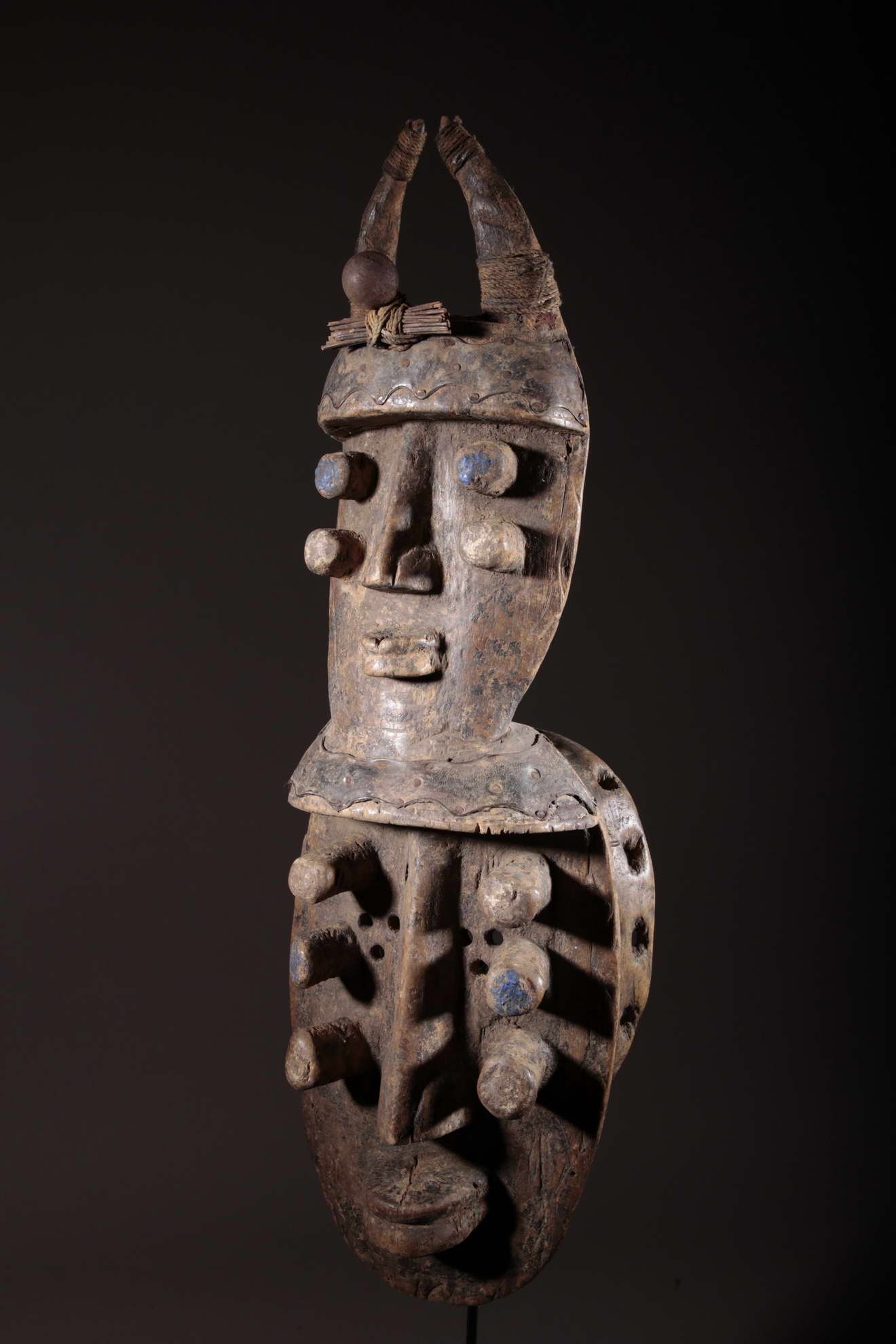 Les masques masculins aux formes géométriques sont souvent reconnaissables à leur long nez encadré par une, deux ou plusieurs paires d'yeux protubérants de forme tubulaire, d'allure parfois menaçante. Les traits des masques féminins sont plus doux, plus harmonieux et plus sereins.