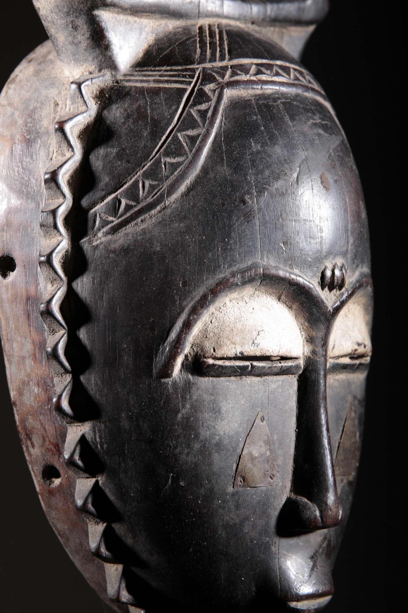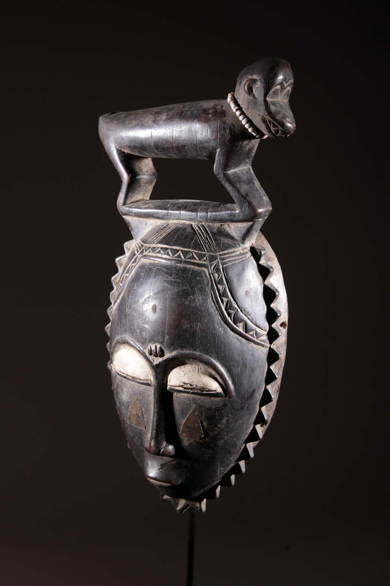 Les Yaouré sont divisés en trois groupes principaux rassemblant chacun une vingtaine de villages. Chaque village est dirigé par un chef, assisté par un conseil des anciens. La langue, la religion, la culture et l'art yaouré sont influencés par leurs puissants voisins les Baoulé et les Gouro. Cependant, ils possèdent un grand sens identitaire et ont créé un art caractéristique et rafiné.Chez les Yohouré ou Yaouré, les masques africains servent à influencer les forces surnaturelles 'YU' responsables des maux des hommes mais aussi de leur prospérité. Les masques dans cette ethnie sont interdits aux femmes, ils sont dansés le plus souvent pour rétablir le déséquilibre social et politique que peut entrainer le décès. Les Yohourés ont influencé les Baoulés en ce qui concerne l'esthétique des masques et ont été eux-mêmes influencés par le style Gouro. Sur ce masque le nez et la chevelure rappellent les masques Gu des Gouro. La chevelure est disposée en trois demi-cercles très travaillés : cela est le signe chez les Yohouré de pouvoir et de richesse*. Les masques de cette ethnie dégagent une sérénité, une douceur qui sont dûs à des conditions de vie relativement clémentes (climat et agriculture favorisés par la région lagunaire boisée qu'ils occupent). Les masques Yohouré sont souvent entourés d'une bordure dentelée caractéristique qui structure le masque et souligne l'harmonie générale des formes.
