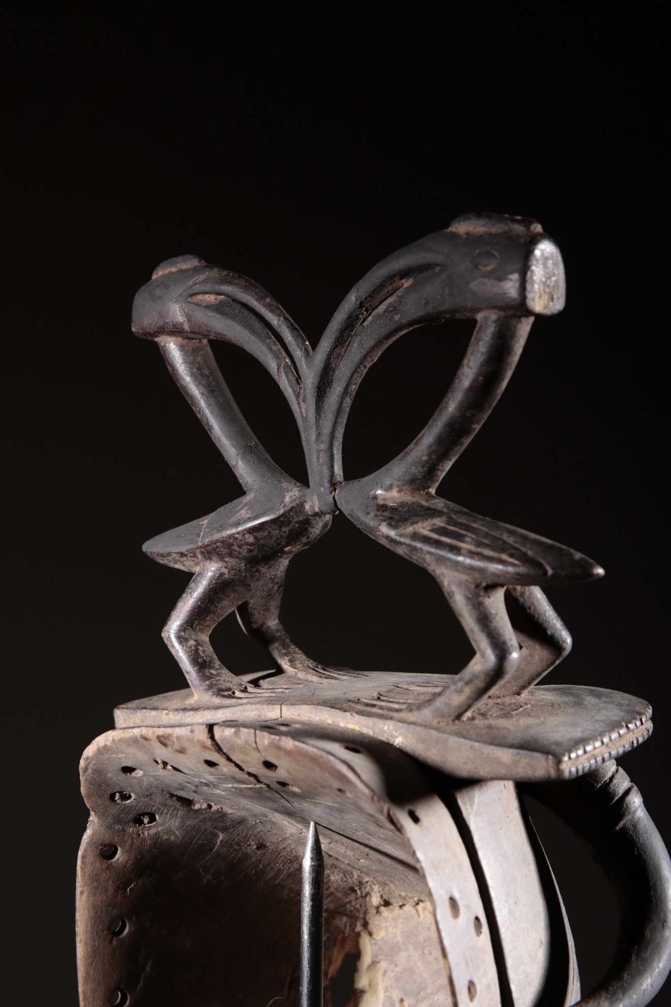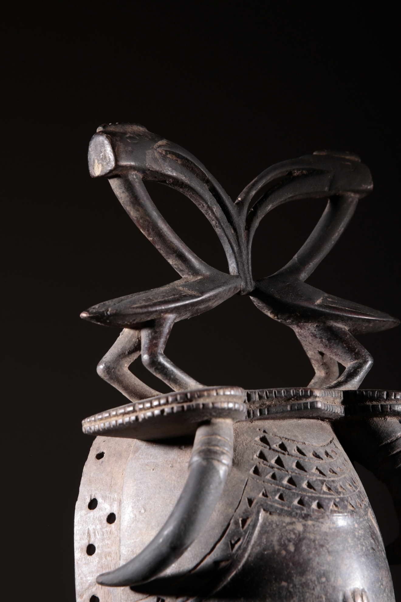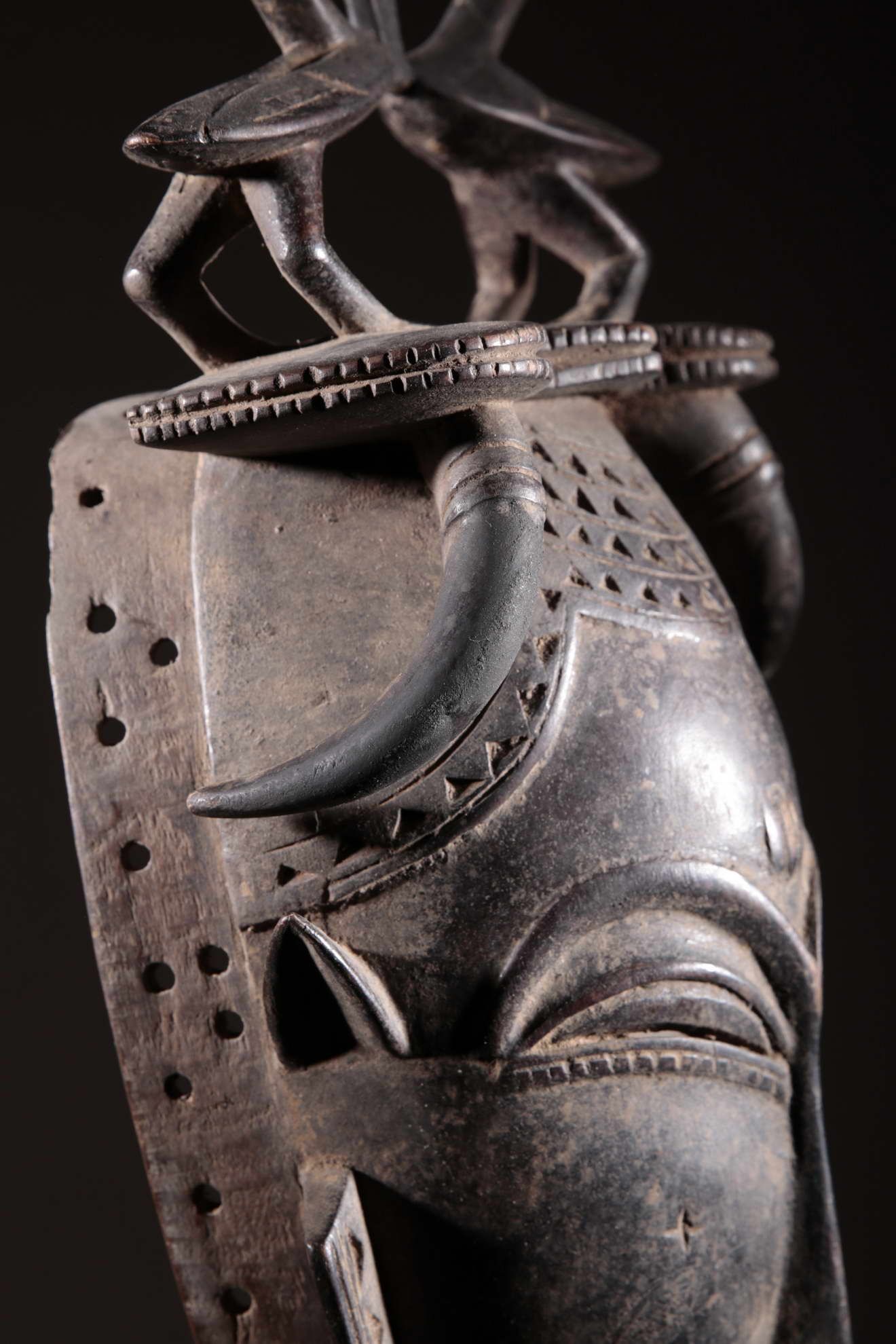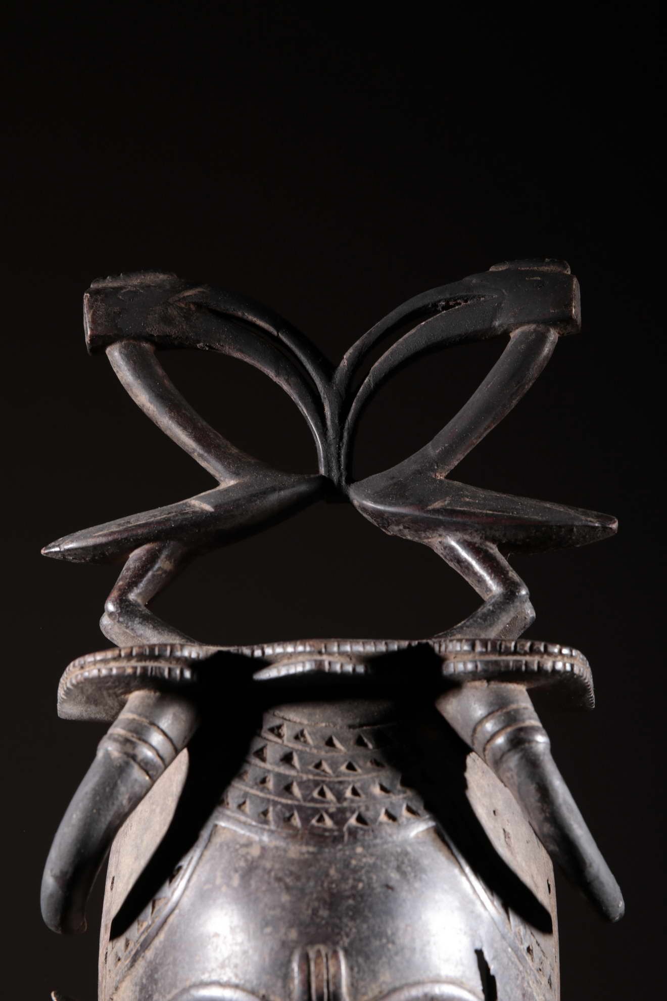 Les Yaouré sont divisés en trois groupes principaux rassemblant chacun une vingtaine de villages. Chaque village est dirigé par un chef, assisté par un conseil des anciens. La langue, la religion, la culture et l'art yaouré sont influencés par leurs puissants voisins les Baoulé et les Gouro. Cependant, ils possèdent un grand sens identitaire et ont créé un art caractéristique et rafiné.Chez les Yohouré ou Yaouré, les masques africains servent à influencer les forces surnaturelles 'YU' responsables des maux des hommes mais aussi de leur prospérité. Les masques dans cette ethnie sont interdits aux femmes, ils sont dansés le plus souvent pour rétablir le déséquilibre social et politique que peut entrainer le décès. Les Yohourés ont influencé les Baoulés en ce qui concerne l'esthétique des masques et ont été eux-mêmes influencés par le style Gouro. Sur ce masque le nez et la chevelure rappellent les masques Gu des Gouro. La chevelure est disposée en trois demi-cercles très travaillés : cela est le signe chez les Yohouré de pouvoir et de richesse*. Les masques de cette ethnie dégagent une sérénité, une douceur qui sont dûs à des conditions de vie relativement clémentes (climat et agriculture favorisés par la région lagunaire boisée qu'ils occupent). Les masques Yohouré sont souvent entourés d'une bordure dentelée caractéristique qui structure le masque et souligne l'harmonie générale des formes.